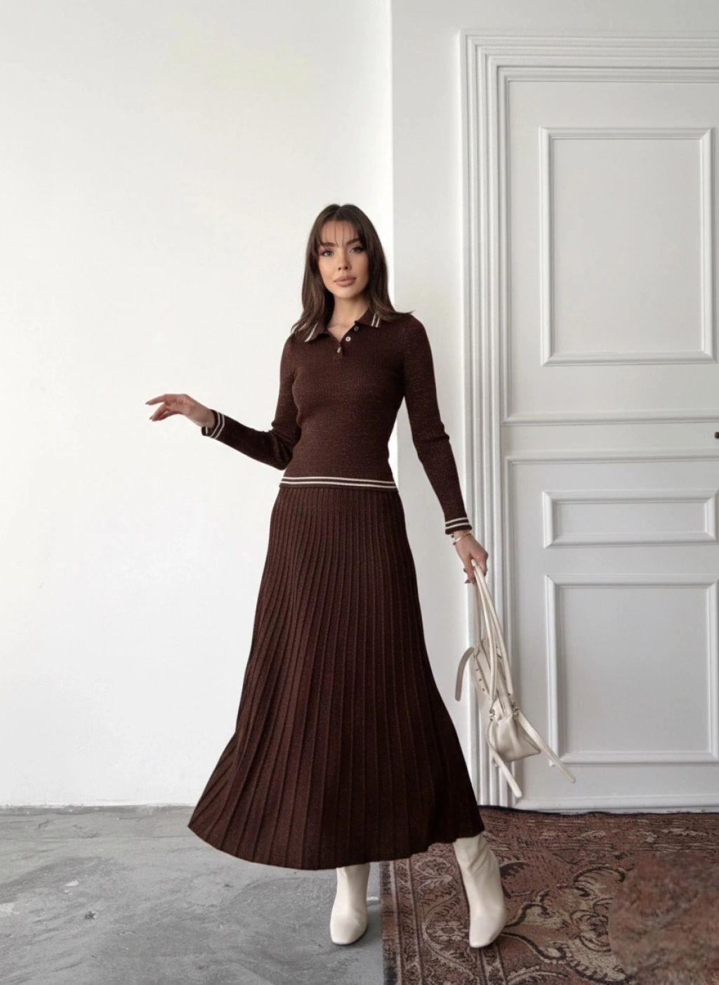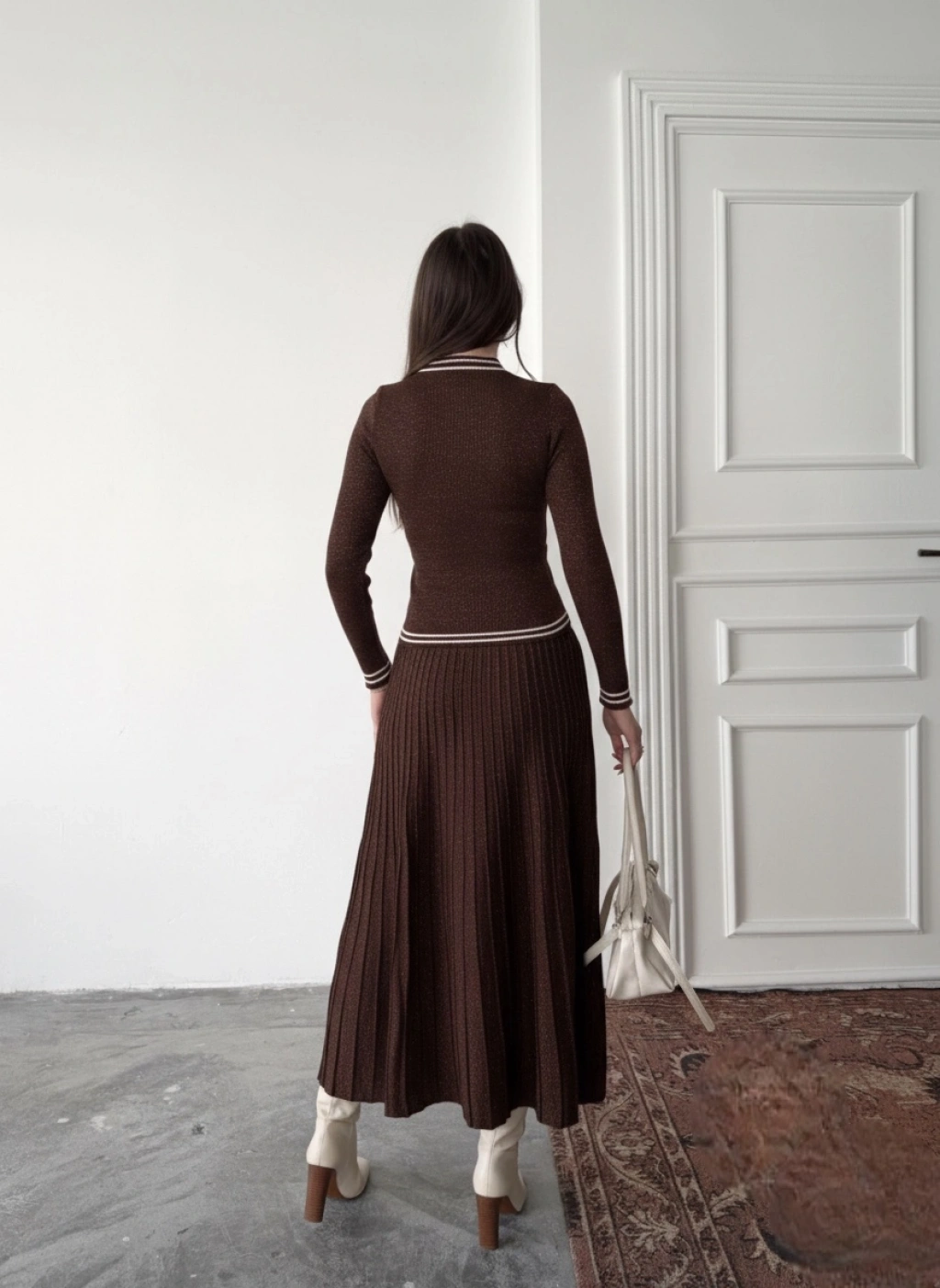 Kadın Kahverengi Simli Şık Şeritli Bluz Etek Alt Üst İkili Premium Triko Takım
