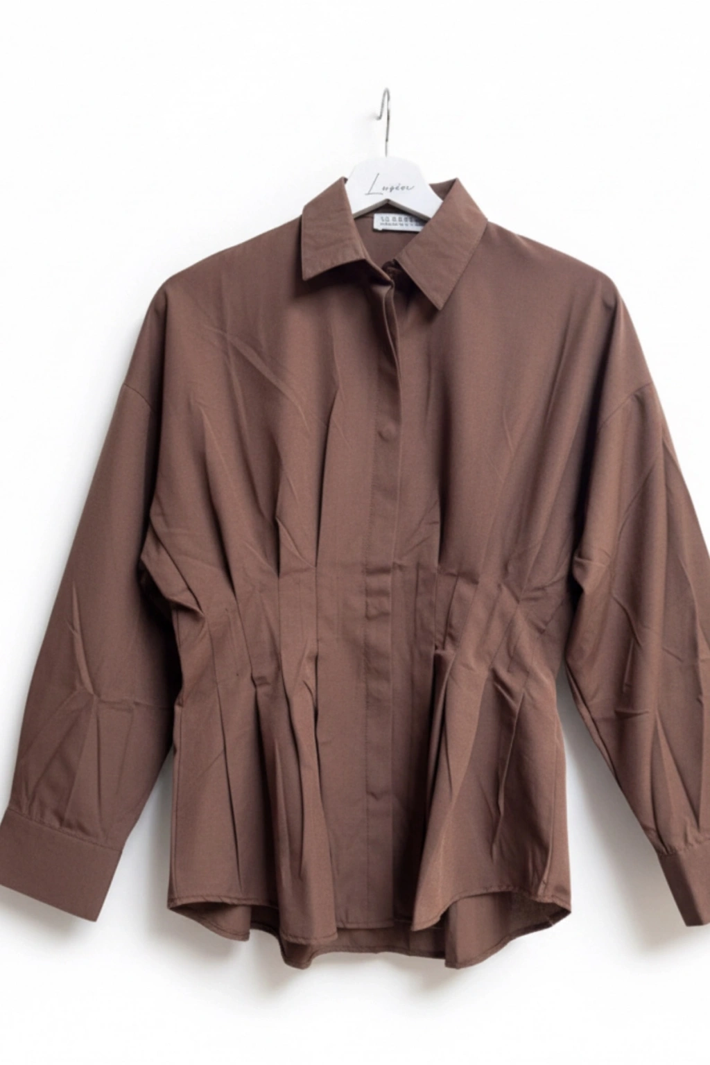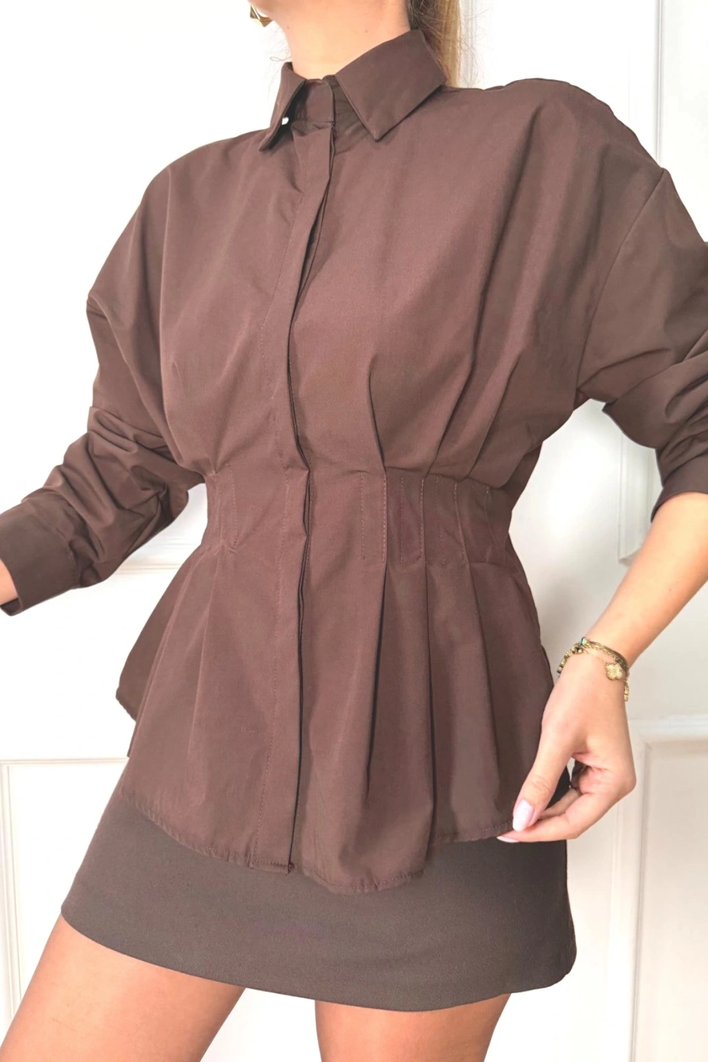 Kadın Kahverengi Şık Belden Oturmalı Pensli Uzun Kol Gömlek