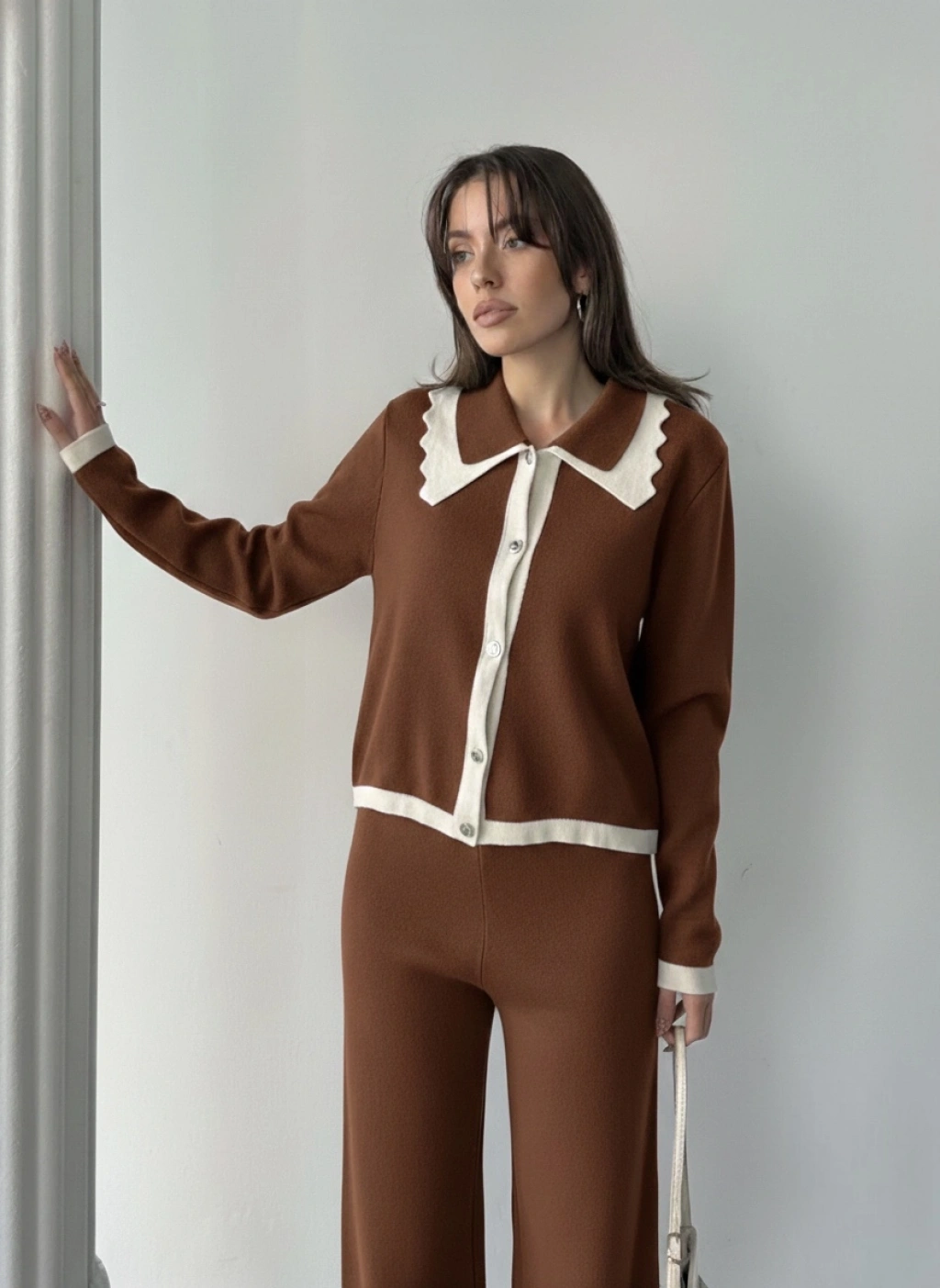 Kadın Kahverengi Yaka Detaylı Alt Üst Şık Triko Takım