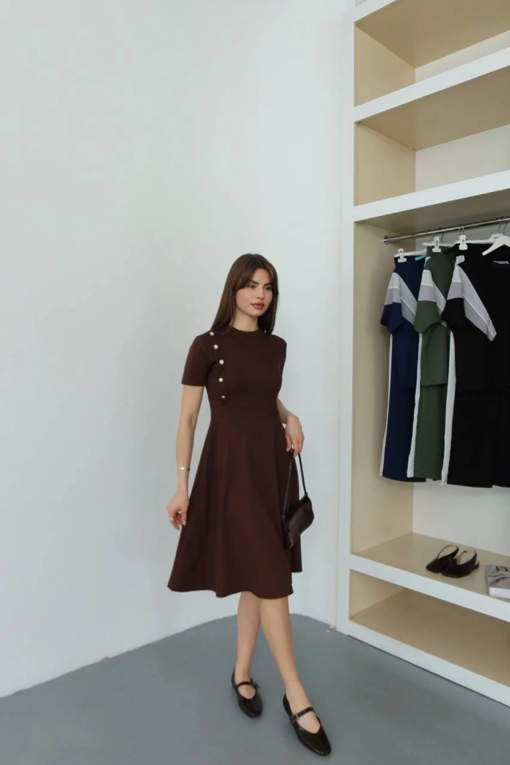 Kadın Kahverengi Yan Düğme Detaylı Bisiklet Yaka Kısa Kollu Midi Boy Zarif Çan Etekli Elbise