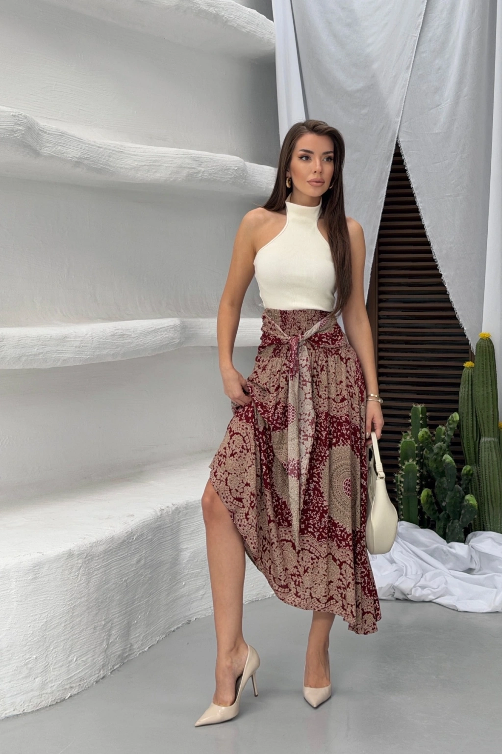 Kadın Bordo Yüksek Bel Bağlama Detaylı Şık Etnik Desenli Asimetrik Kesim Midi Etek
