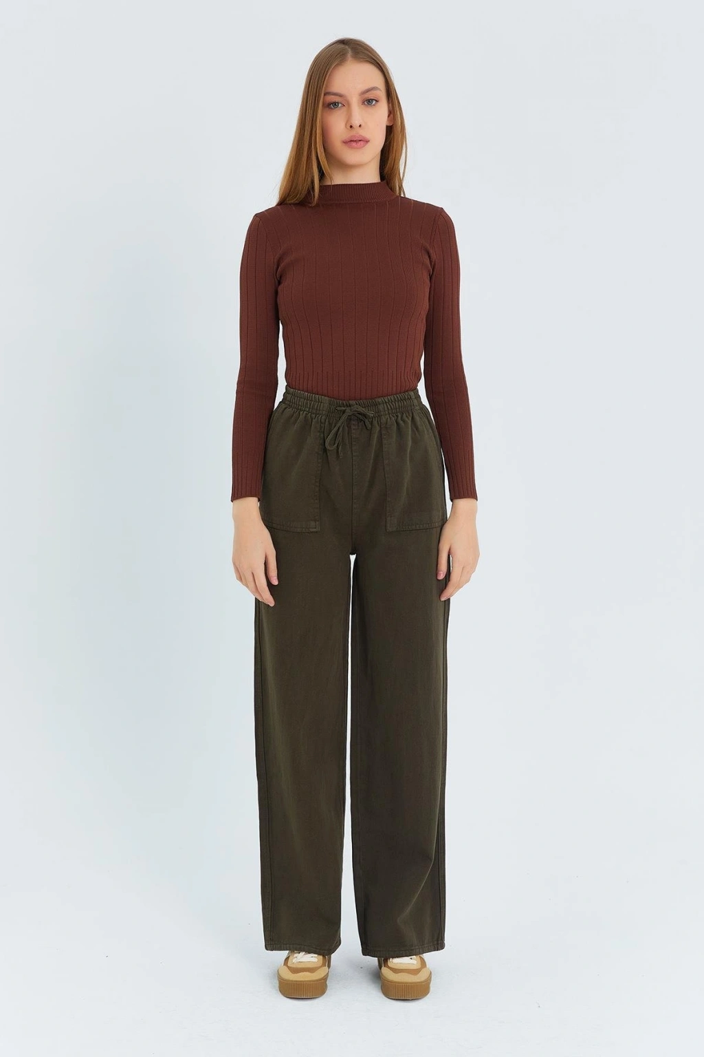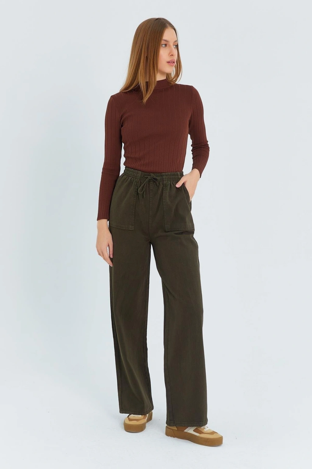 Kadın Haki Yüksek Bel Beli Lastikli Bağcıklı Bol Paça Geniş Kesim Şık Cepli Premium Palazzo Pantolon