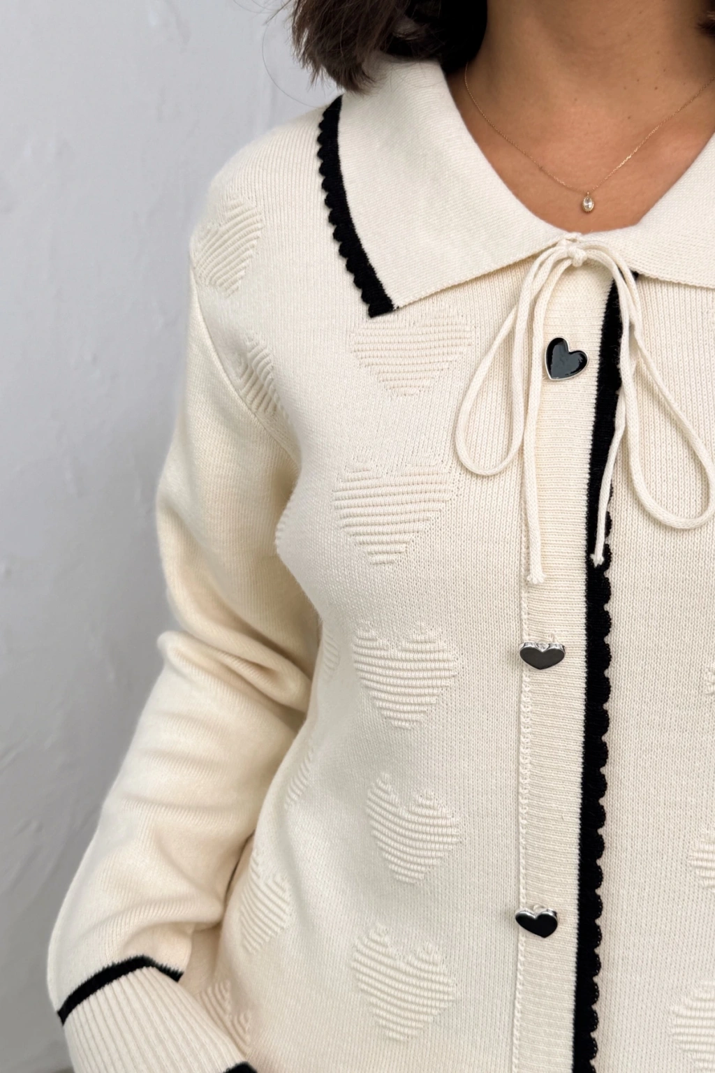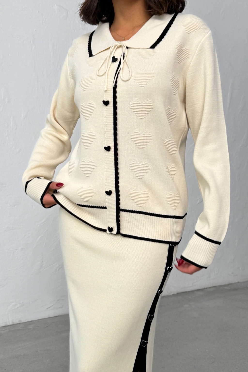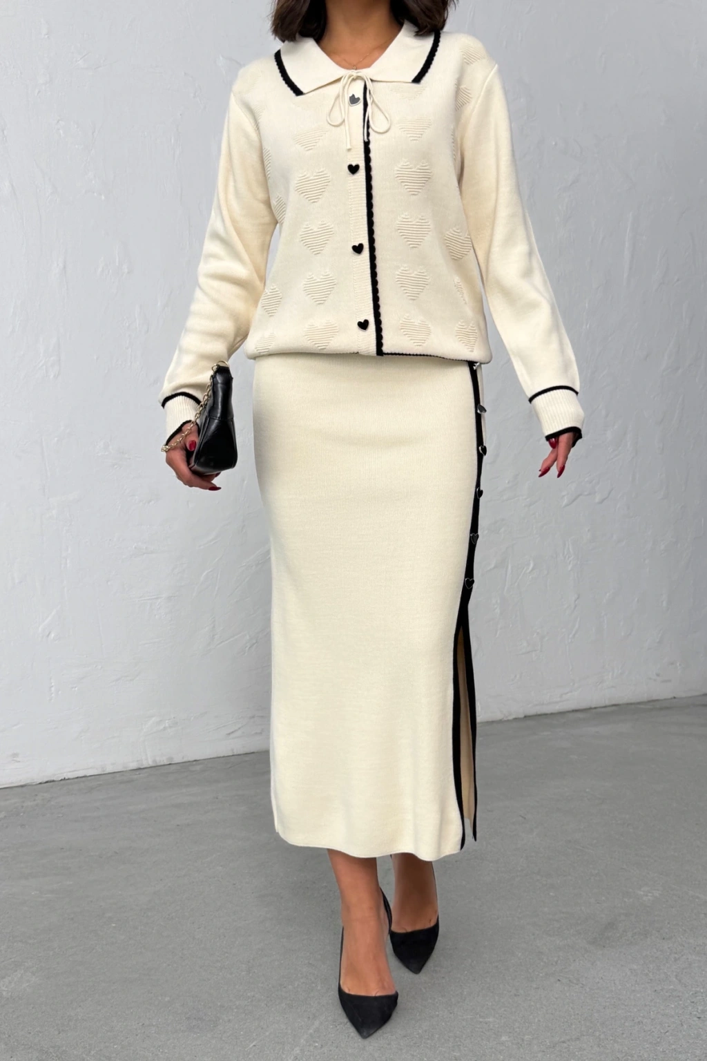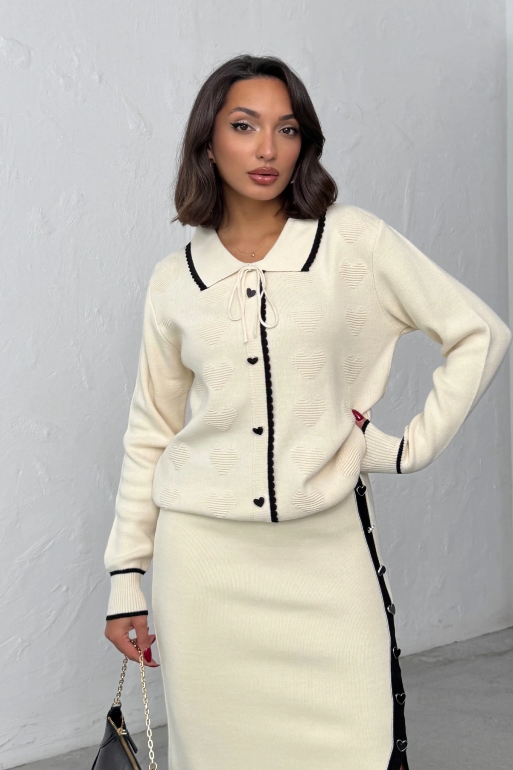 Kadın Kalp Düğme ve Kabartma Detaylı Etek Hırka Alt Üst İkili Zarif Triko Takım - Ekru