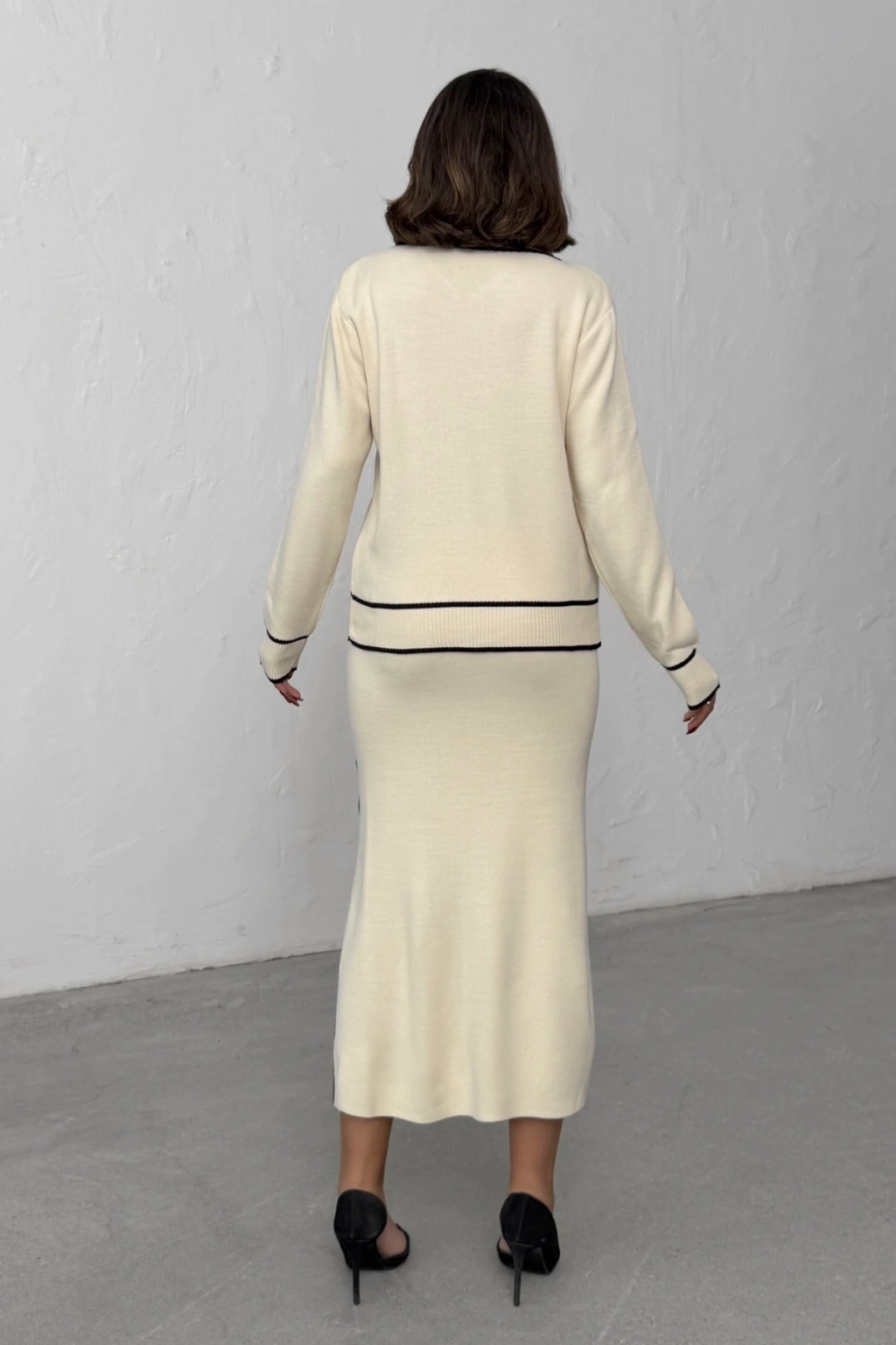Kadın Krem Kol Düğme Detaylı Bluz Etek Alt Üst İkili Triko Takım