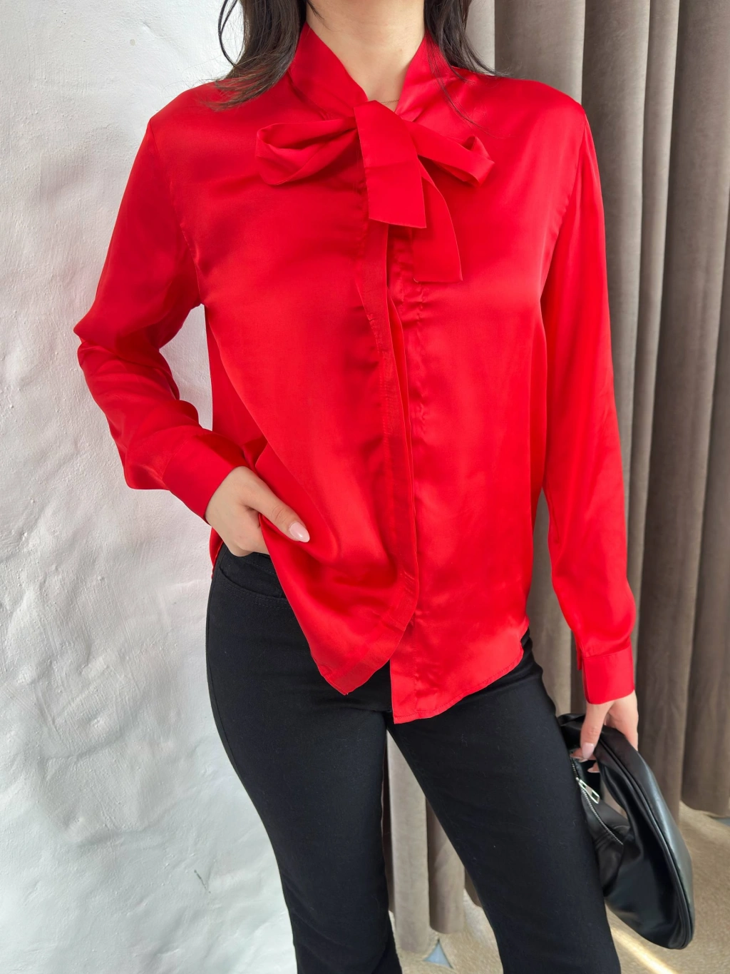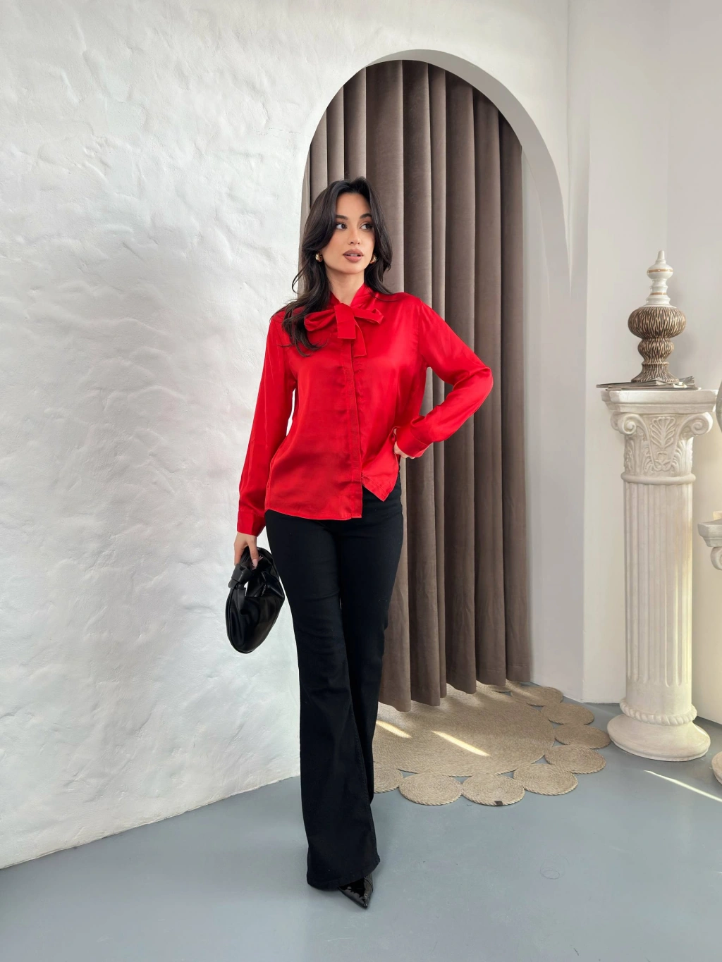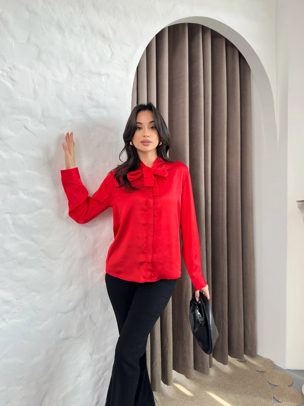 Kadın Kırmızı Fiyonk Yaka Detaylı Uzun Kol Saten Gömlek
