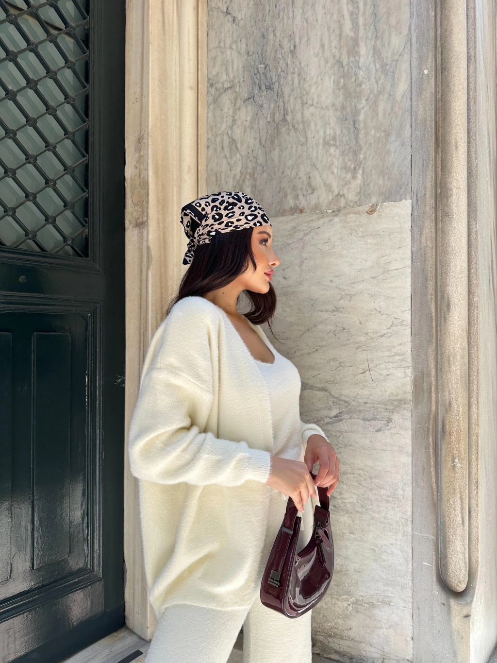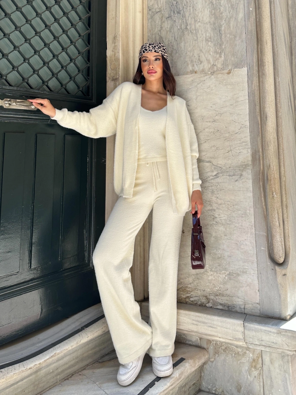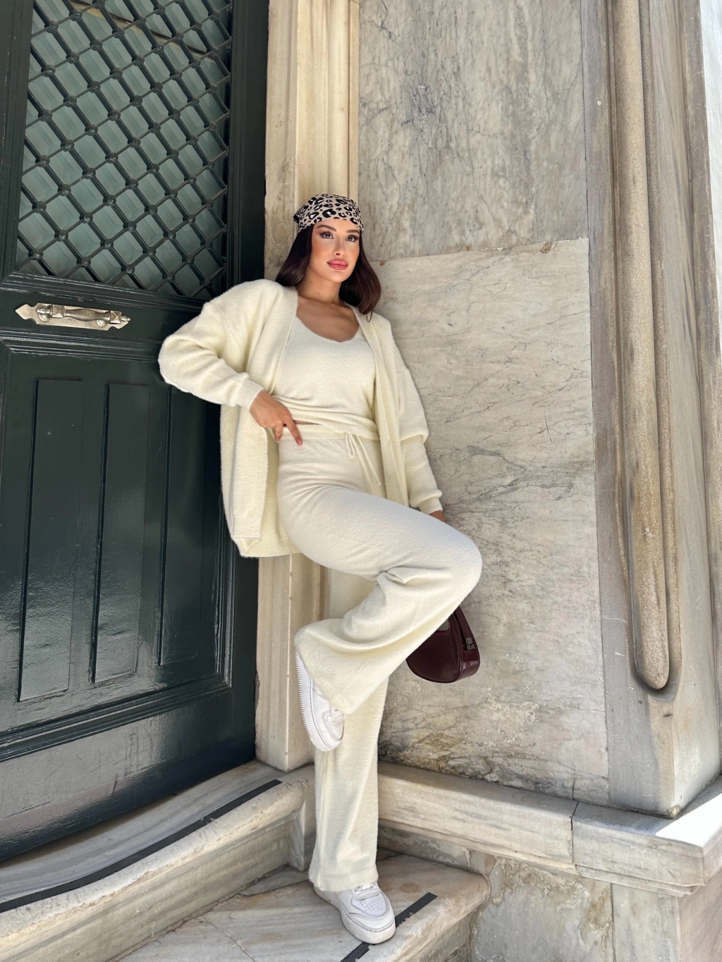 Uzun kollu crop bluz, dökümlü hırka ve yüksek bel triko pantolondan oluşan bu 3'lü takım, kış aylarında hem zarif hem de sıcak kalmanızı sağlar. Siyah rengiyle her parçayla kolayca kombinlenebilir, zamansız bir stil sunar.