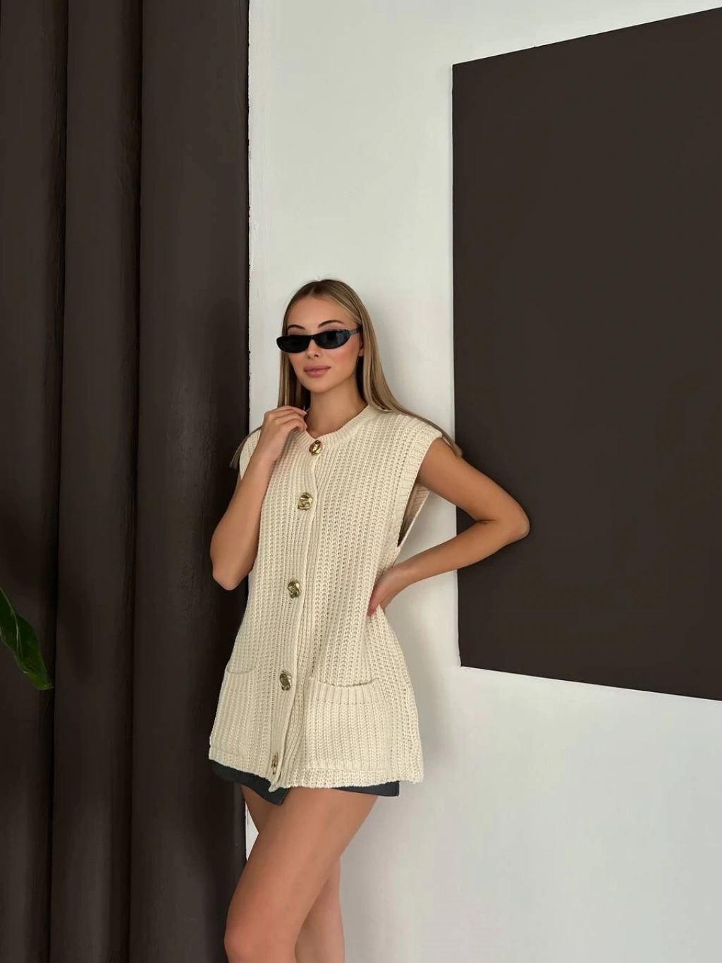 Kadın Krem Gold Düğme ve Cep Detaylı Kolsuz Triko Hırka