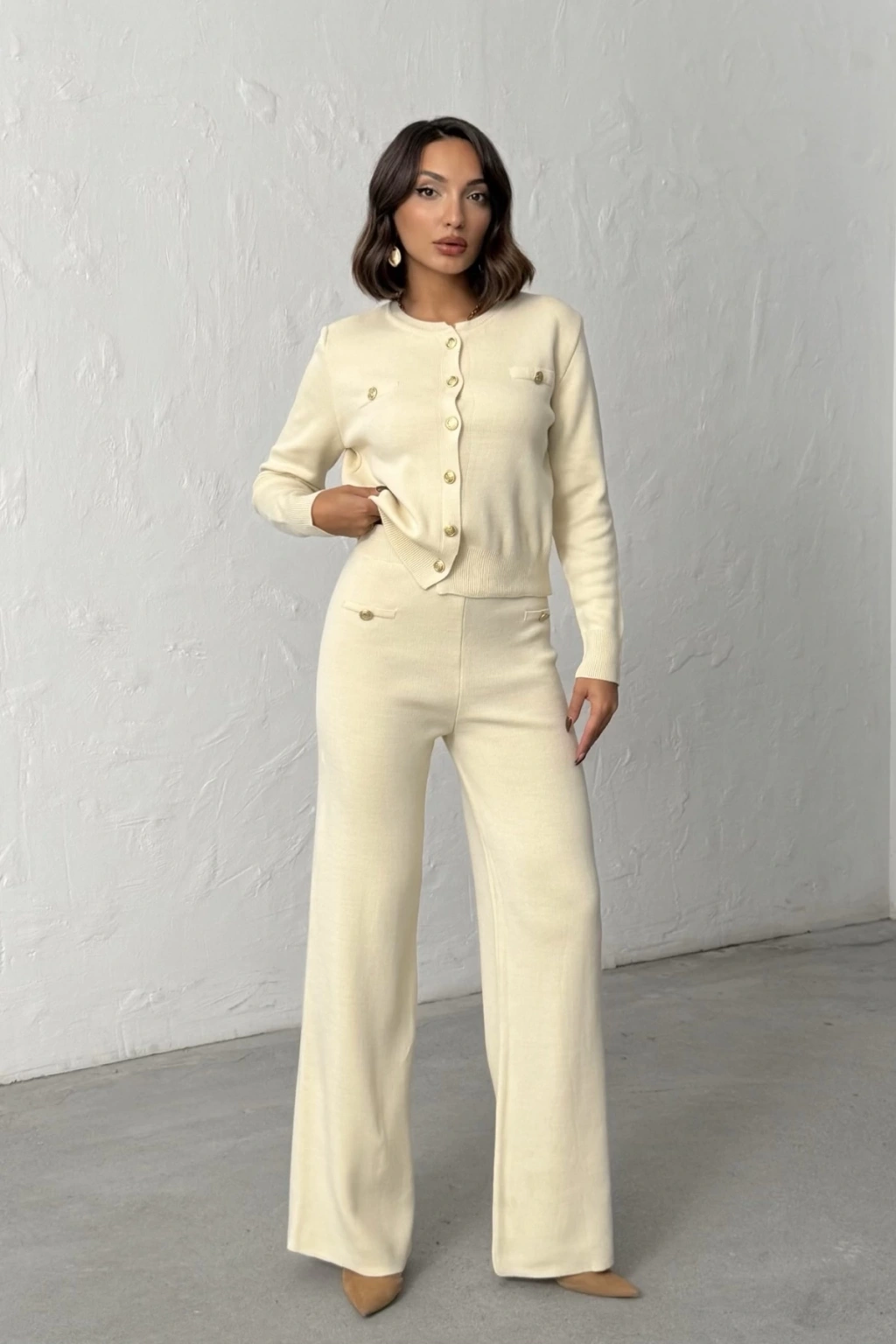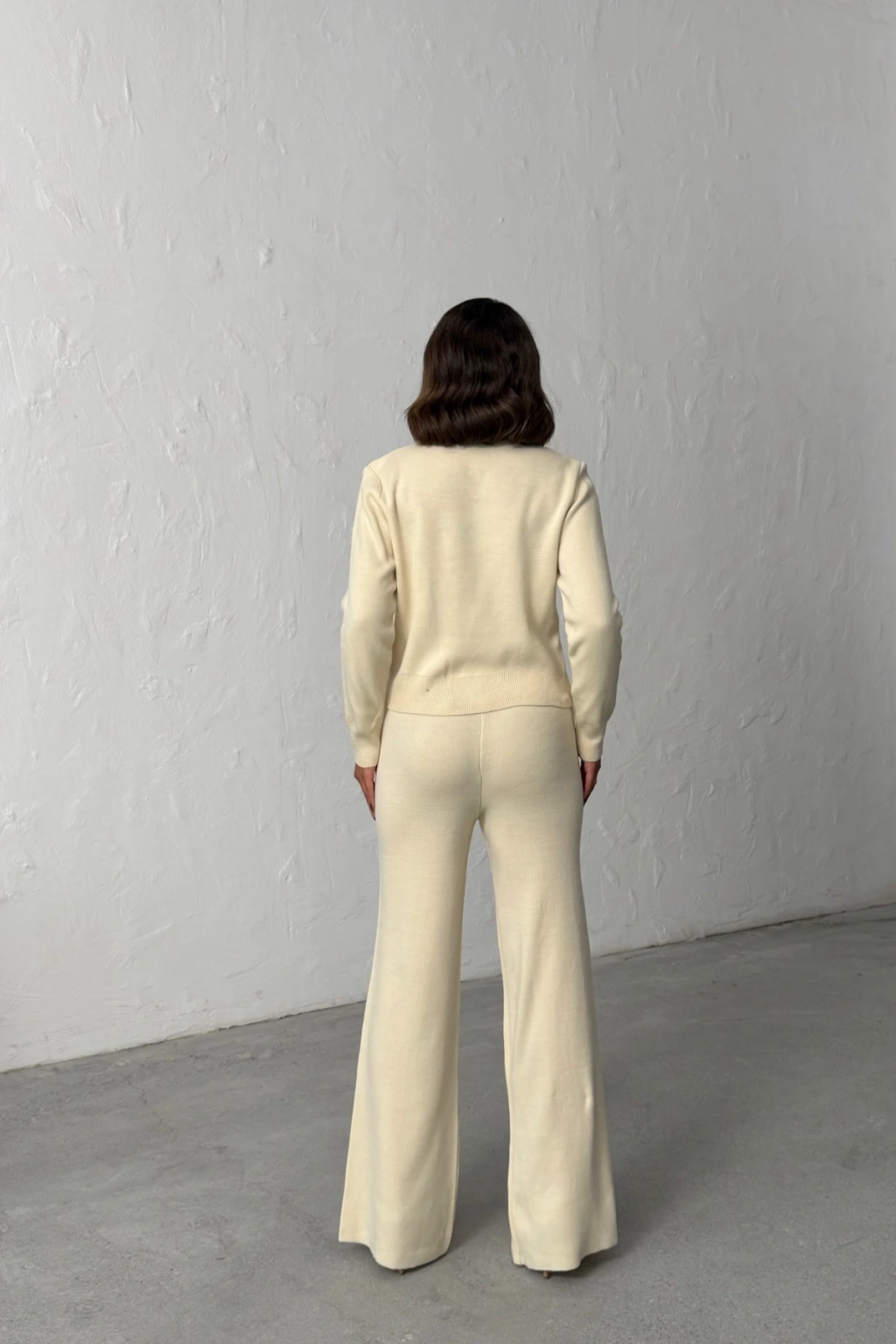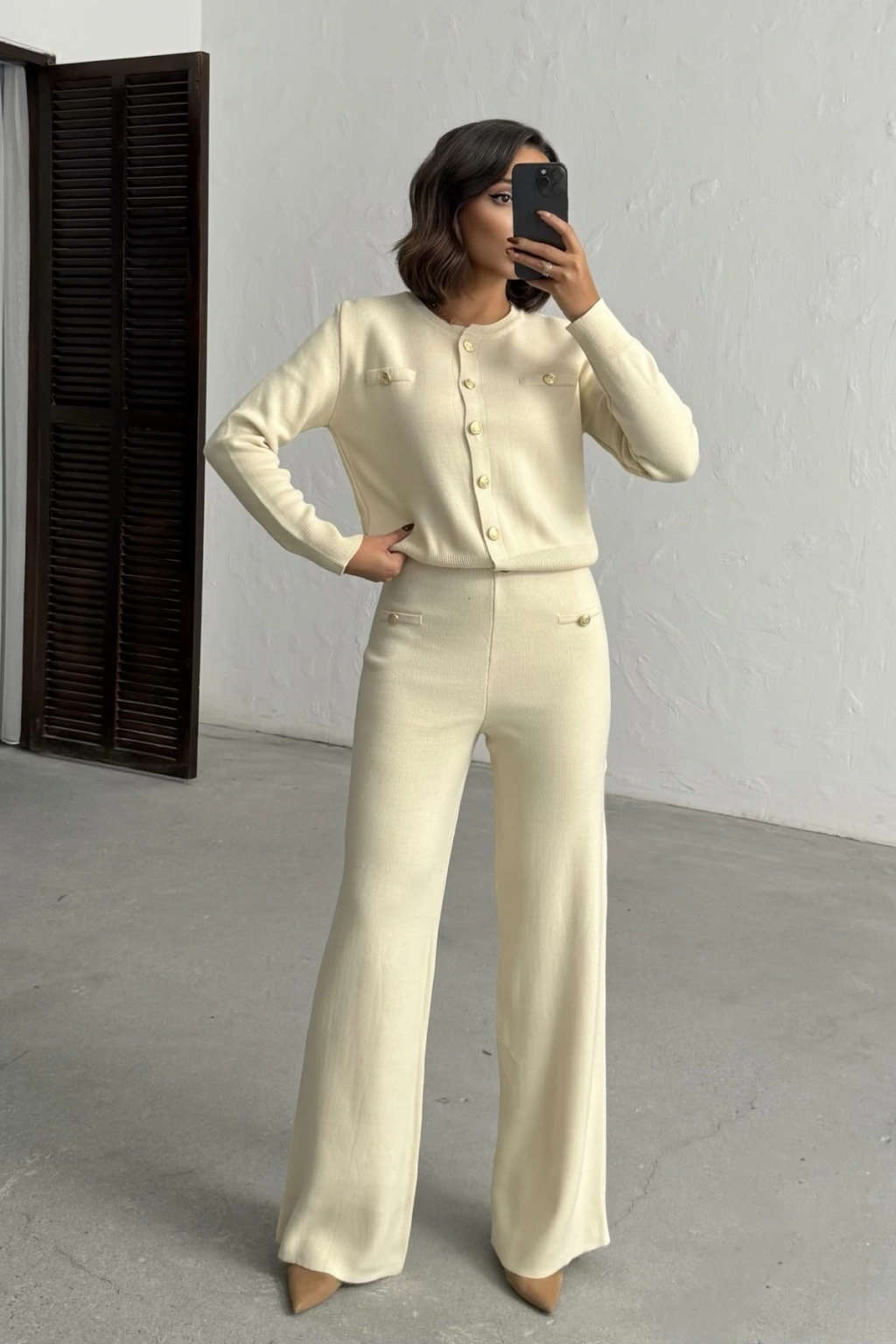 Kadın Krem Hırka Pantolon Alt Üst İkili Triko Takım
