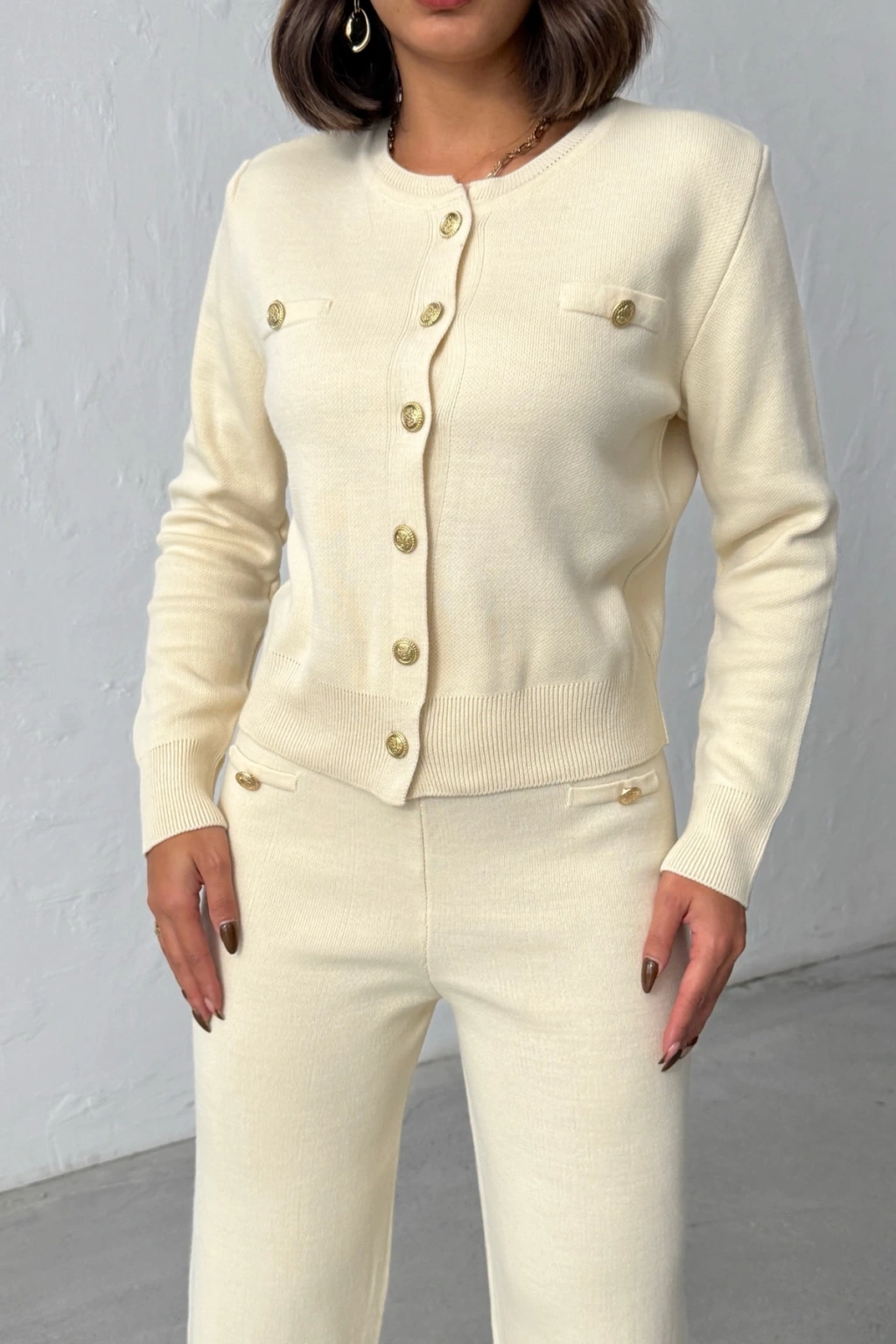 Kadın Ekru Şık İnci Düğme Detaylı Hırka Etek Alt Üst Triko Takım
