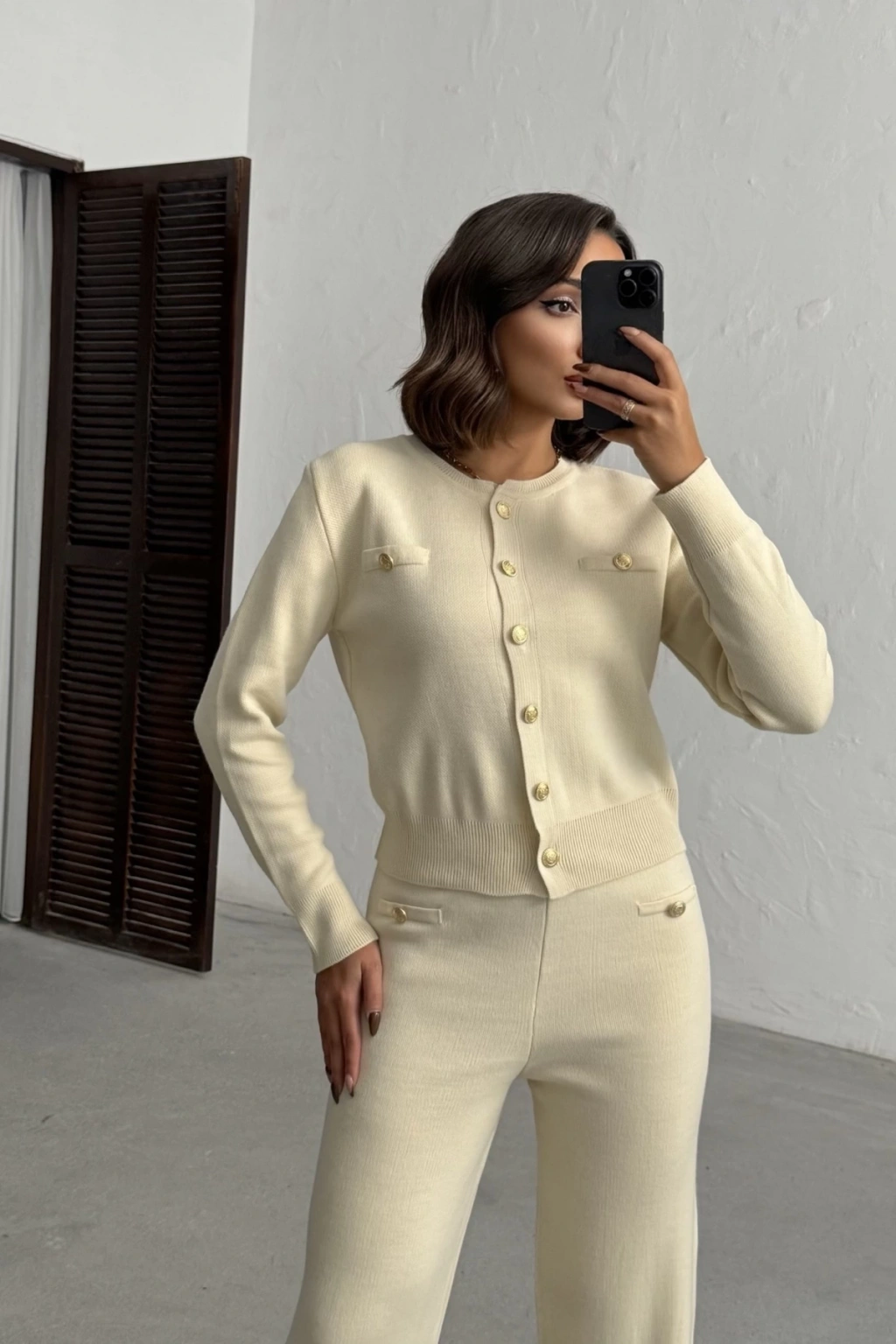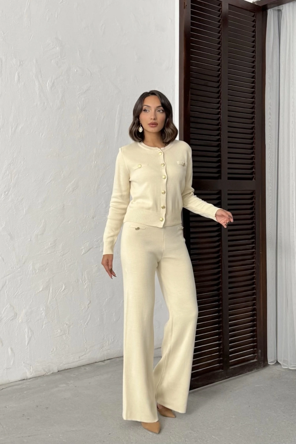Kadın Ekru Şık Yaka Detaylı Düğmeli Bluz Pantolon Alt Üst İkili Triko Takım