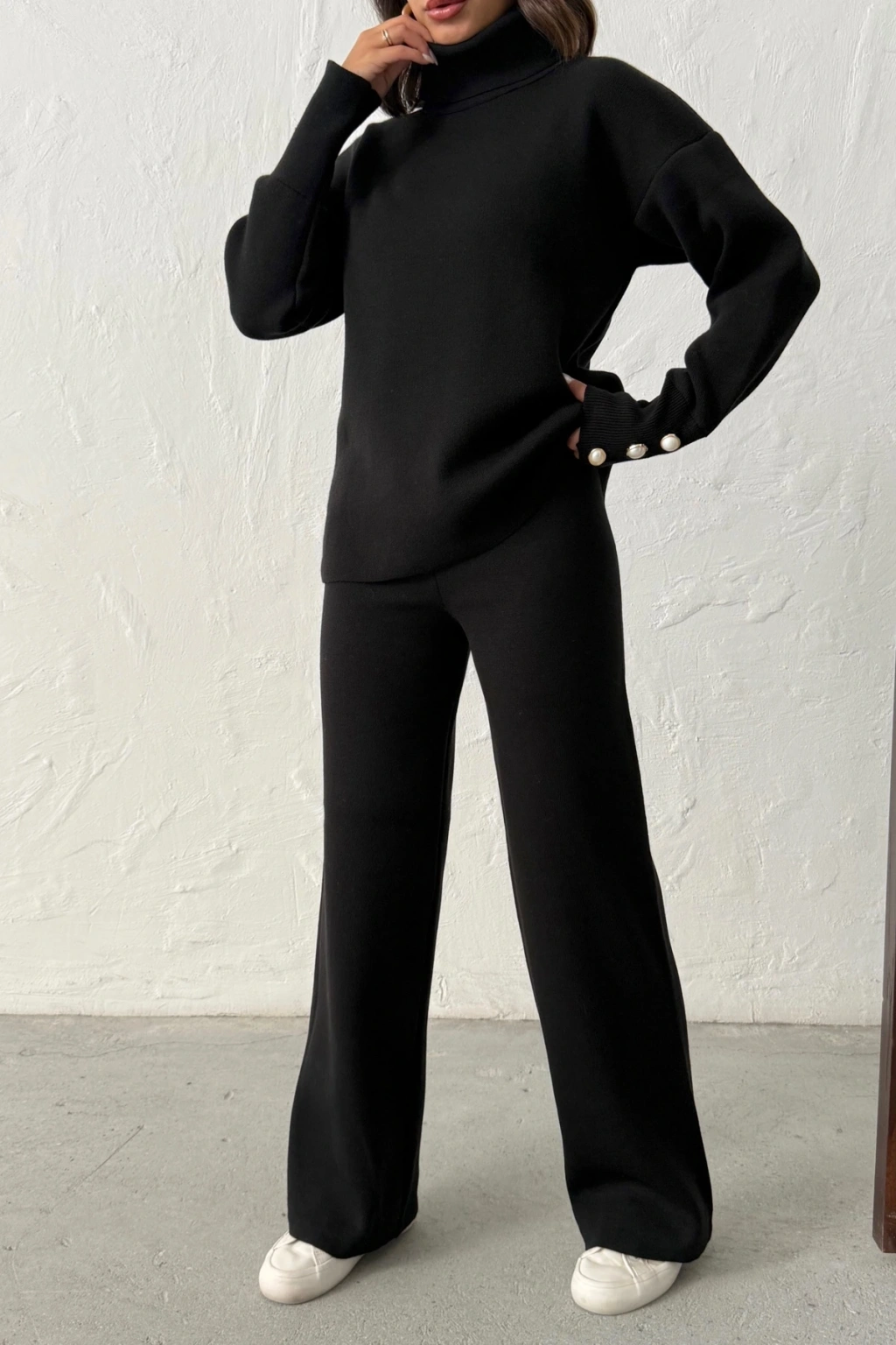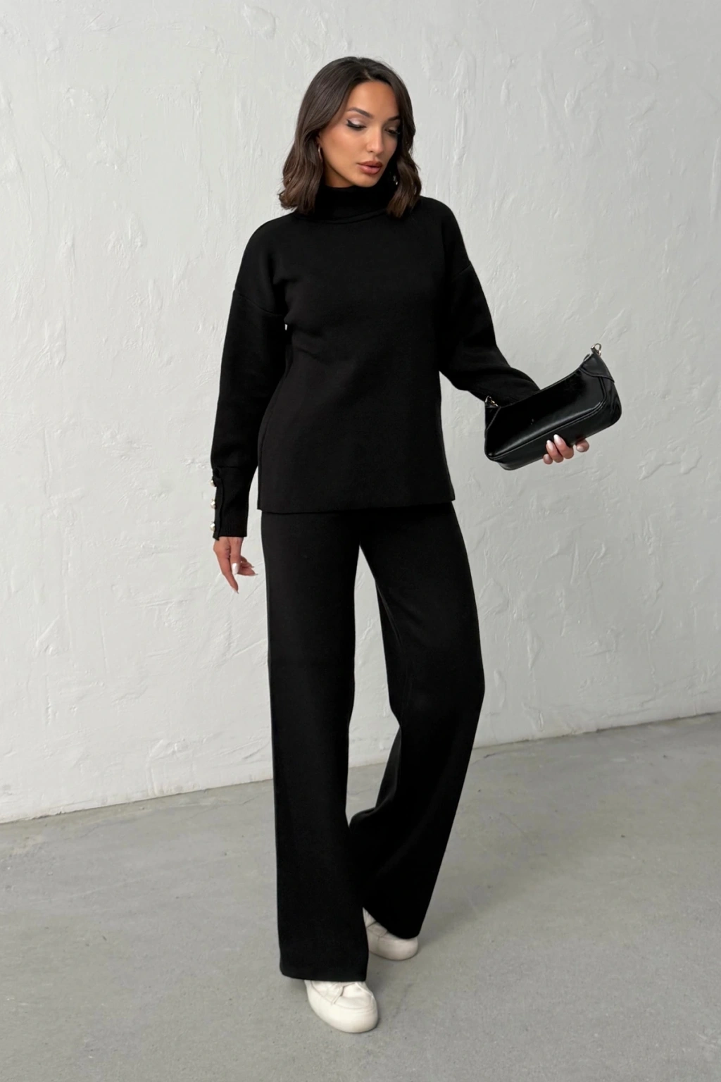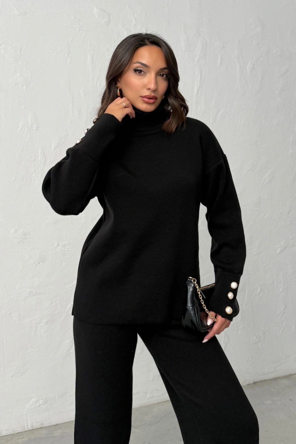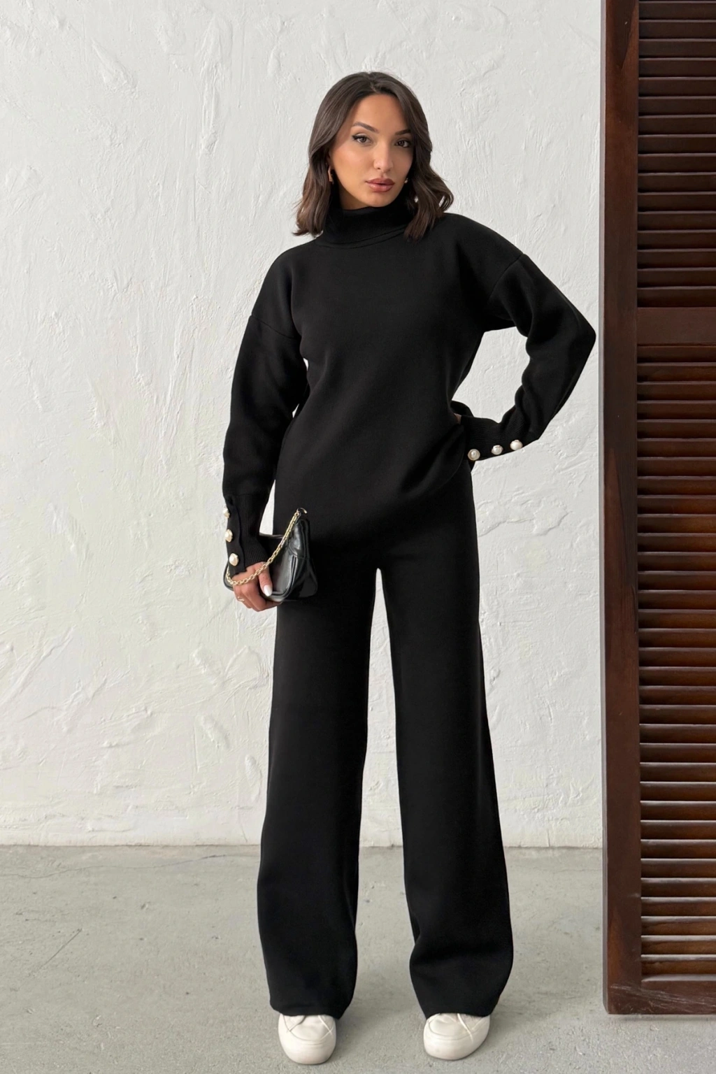Kadın Siyah Kol Düğme Detaylı Bluz Etek Alt Üst İkili Triko Takım