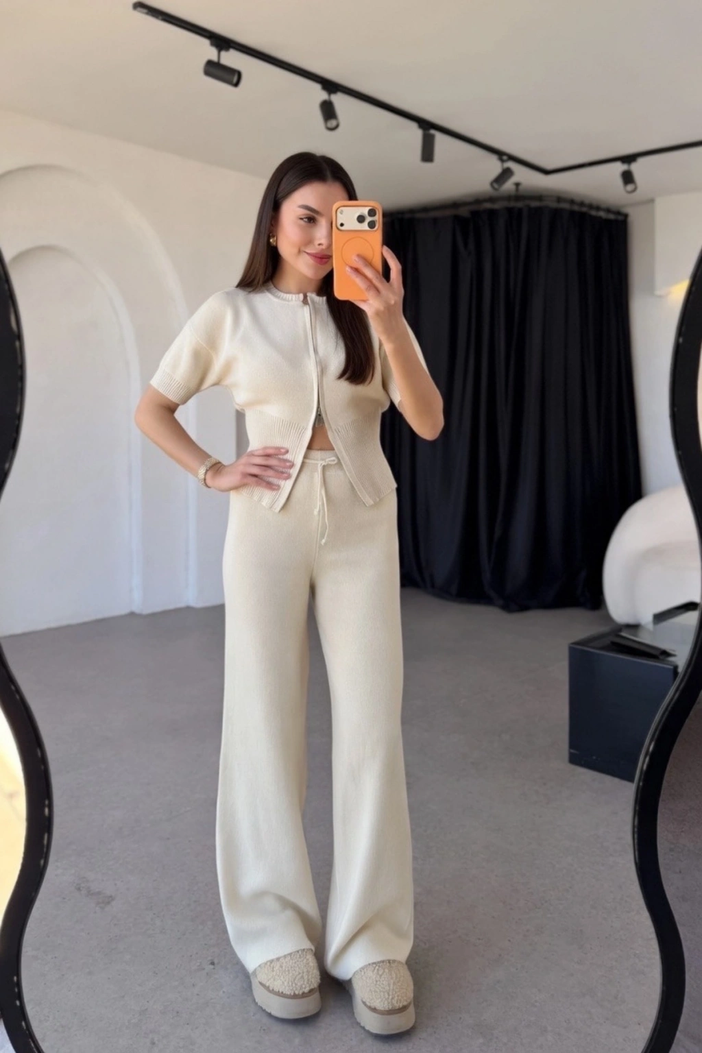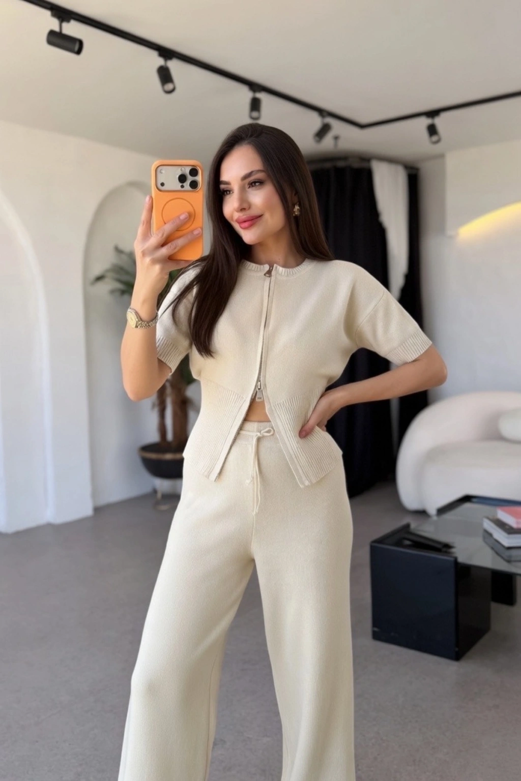 Kadın Krem Yarım Fermuarlı Crop Üst Geniş Paça Pantolon İkili Takım