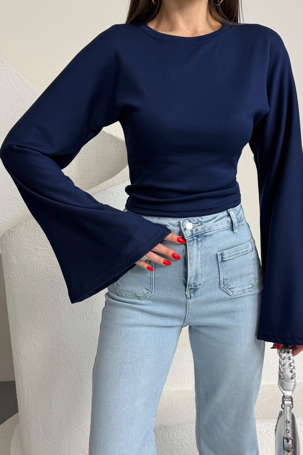 Kadın Lacivert Bisiklet Yaka Uzun İspanyol Kol Yumuşacık Body Bluz