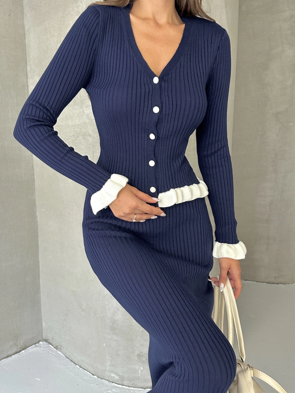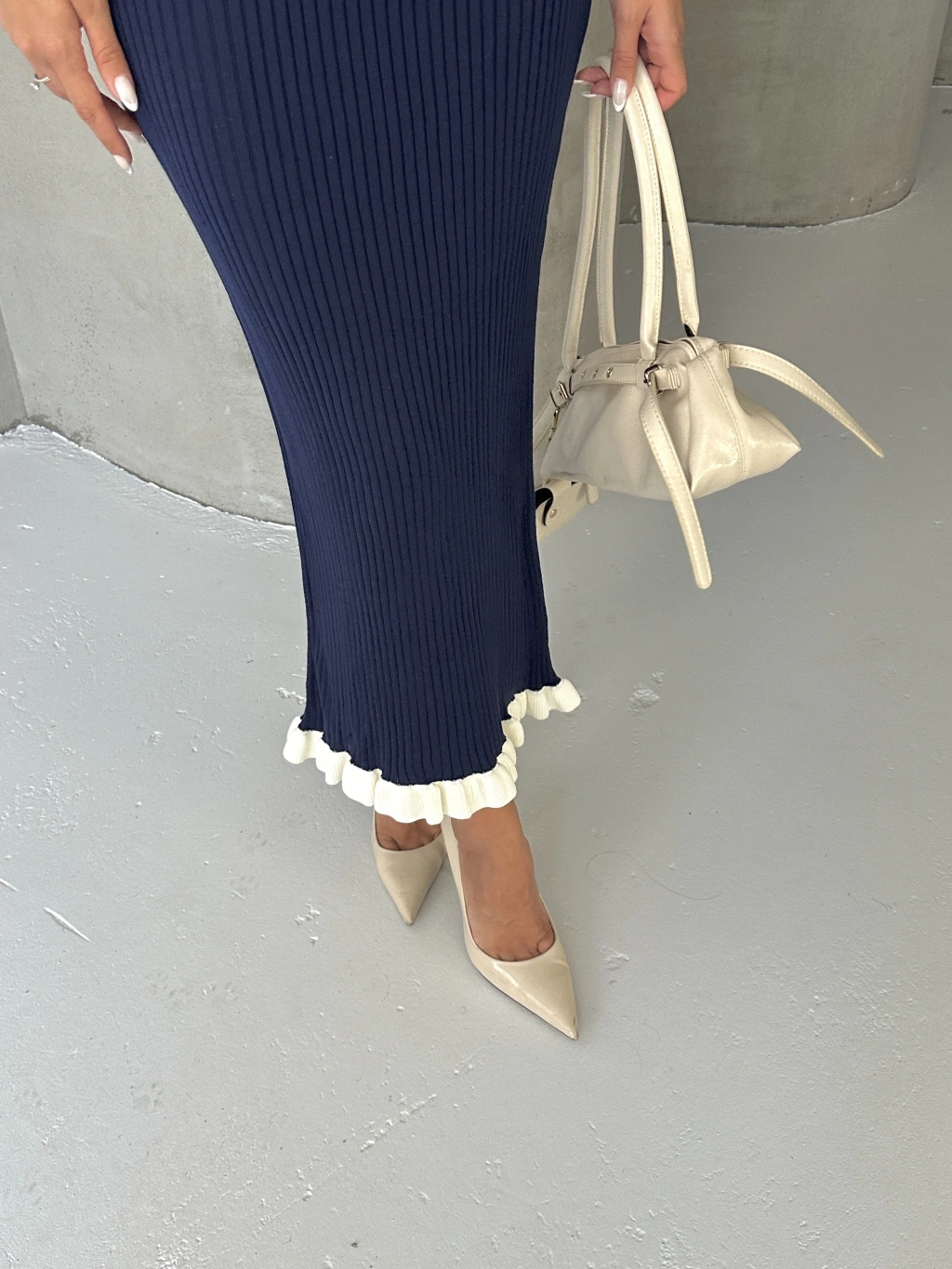 Kadın Lacivert Fitilli Fırfır Detaylı Etek Bluz Zarif Triko Takım (S Beden)