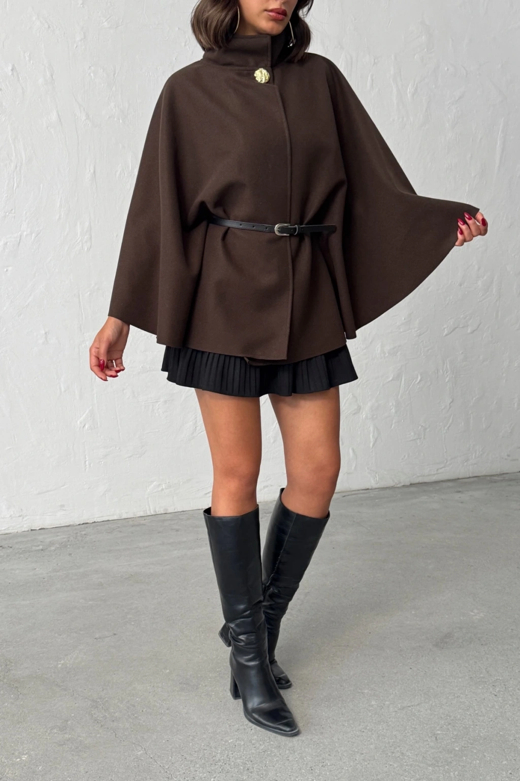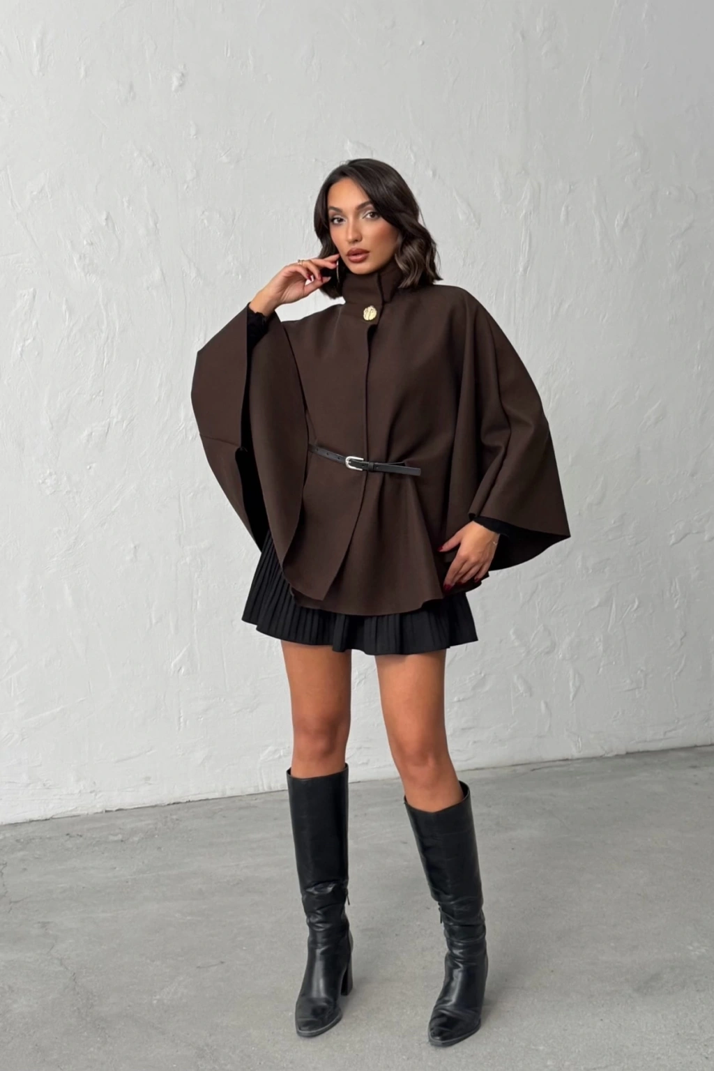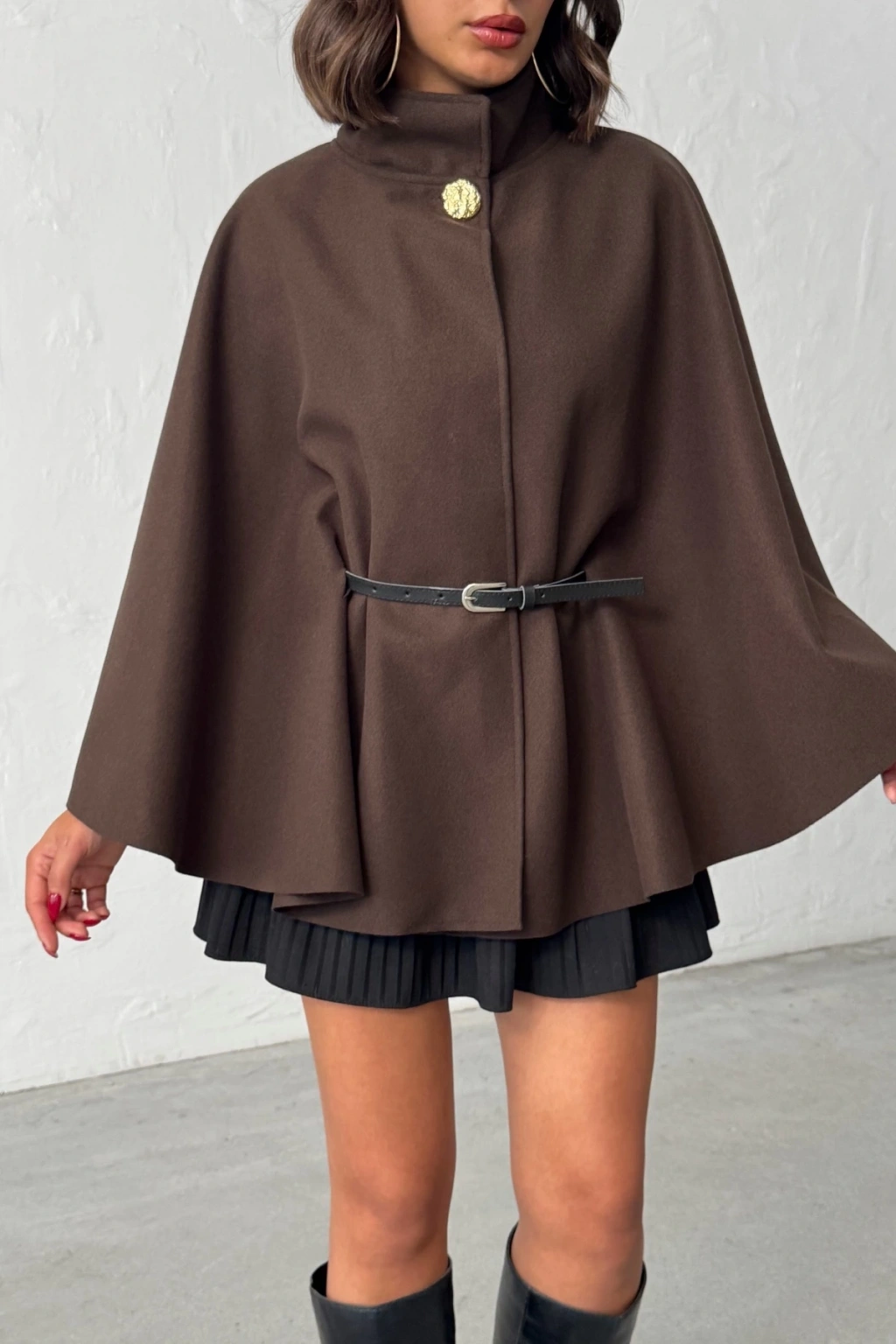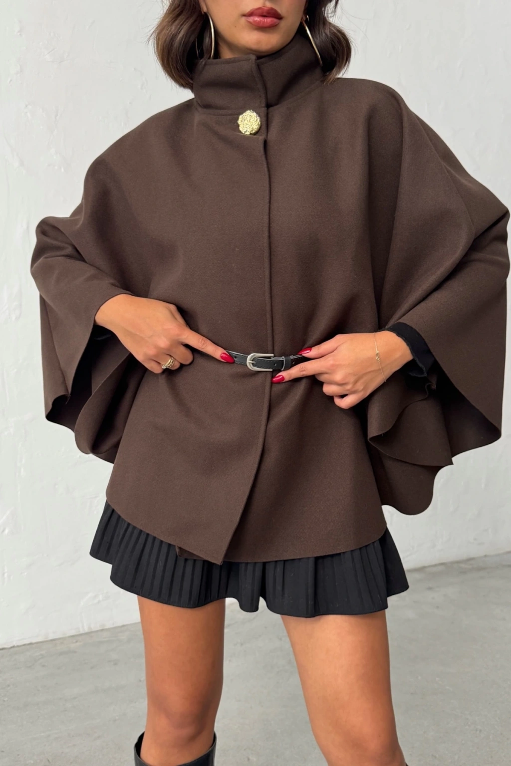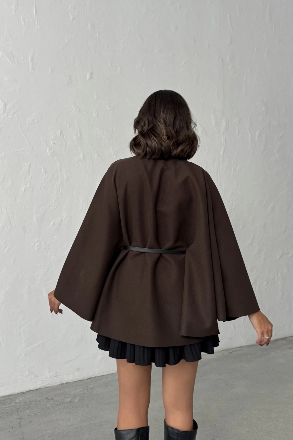 Kadın Kahverengi Gold Düğme ve Kemer Detaylı Kaşe Panço Ceket