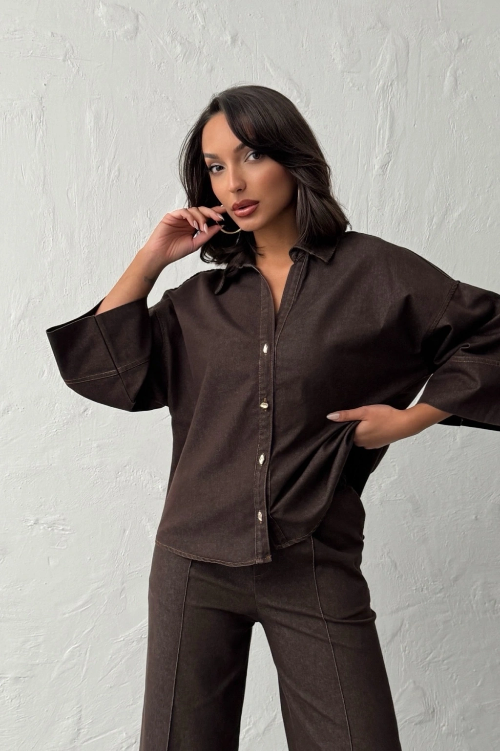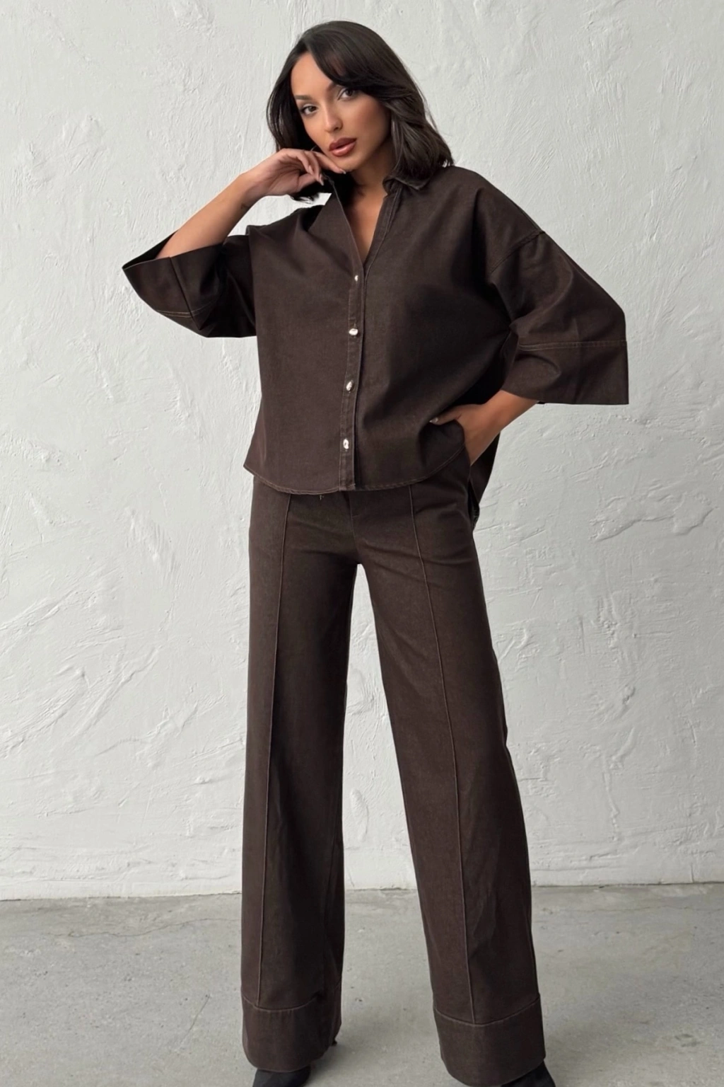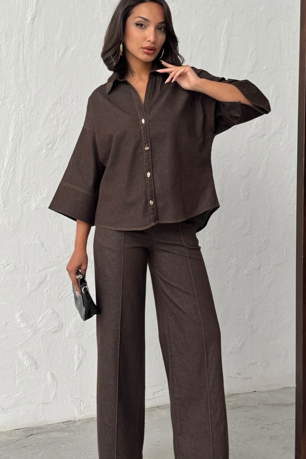 Kadın Kahverengi Gömlek Pantolon Premium Kalite Alt üst ikili Takım