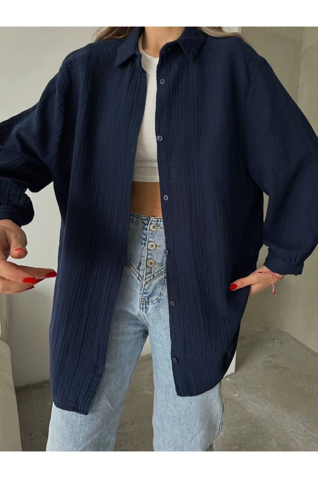 Kadın Cepli Lacivert Müslin Kumaş Premium Uzun Kol Düz Renk Gömlek