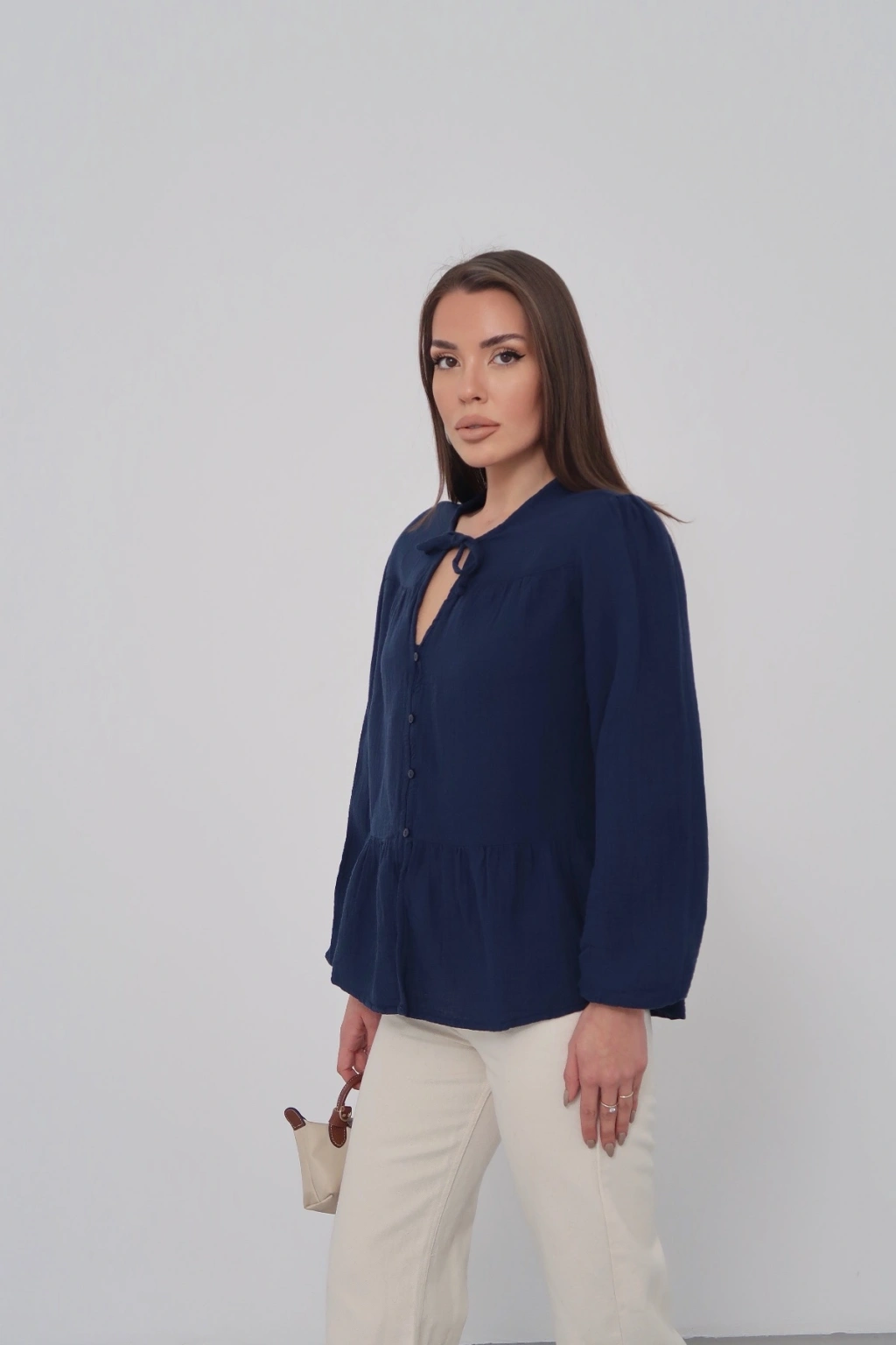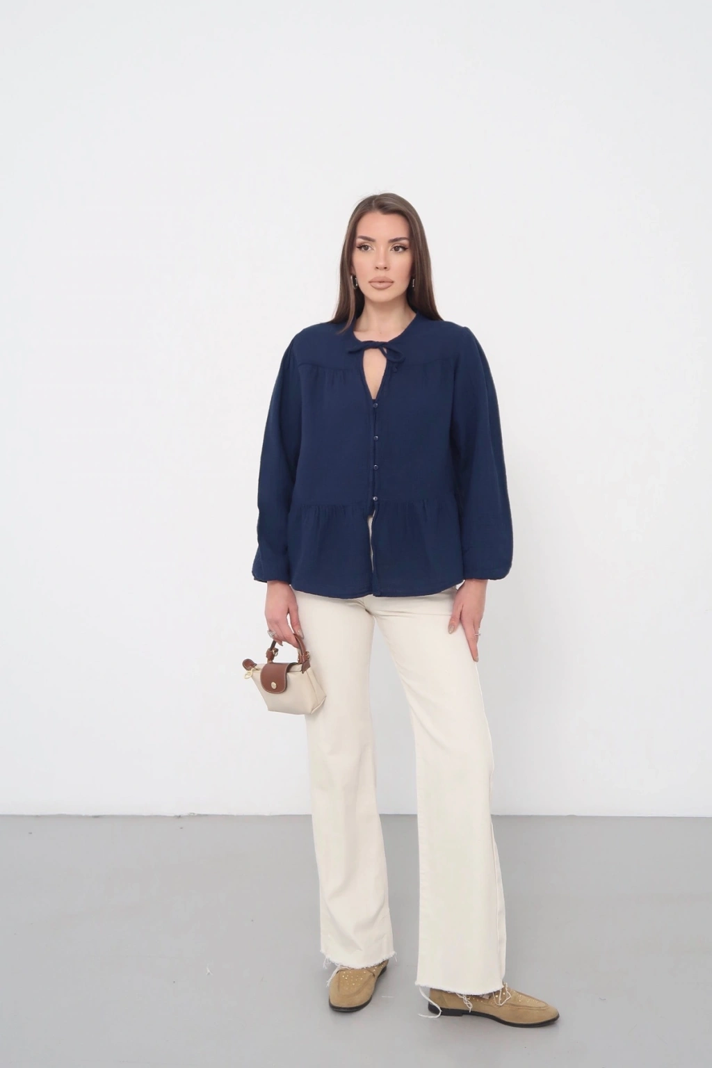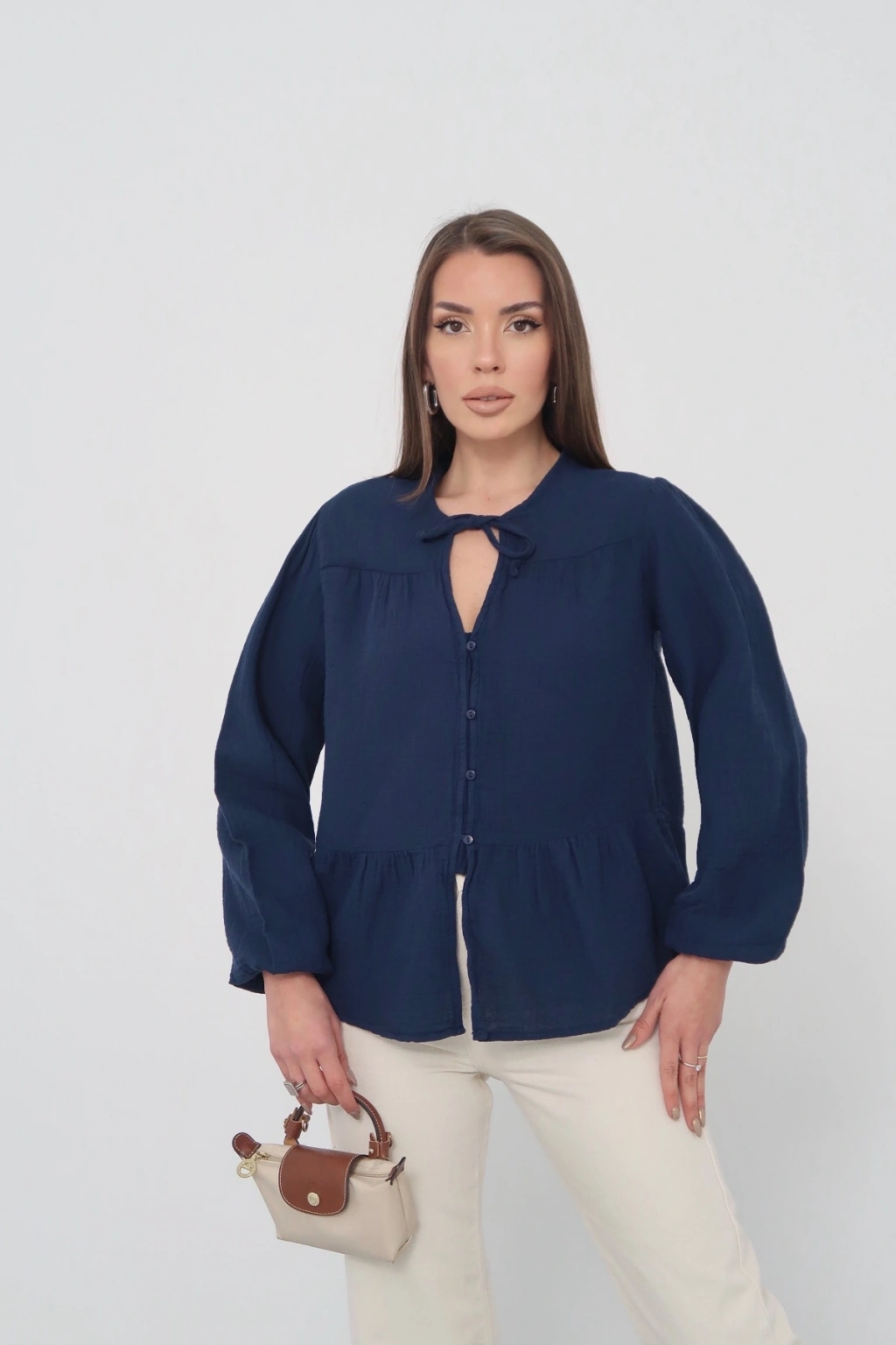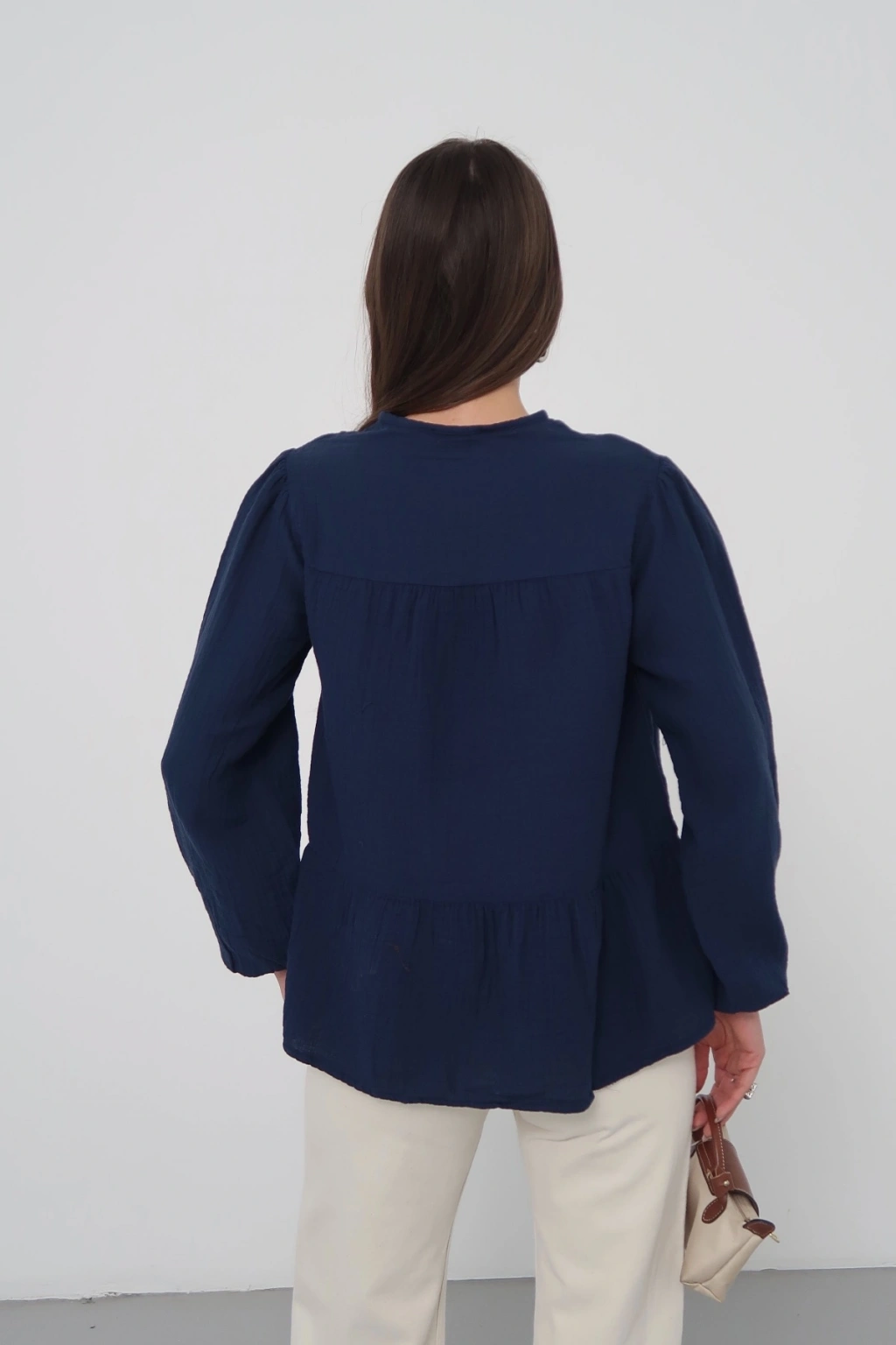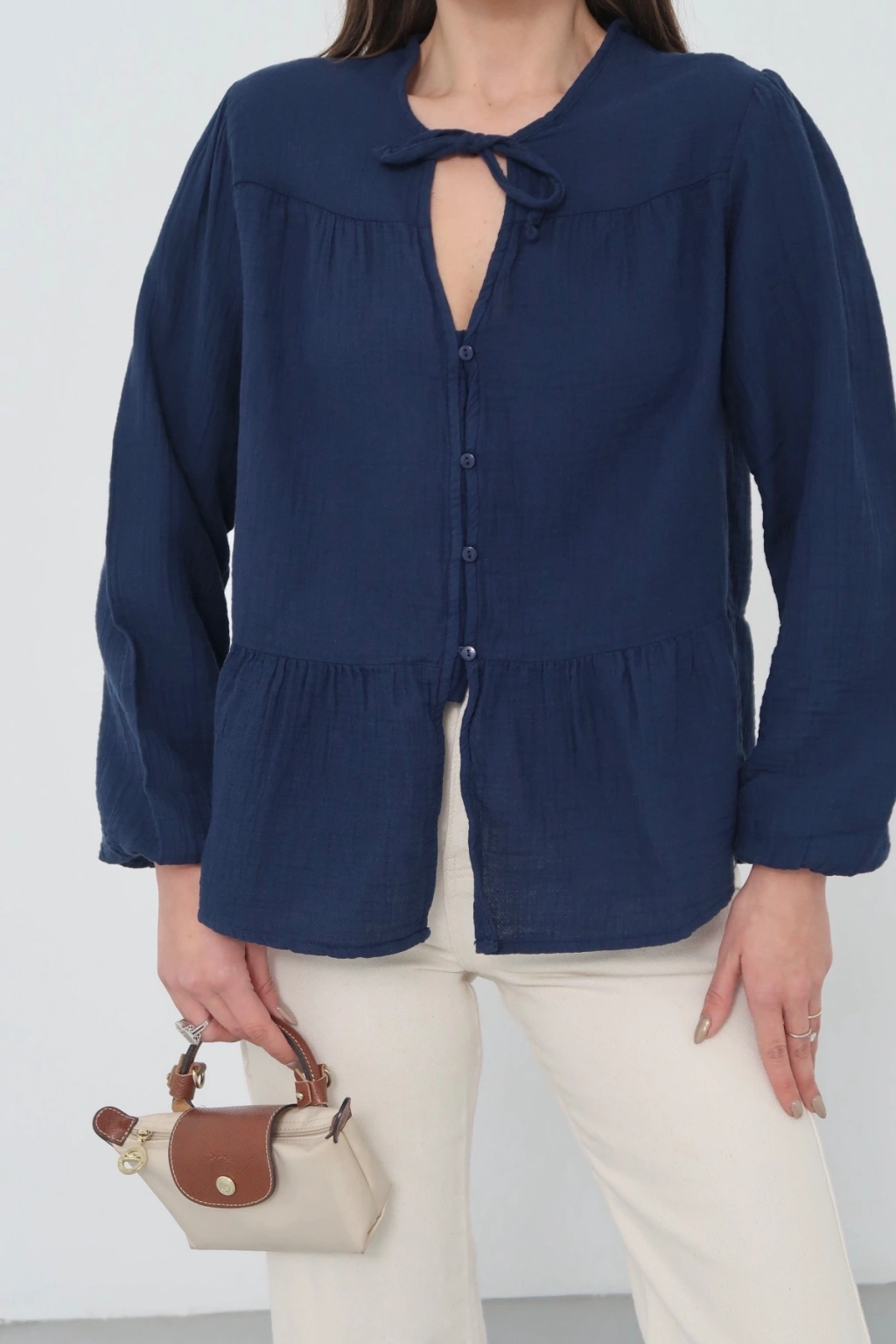 Kadın Lacivert Müslin Kumaş Yakası Bağcıklı Önü Düğmeli Volanlı Gömlek Bluz