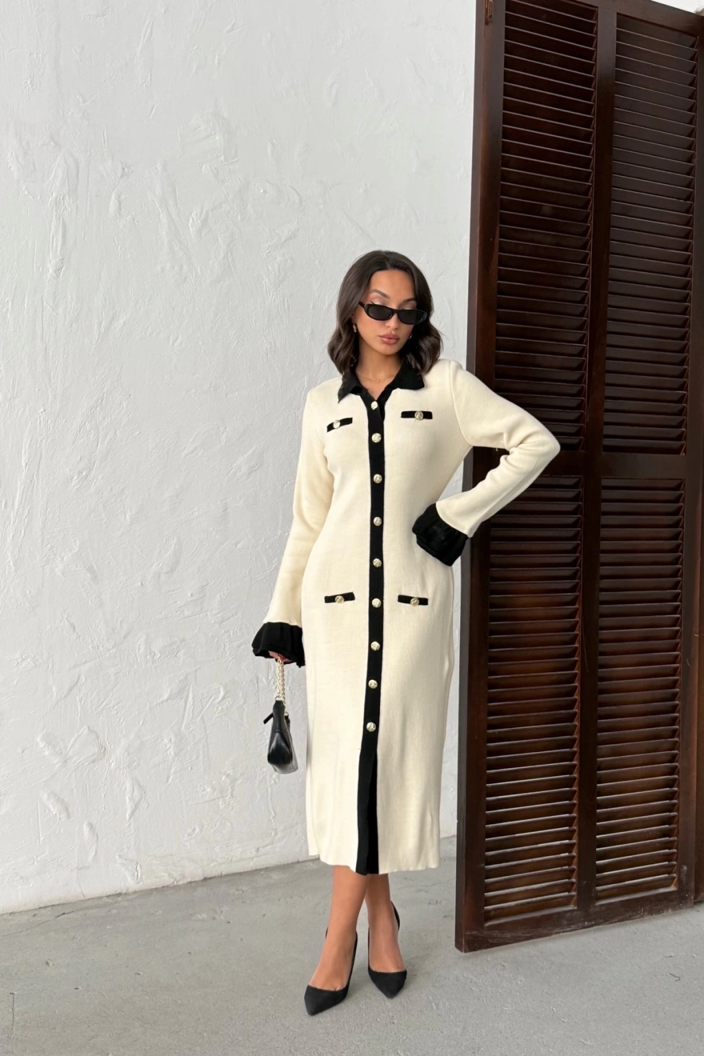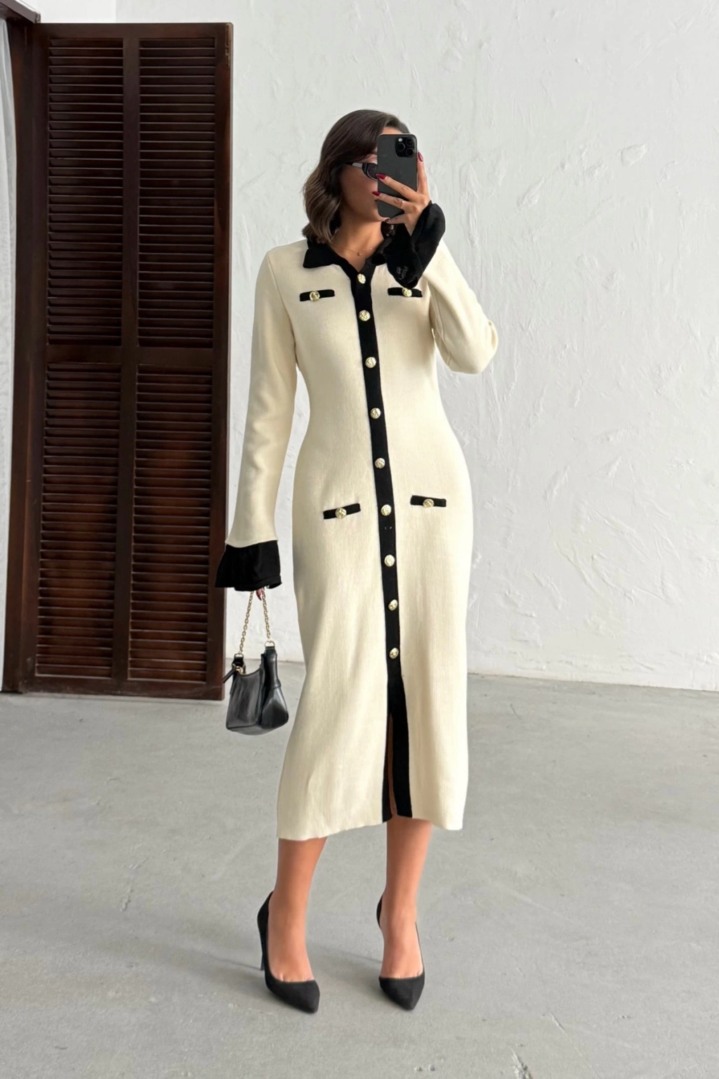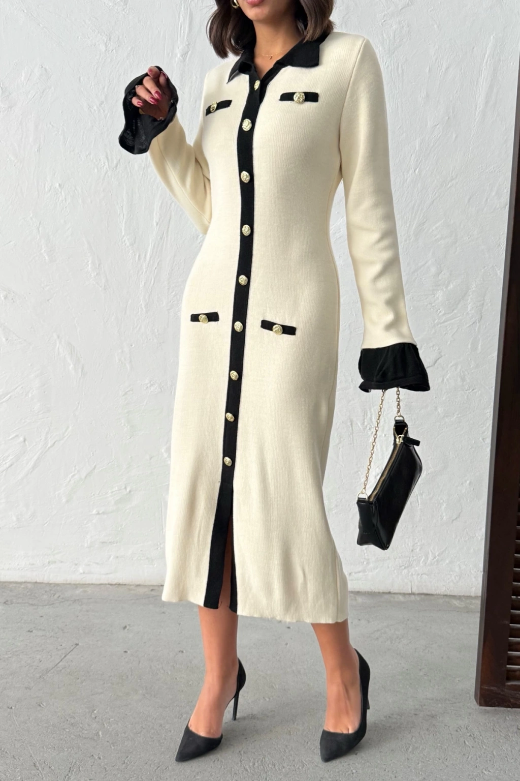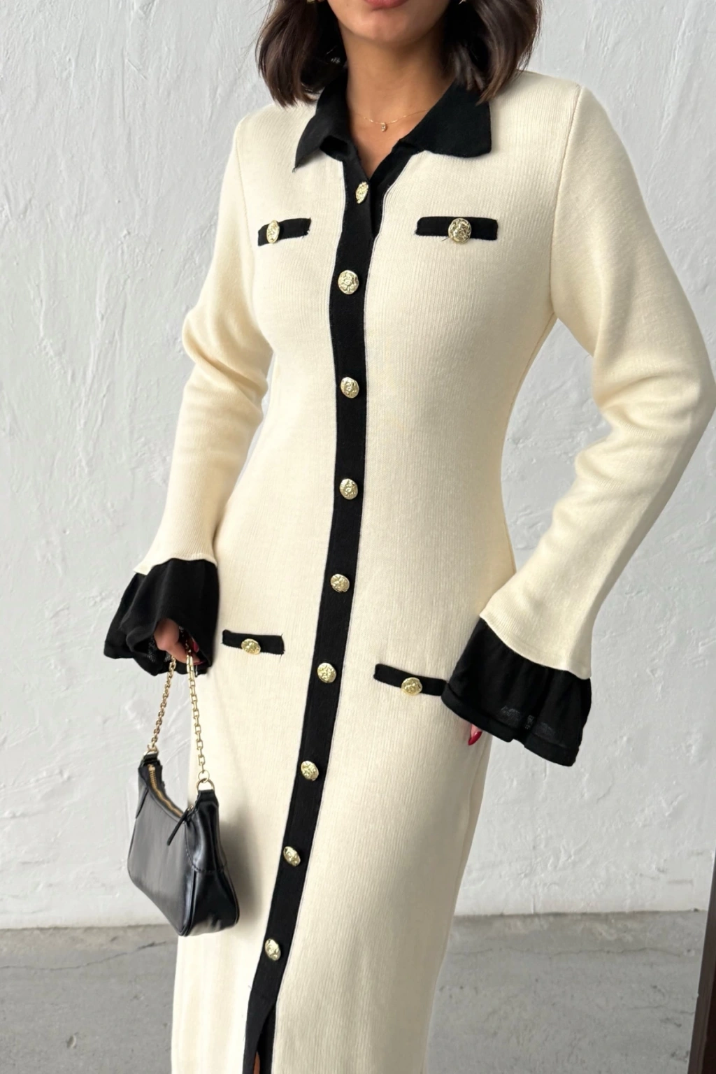 Kadın Ekru Şık Düğme Ve Kol Detaylı Triko Elbise