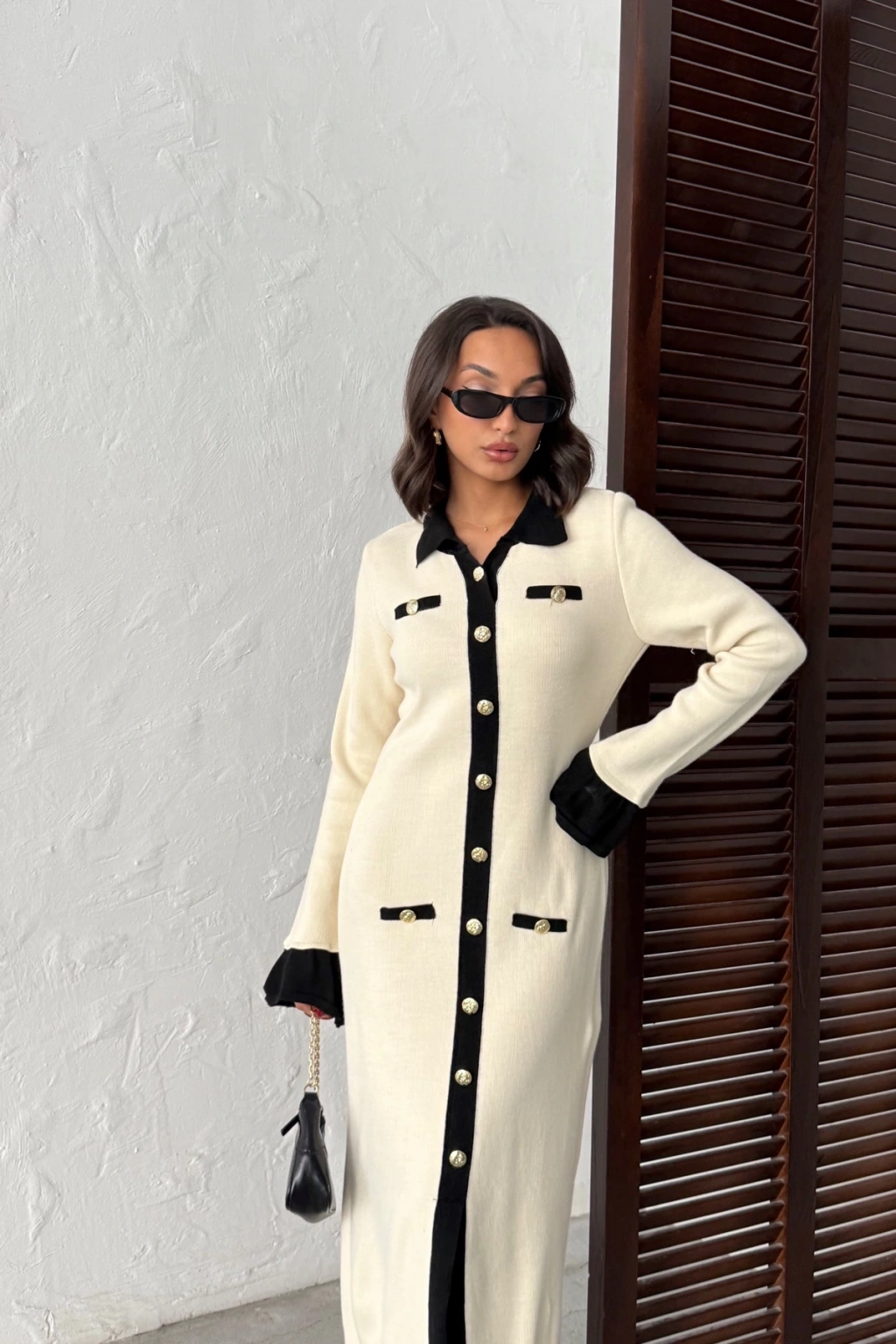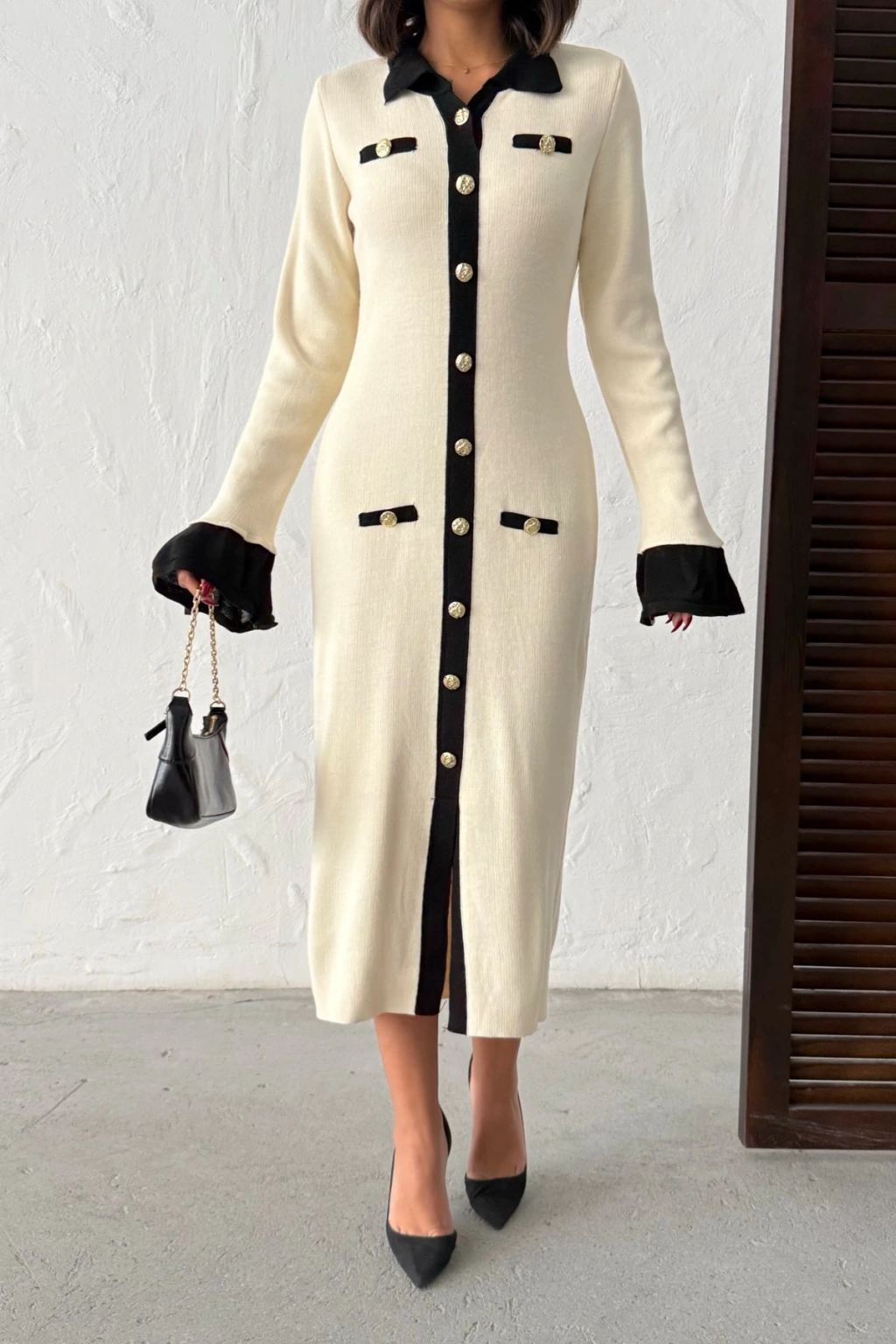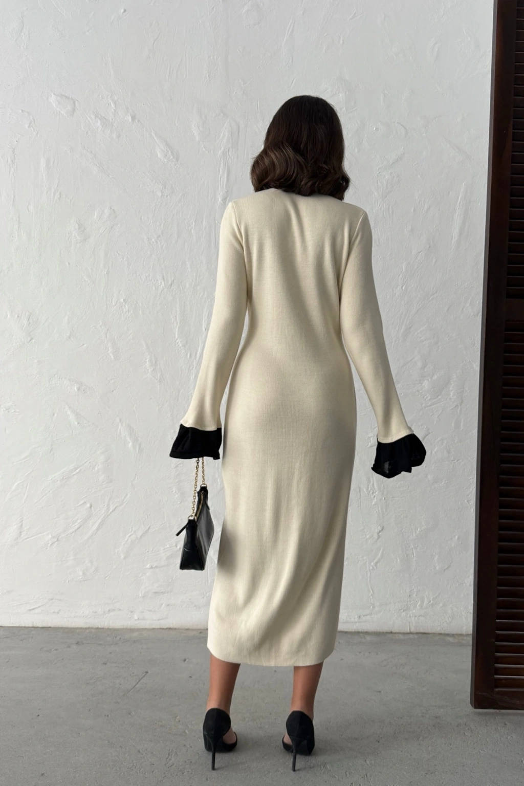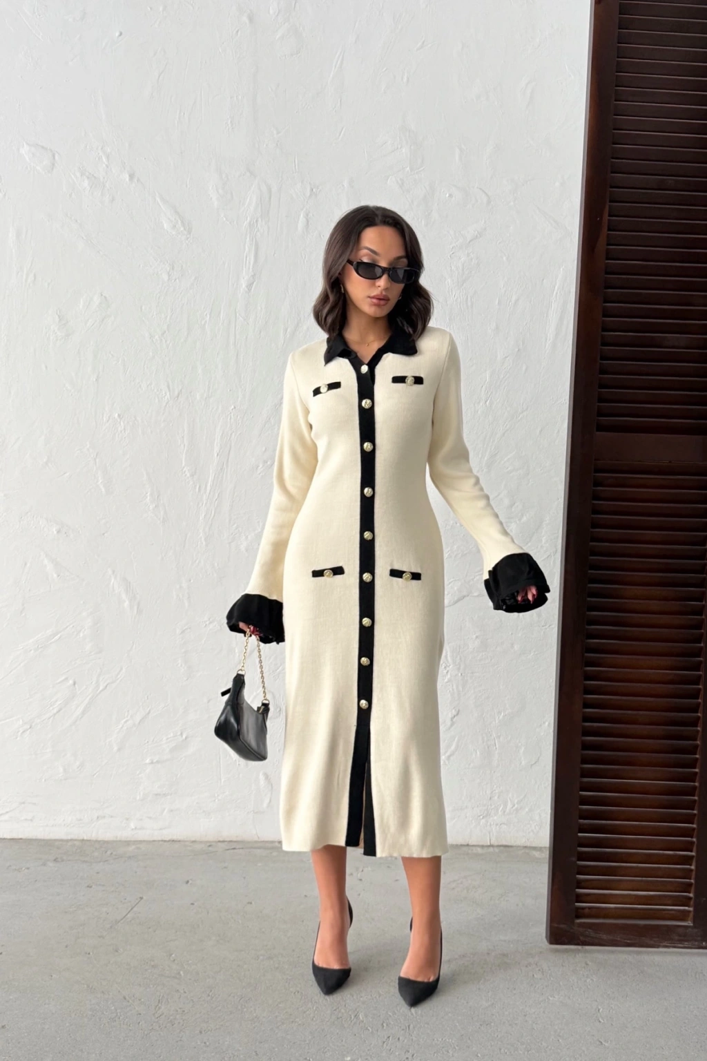 Kadın Ekru Şık Düğme Ve Kol Detaylı Triko Elbise