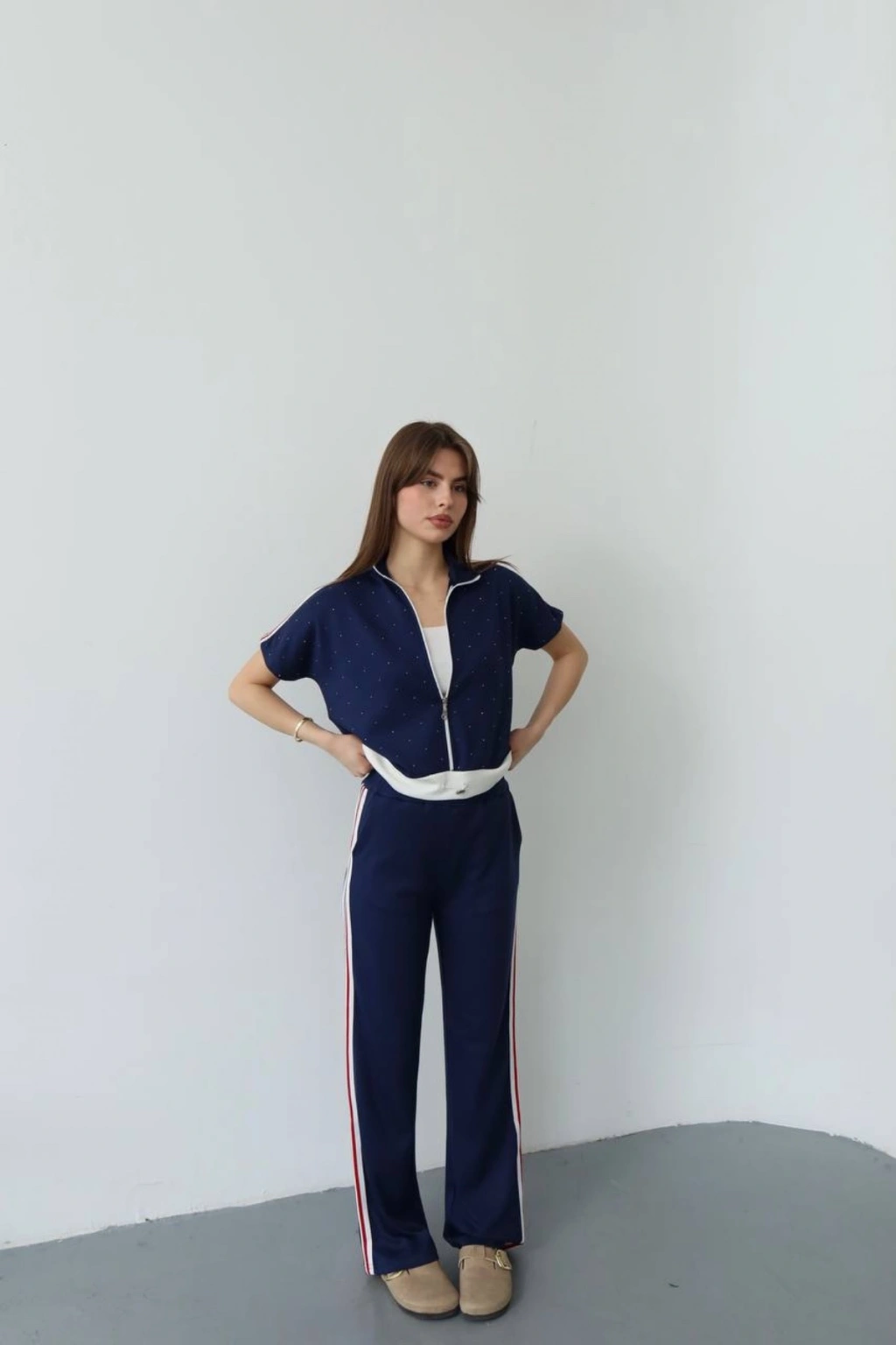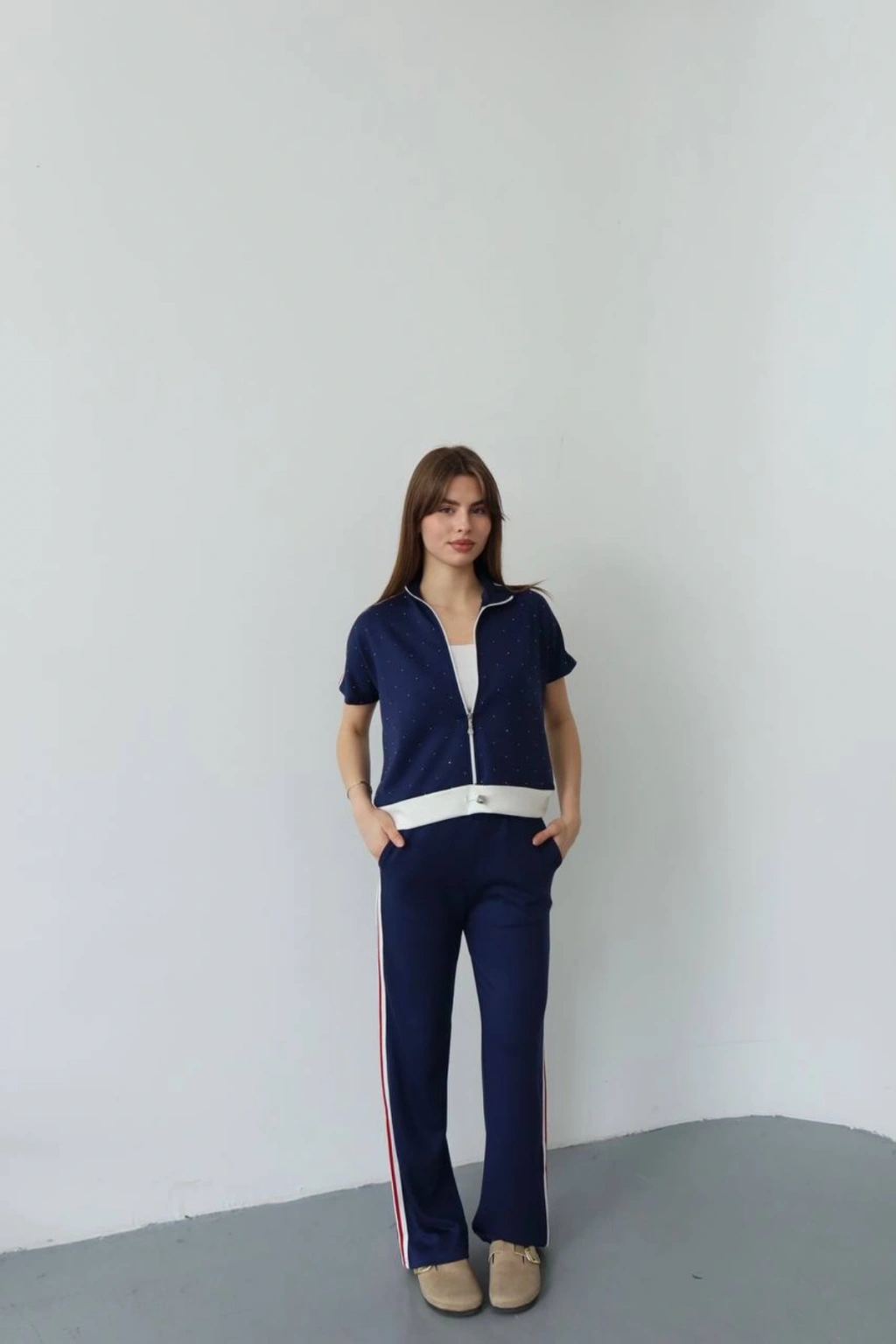 Kadın Lacivert Şık Taş ve Şerit Detaylı Pantolon Fermuarlı Bluz Alt Üst İkili Yumuşacık Takım