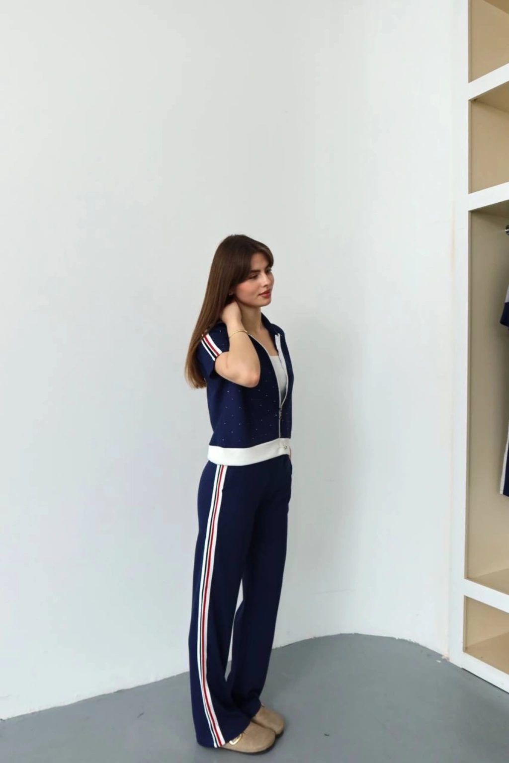 Kadın Lacivert Şerit Detaylı Rahat Kesim Geniş Paça Pantolon Hırka İkili Takım