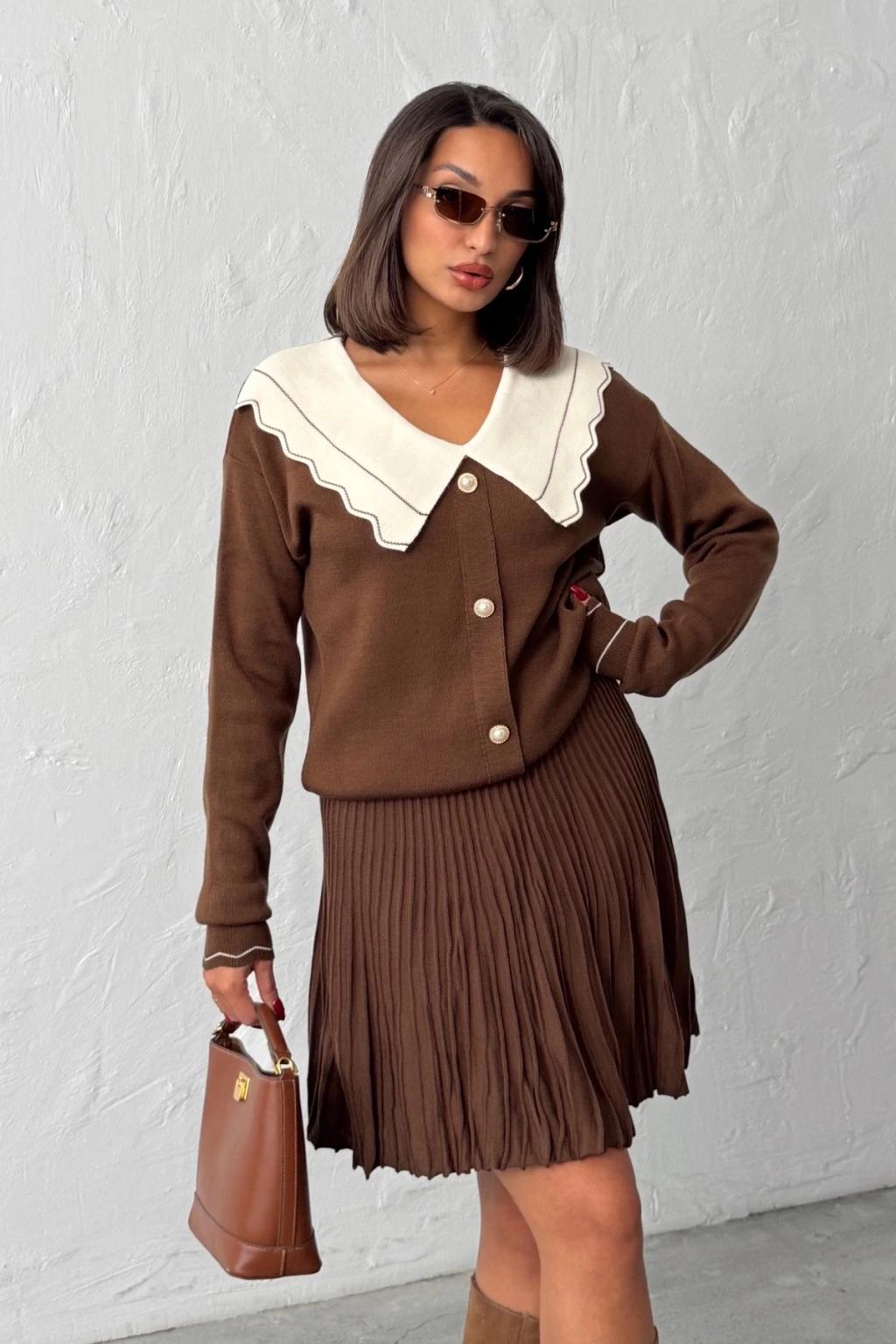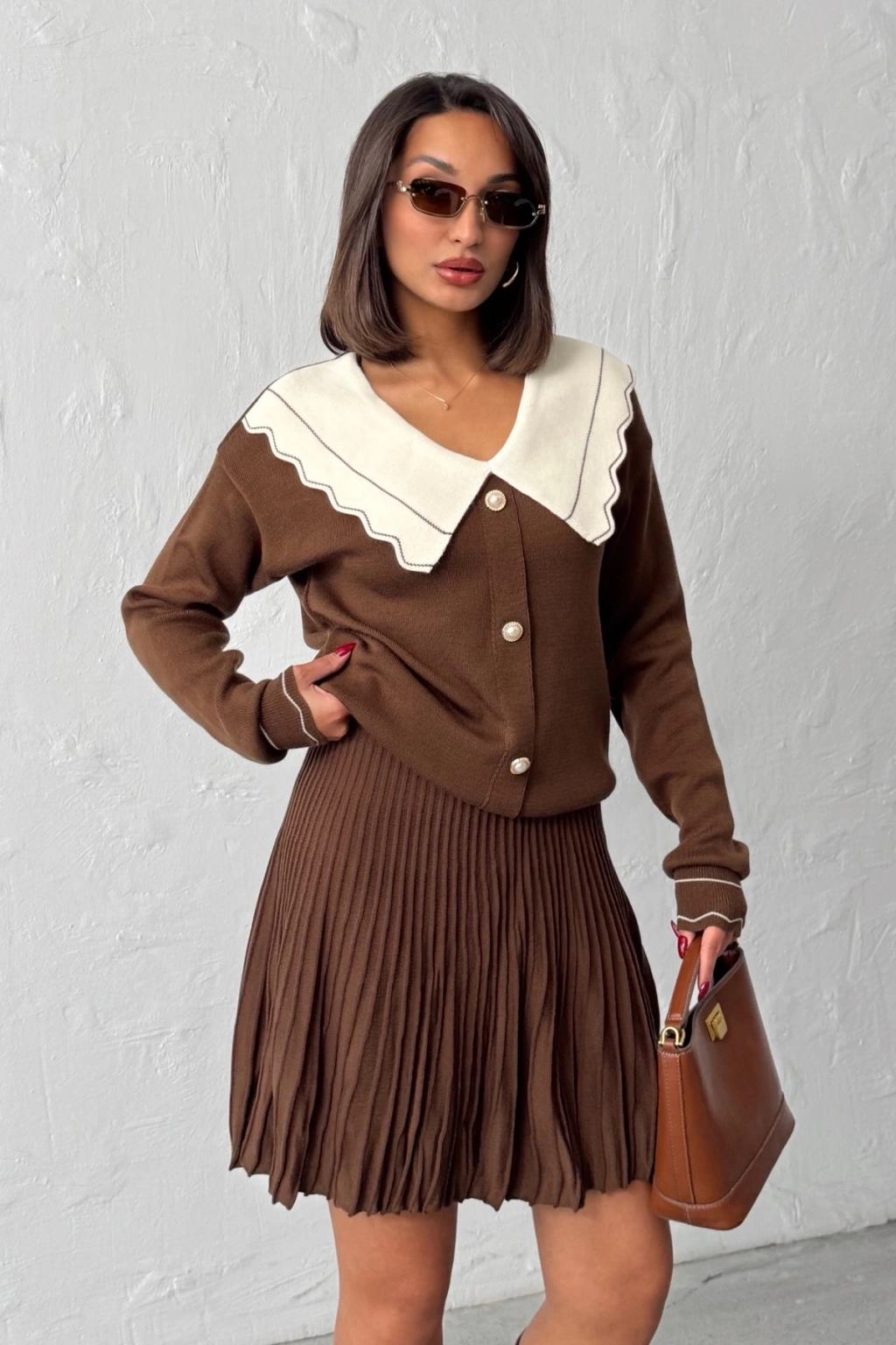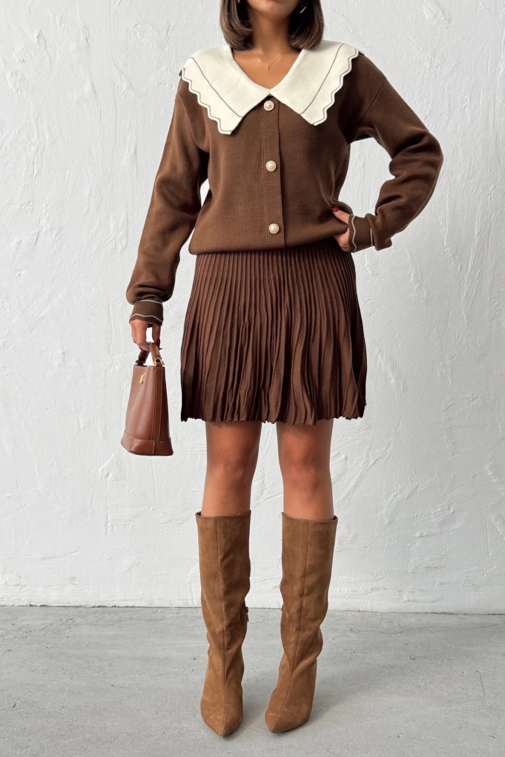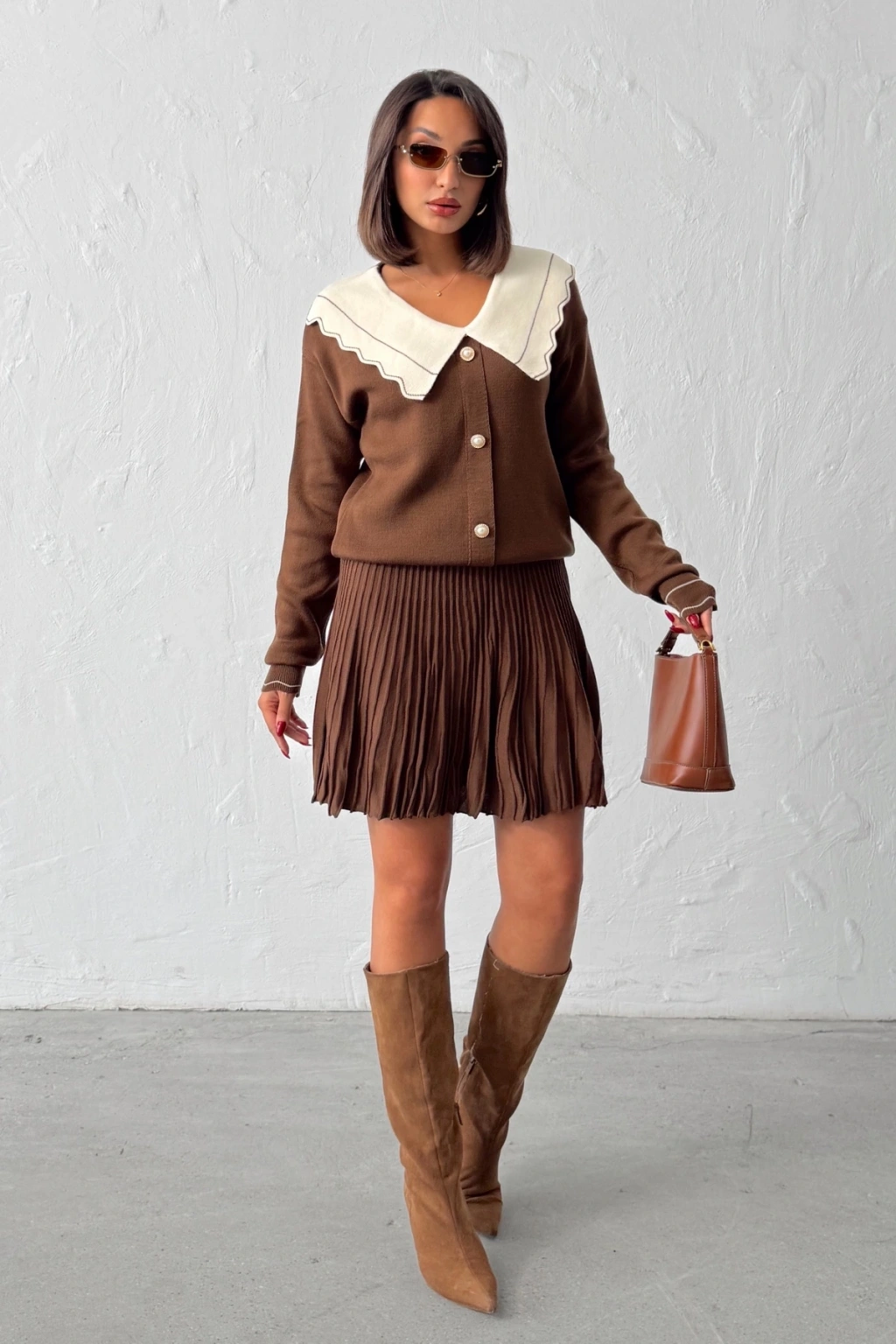 Kadın Kahverengi Şık Yaka Detaylı Hırka Bluz Etek Alt Üst İkili Takım (Yeni Renk)