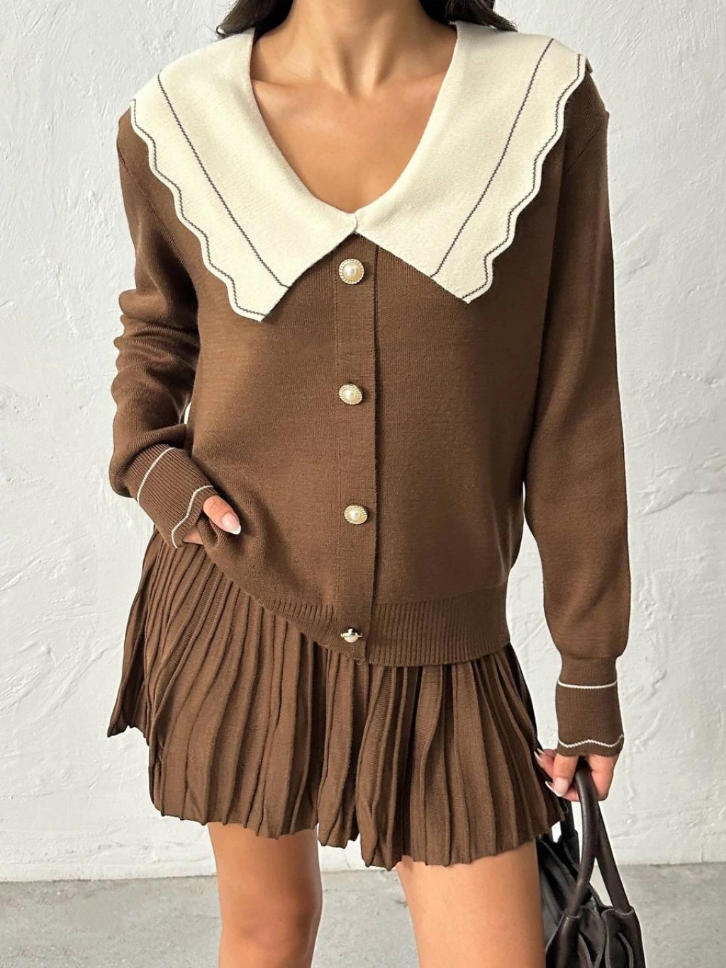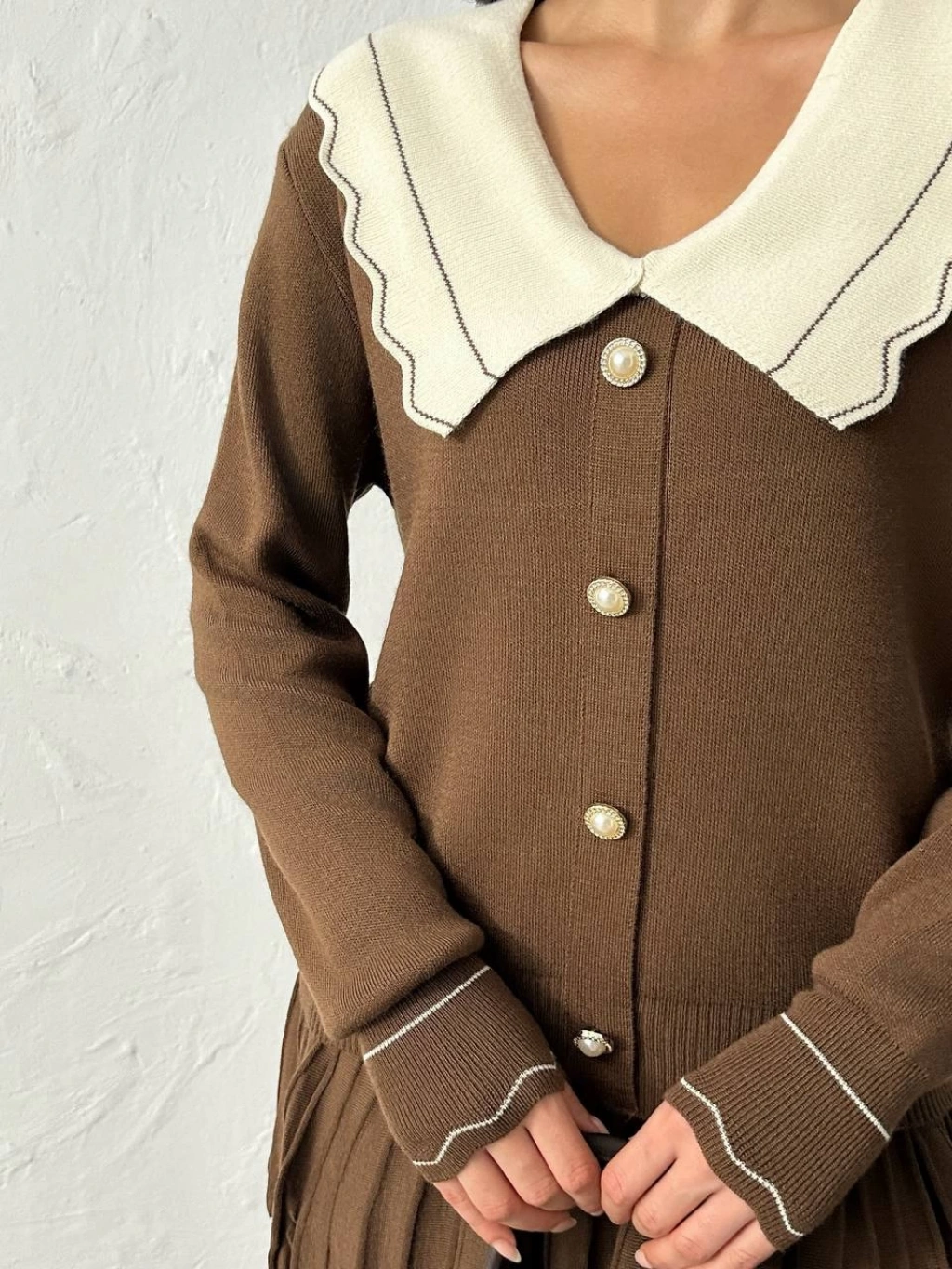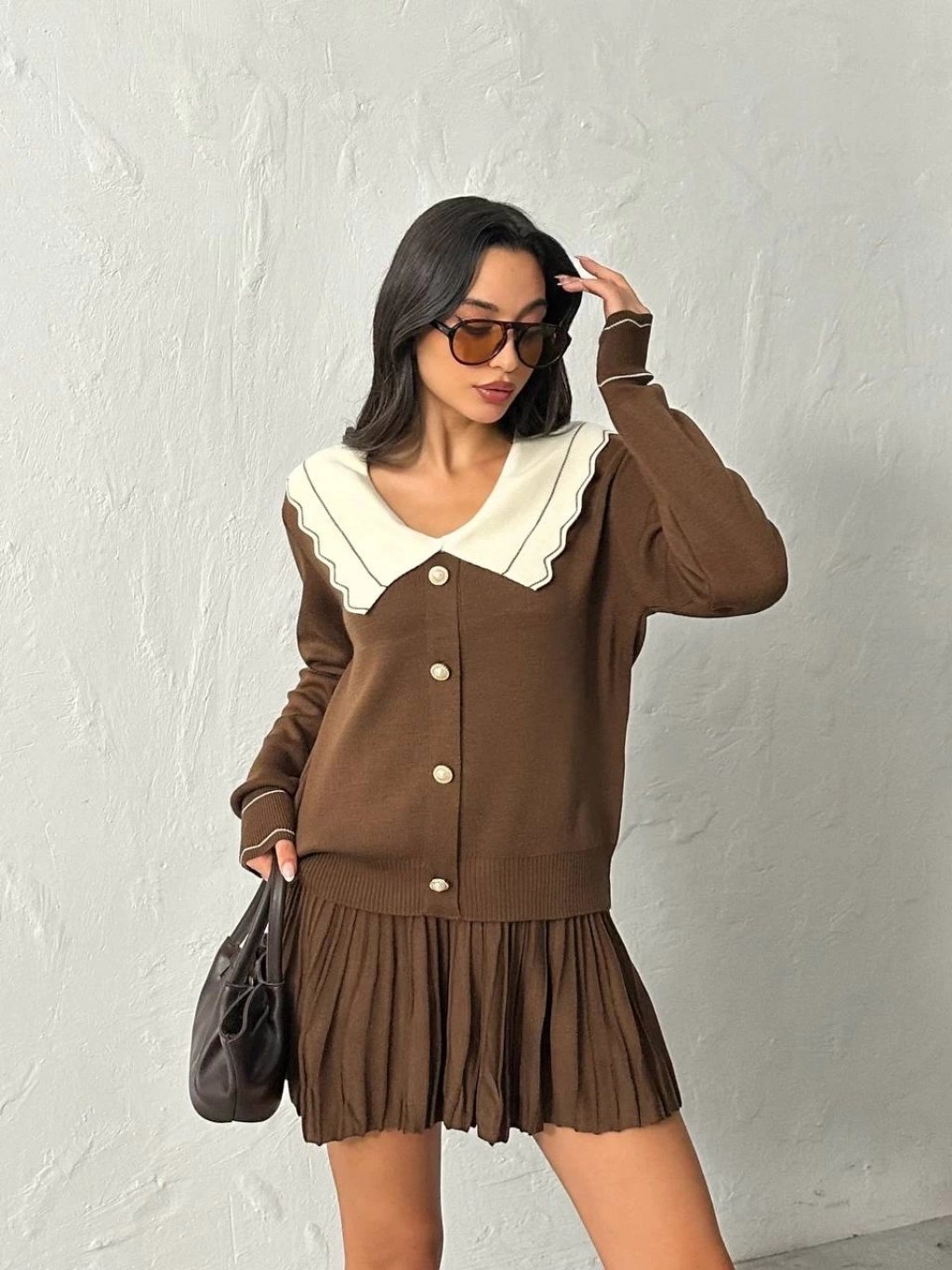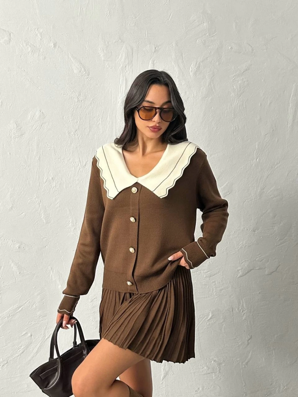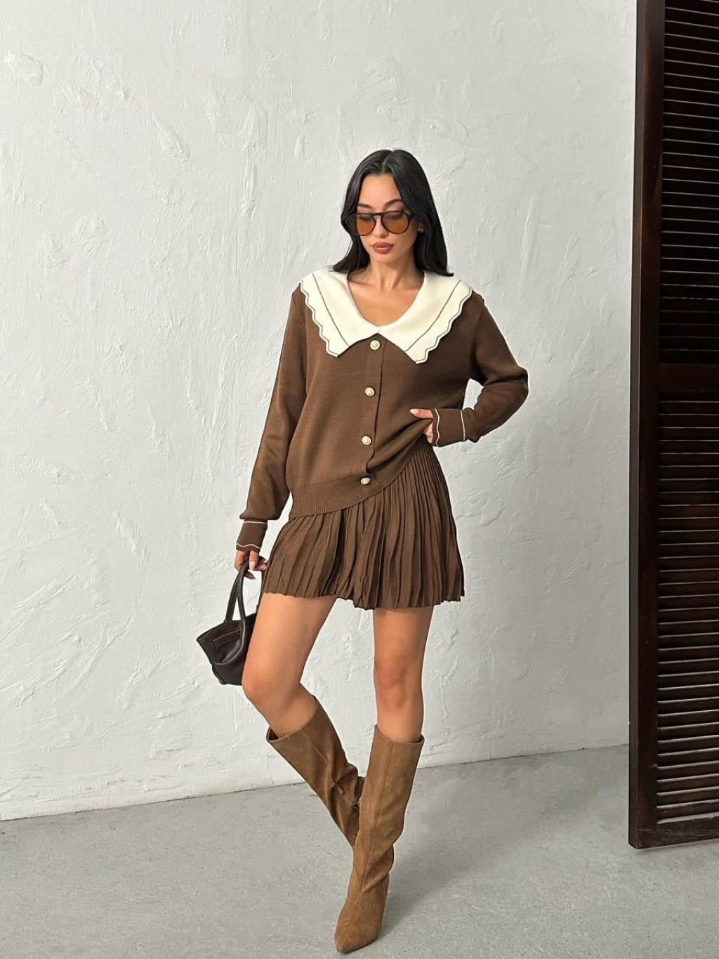 Kadın Kahverengi Şık Yaka Detaylı Hırka Bluz Etek Alt Üst İkili Takım (Yeni Renk)