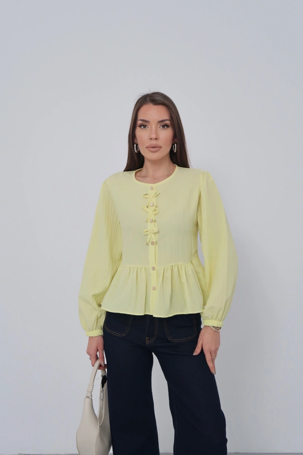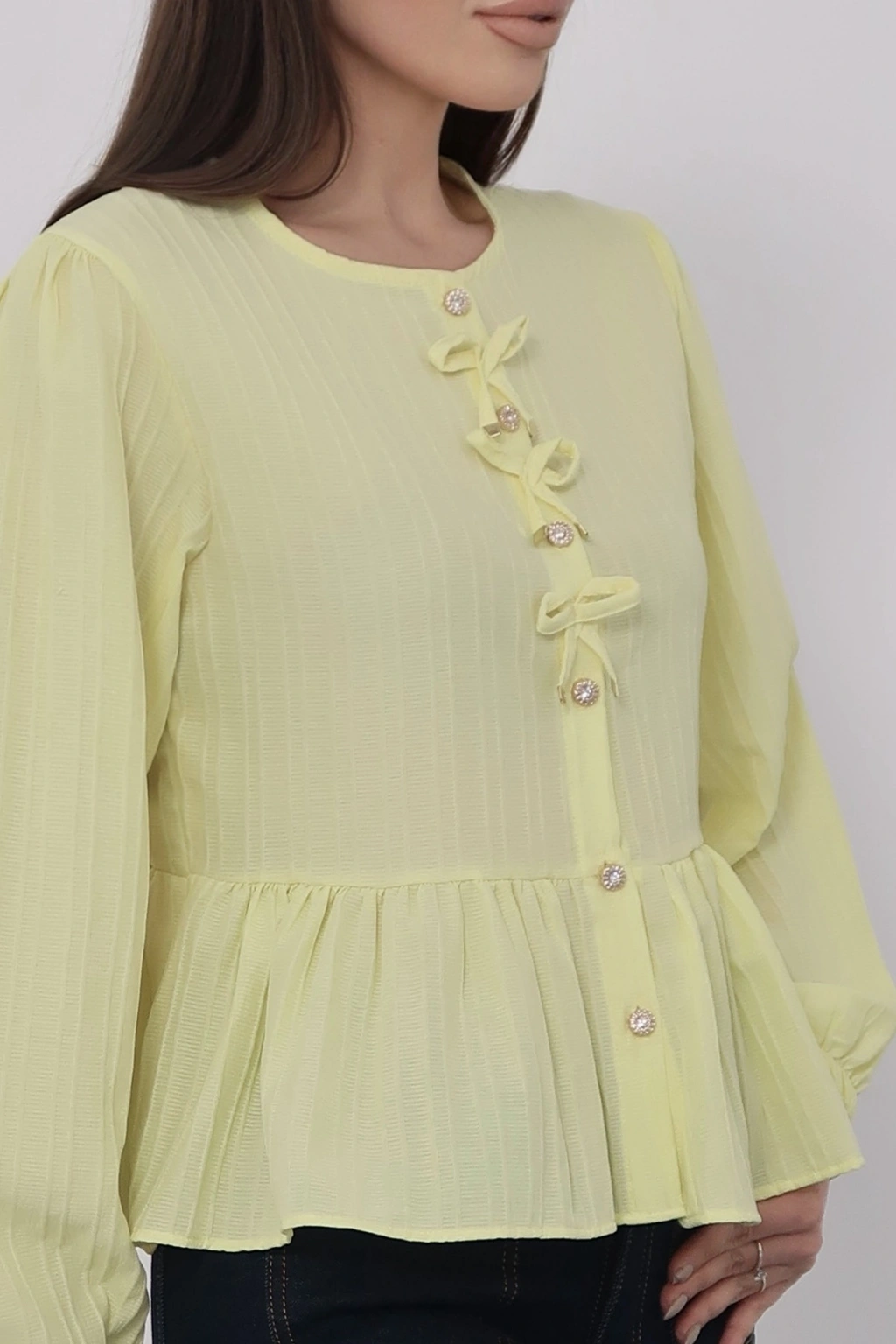 Kadın Limon Sarısı Fiyonk Detaylı Düğmeli Uzun Kol Gömlek Bluz