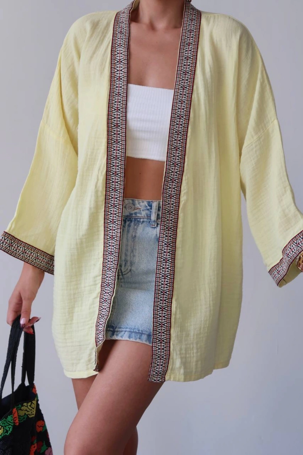Kadın Limon Sarısı Nakışlı Bohem Stil Premium Kalite Kimono Hırka