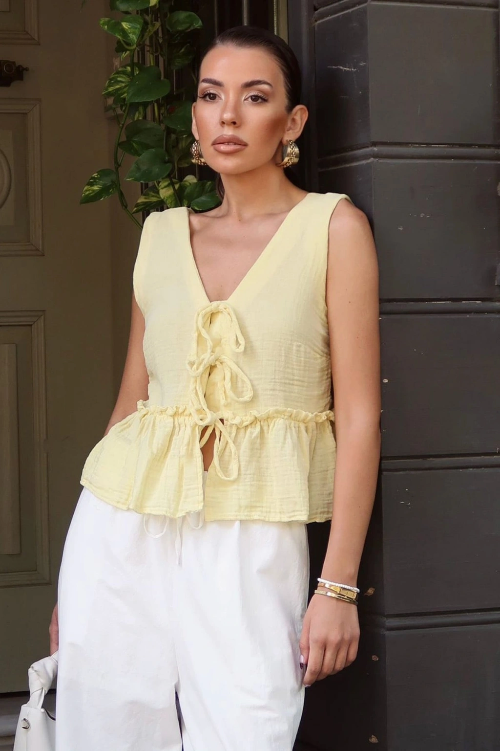 Kadın Limon Sarısı Önü Bağcıklı Müslin Bluz