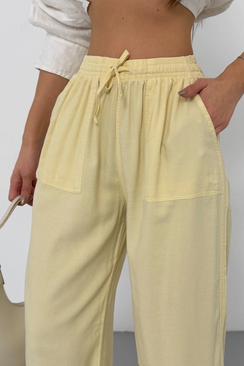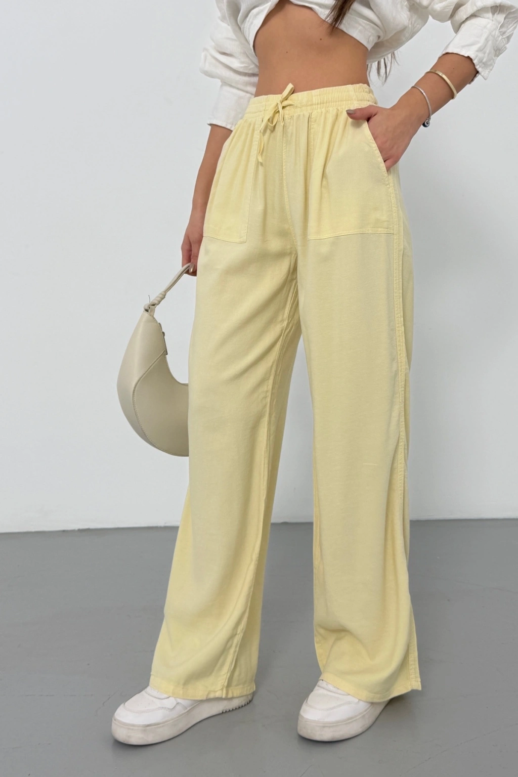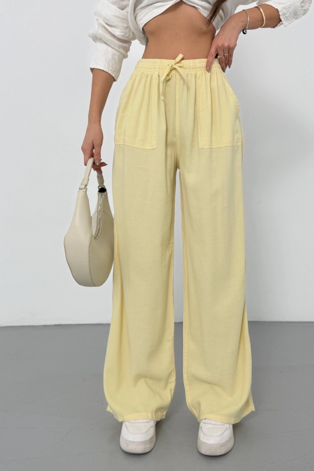 Kadın Yaz Sarısı Yüksek Bel Beli Lastikli Bağcıklı Bol Paça Geniş Kesim Şık Cepli Premium Palazzo Pantolon
