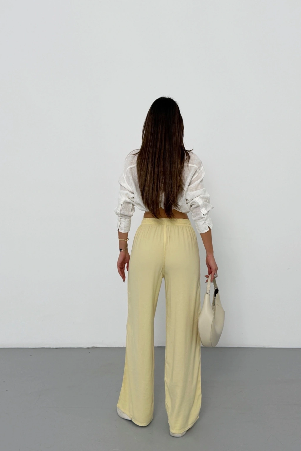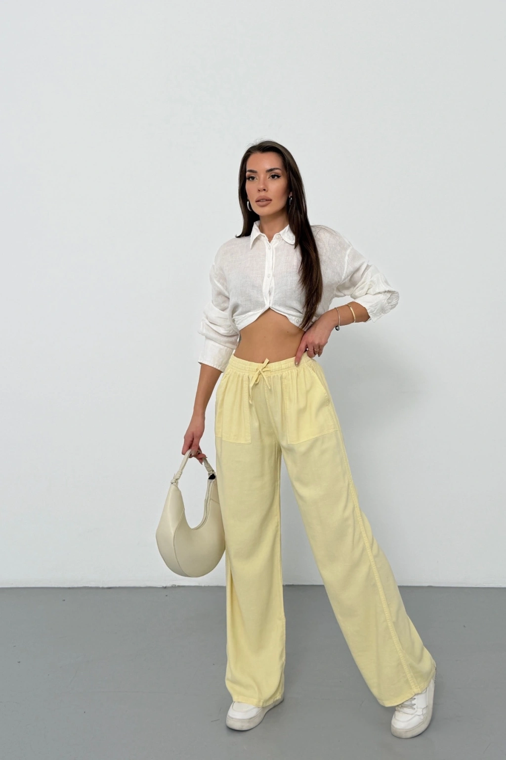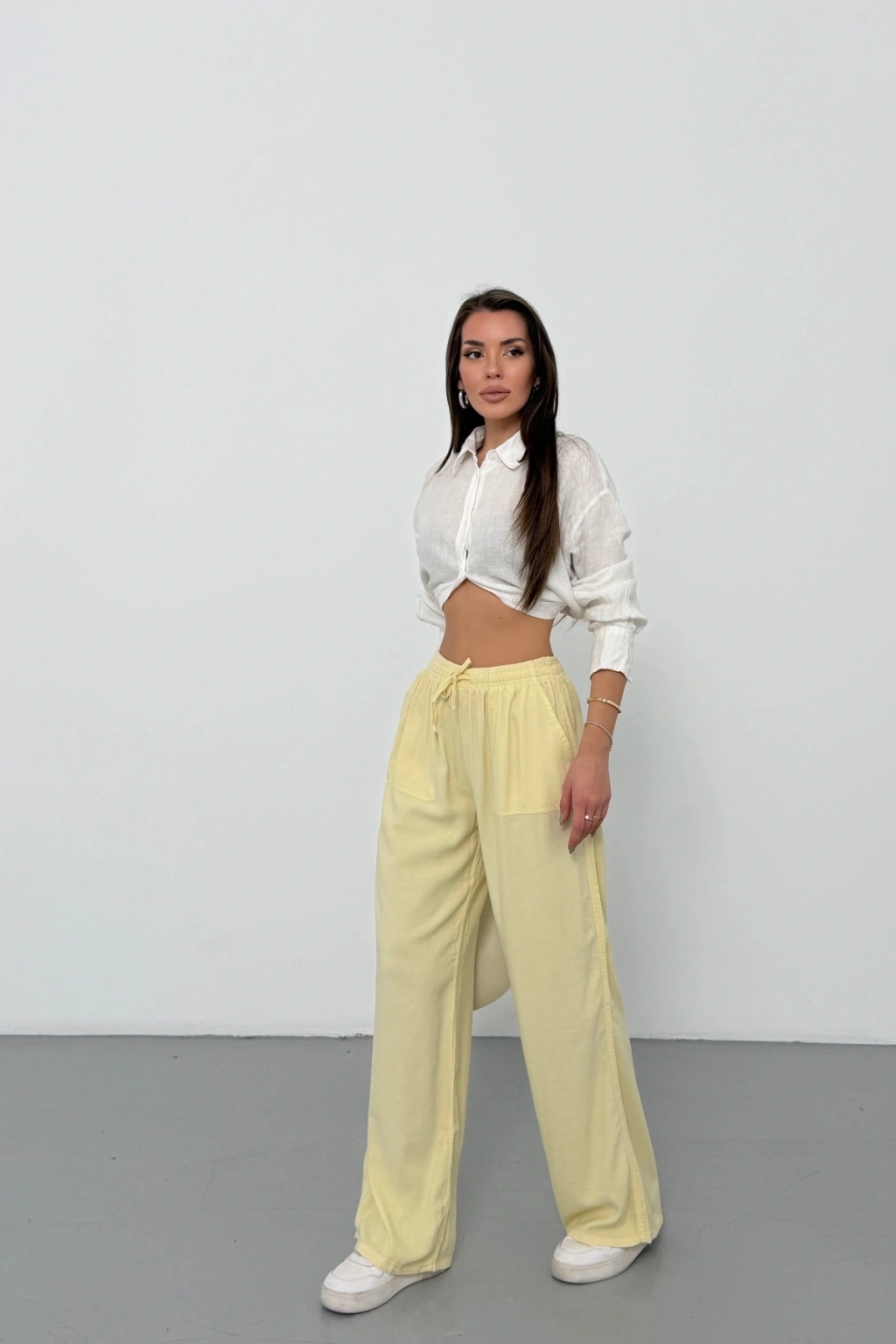 Kadın Yaz Sarısı Yüksek Bel Beli Lastikli Bağcıklı Bol Paça Geniş Kesim Şık Cepli Premium Palazzo Pantolon