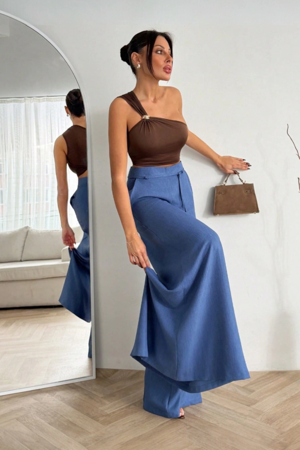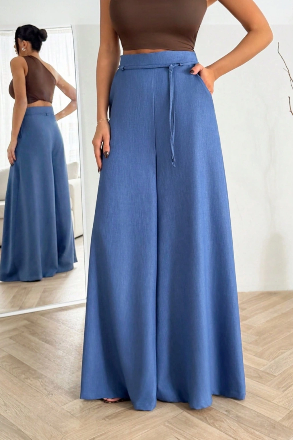 Kadın Mavi Bağcıklı Yüksek Bel Rahat Kesim Bol Paça Sofya Keten Pantolon