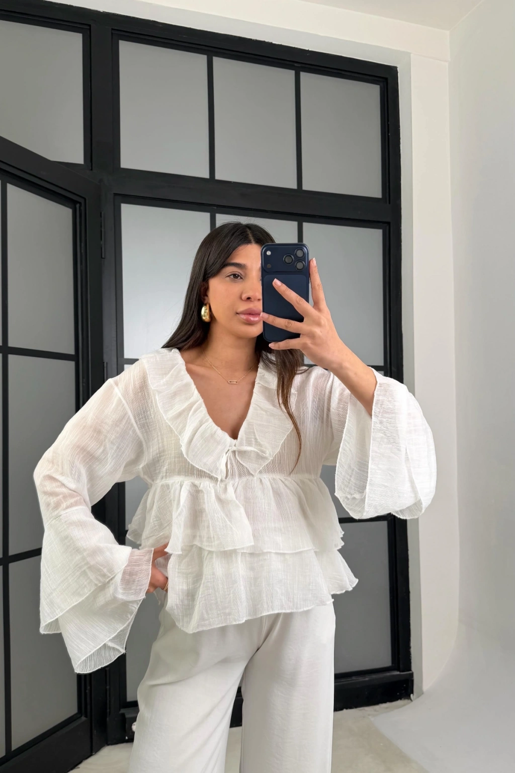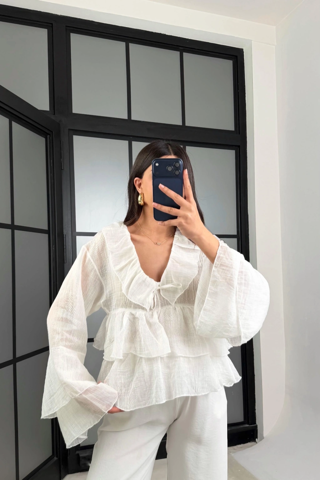 Kadın Beyaz Fırfır Detaylı Transparan Bluz