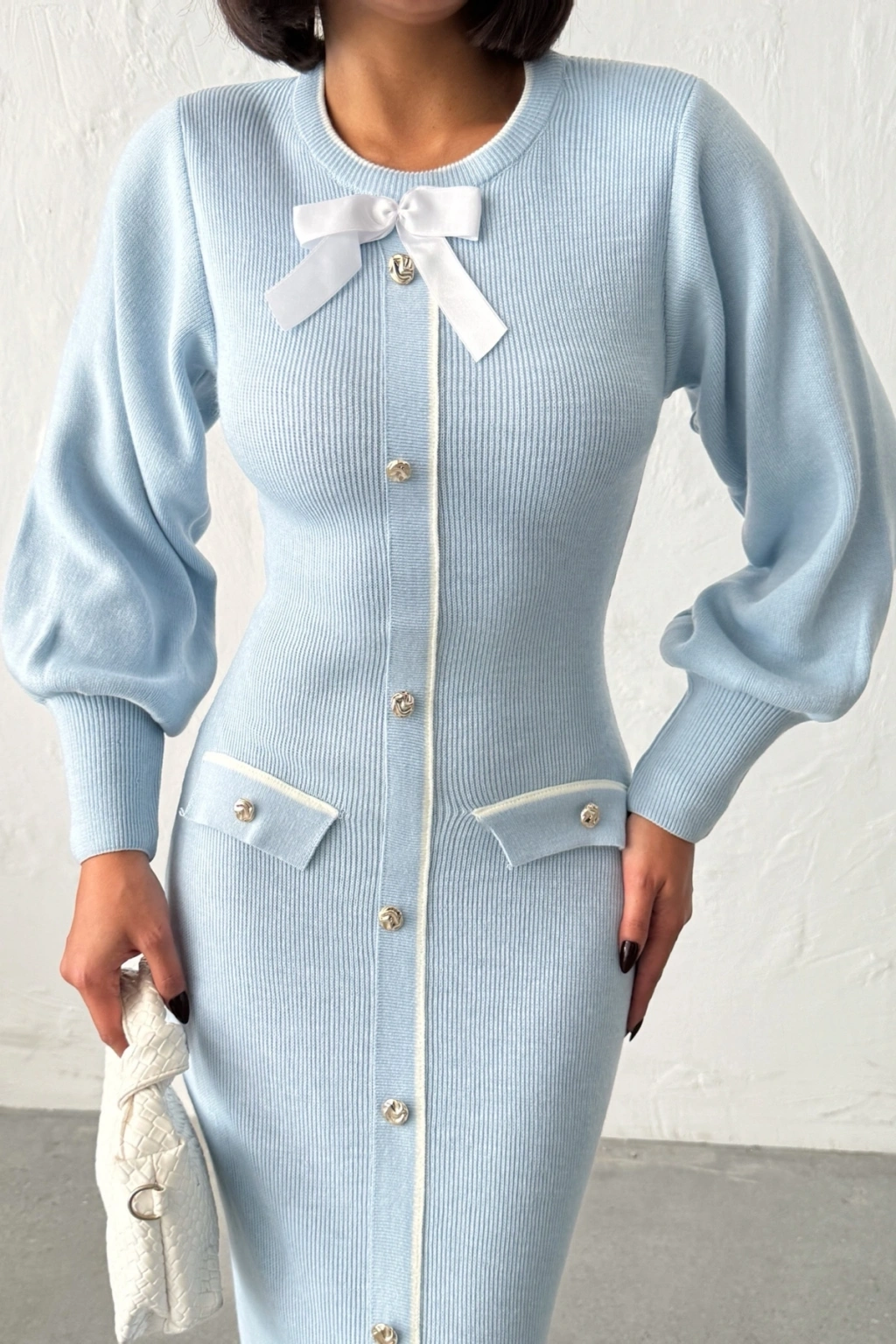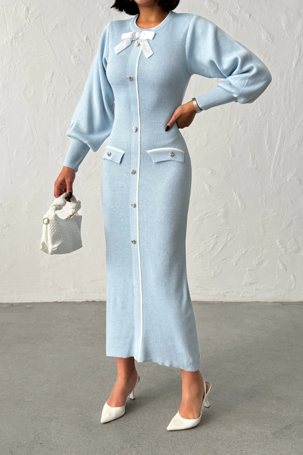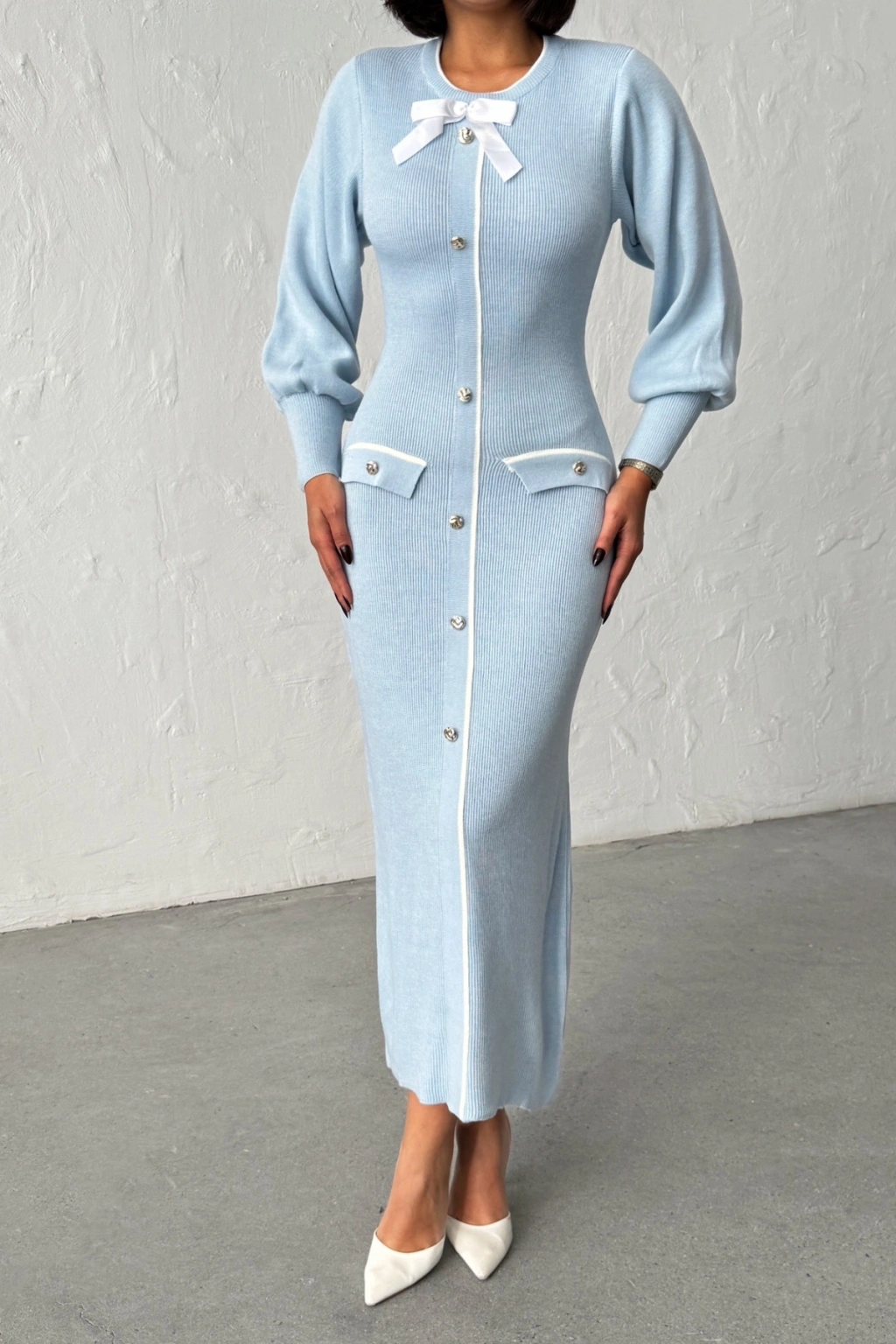 Kadın Mavi Şık Fiyonk Detaylı Balon Kol Triko Elbise