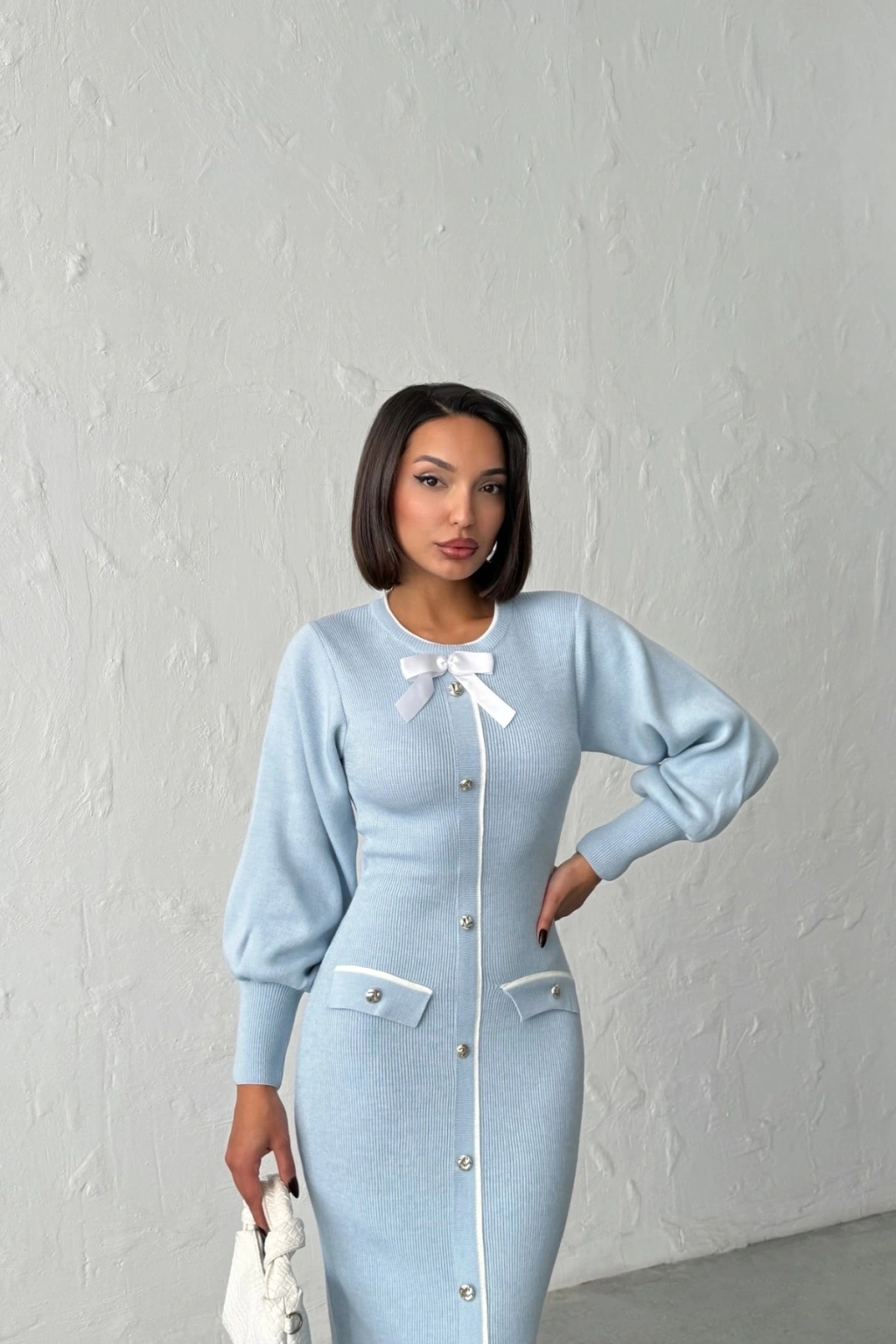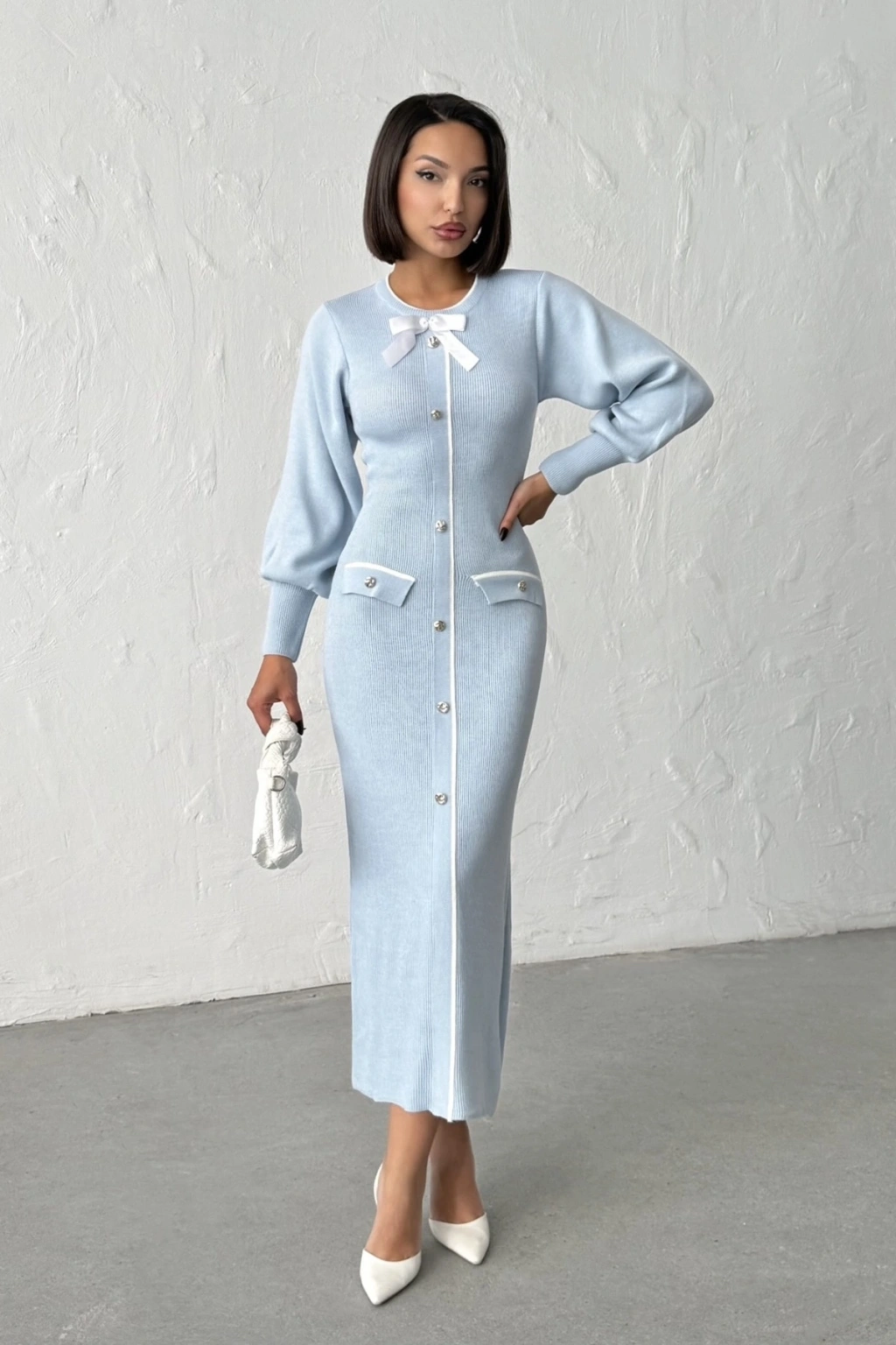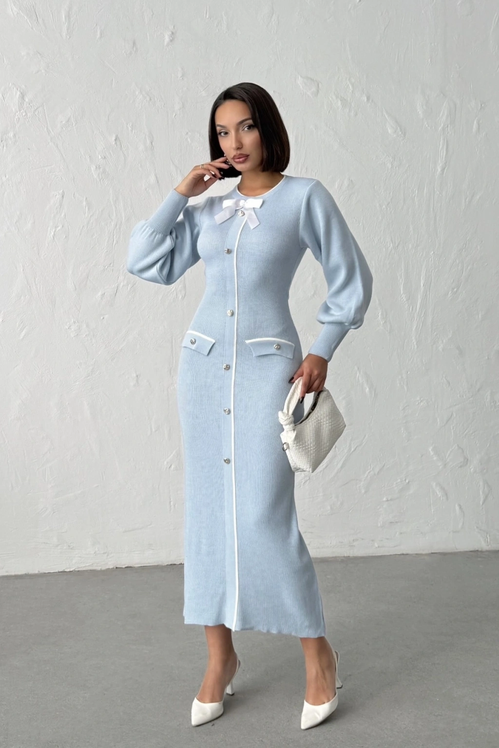 Kadın Mavi Şık Fiyonk Detaylı Balon Kol Triko Elbise