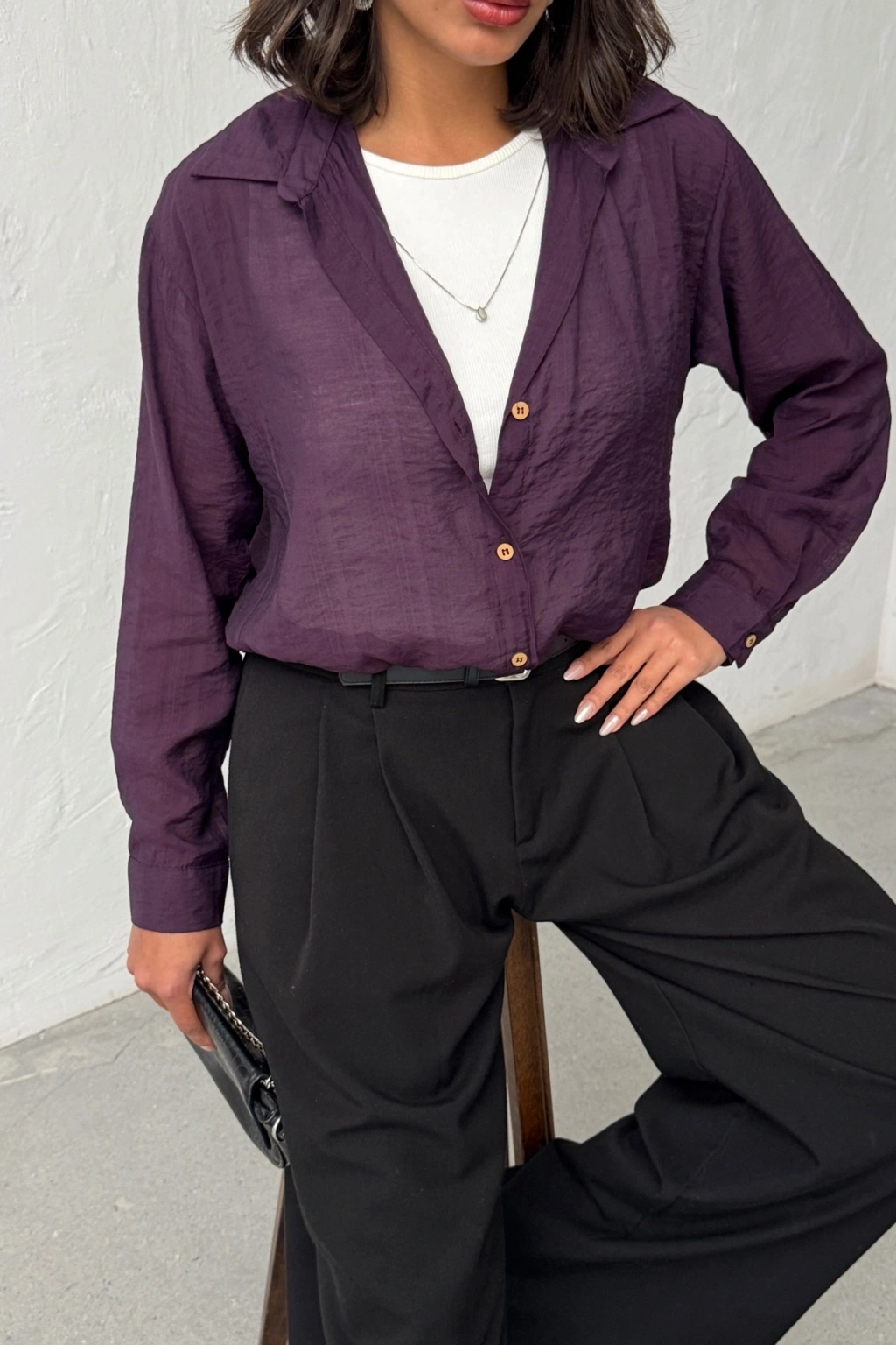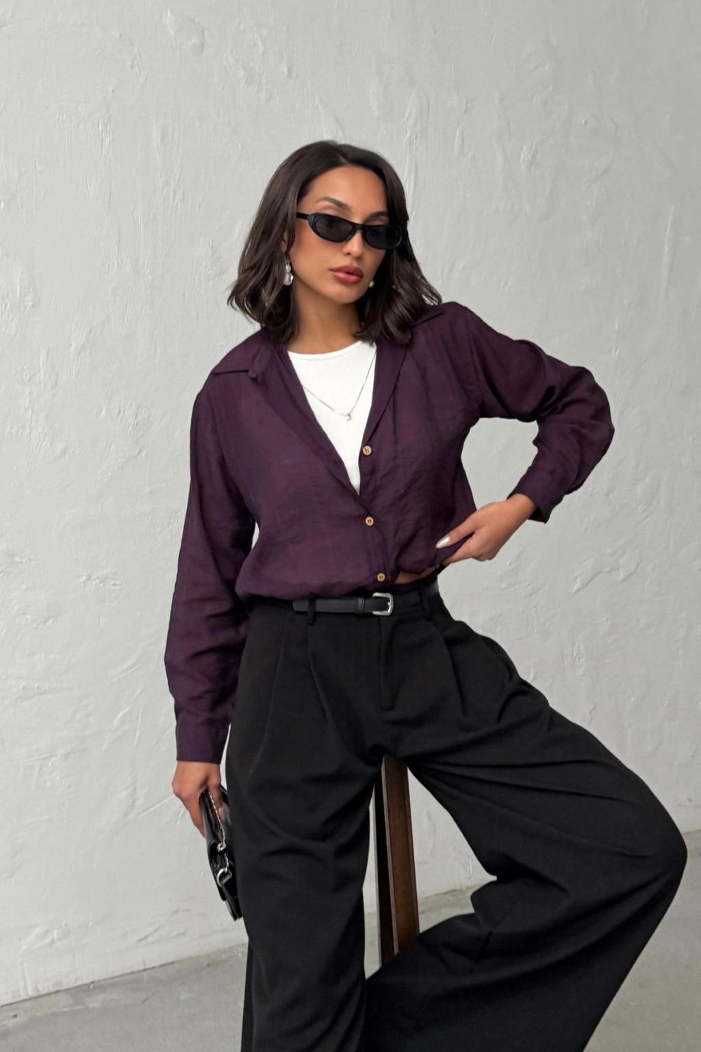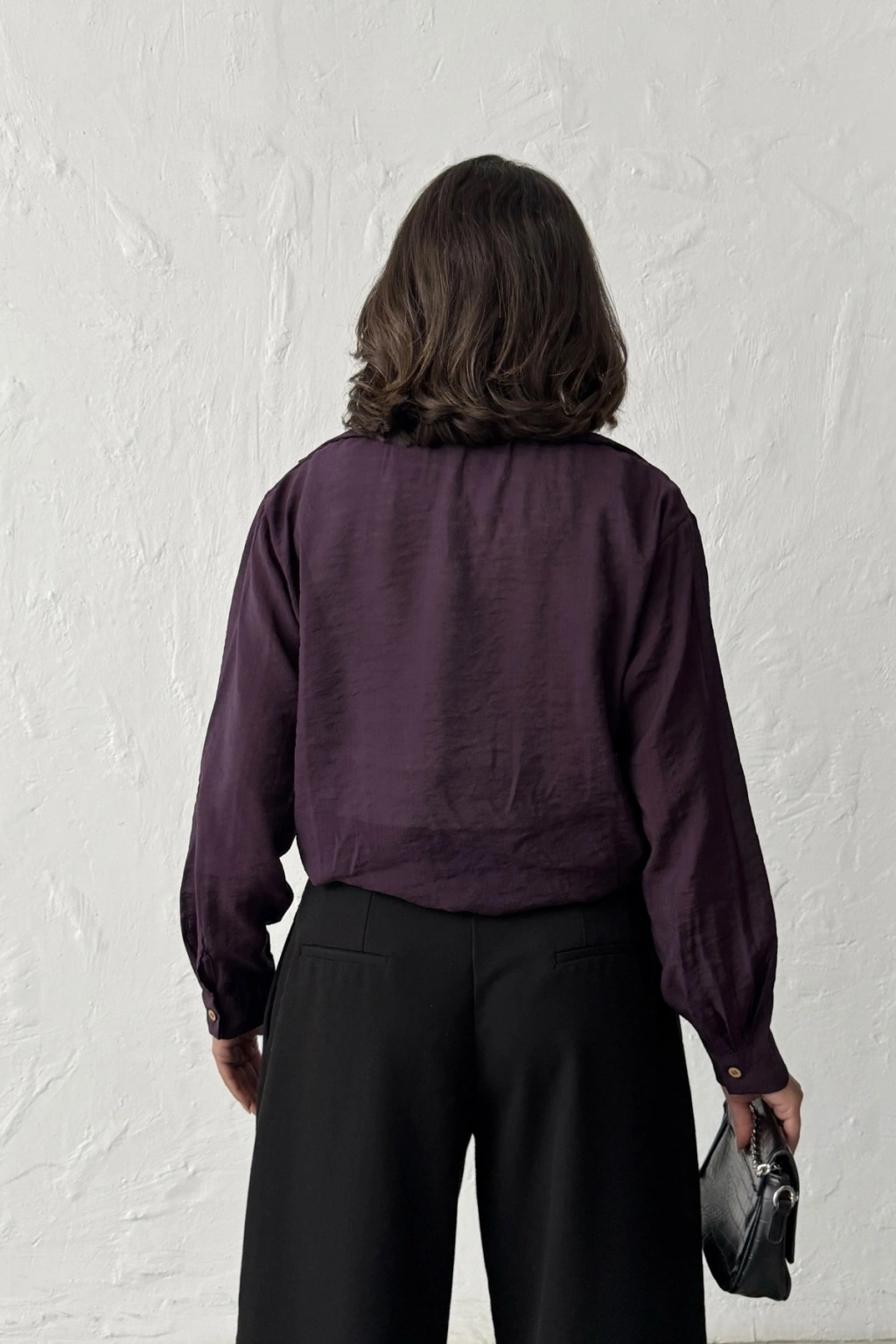 Kadın Cepli Mürdüm Müslin Kumaş Premium Uzun Kol Düz Renk Gömlek