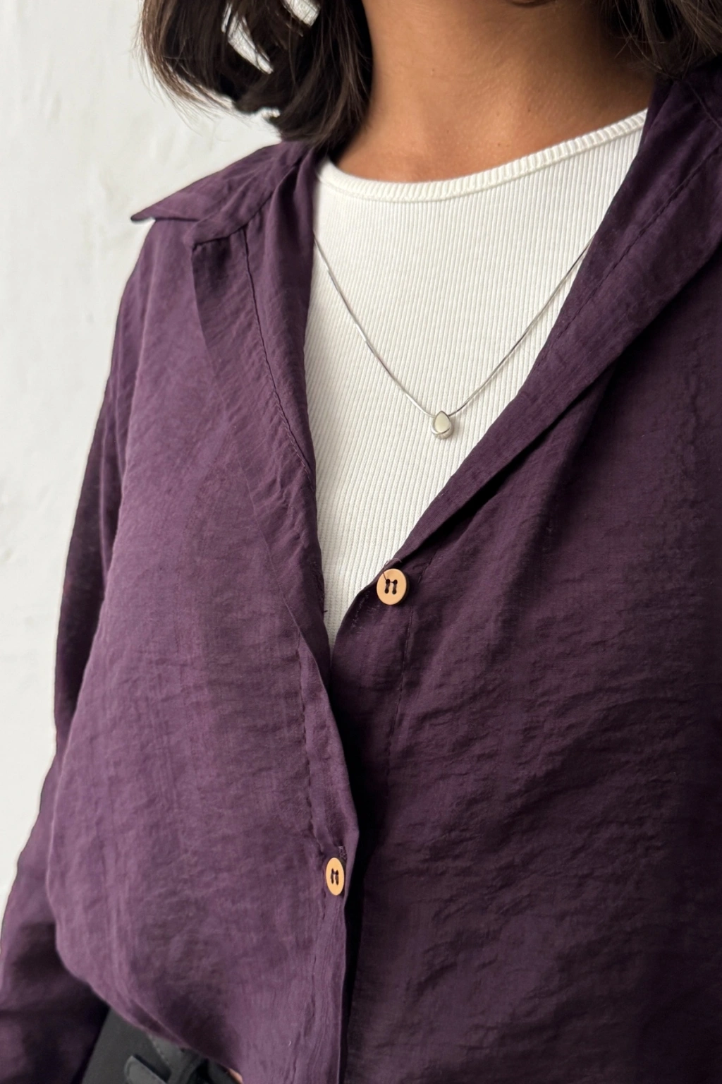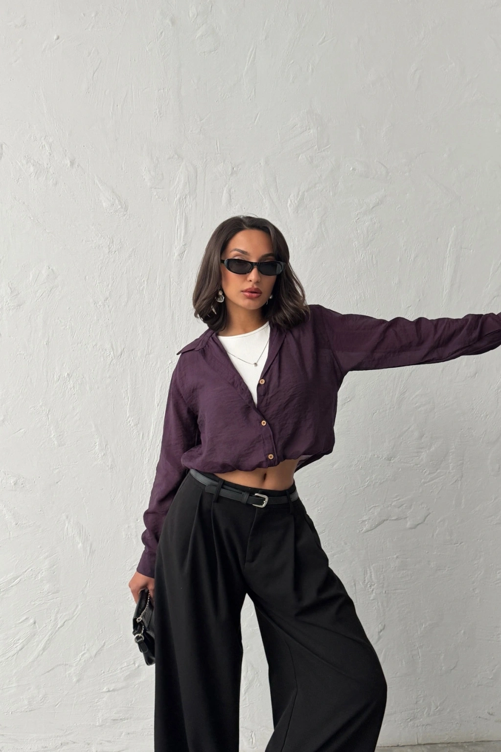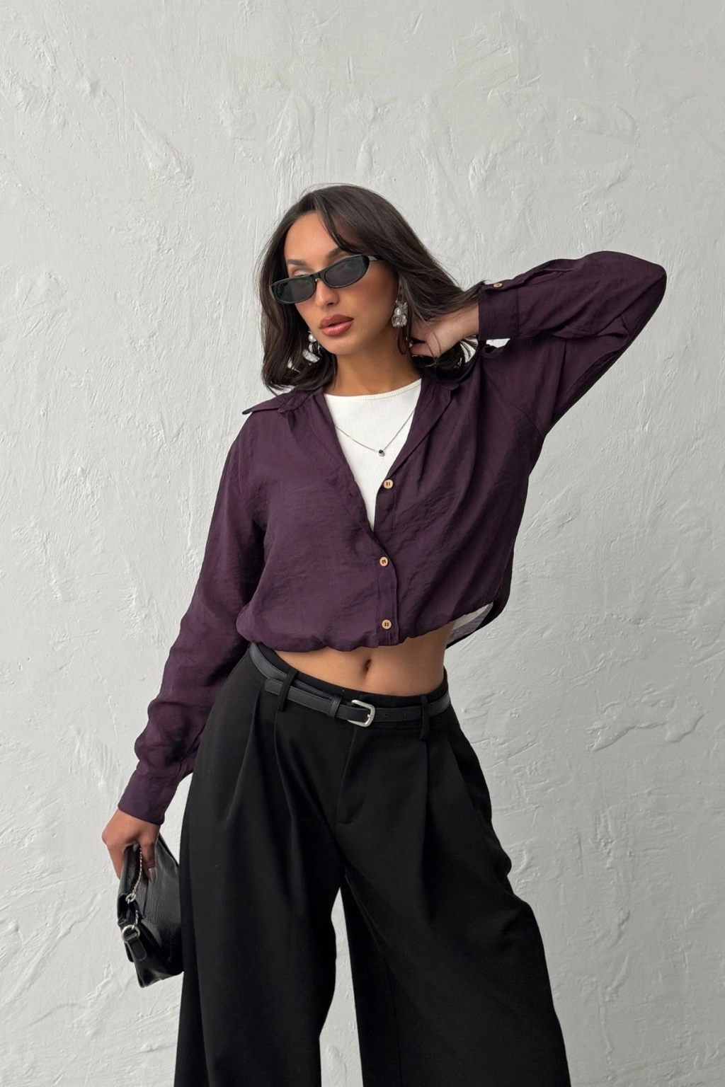 Kadın Cepli Mürdüm Müslin Kumaş Premium Uzun Kol Düz Renk Gömlek