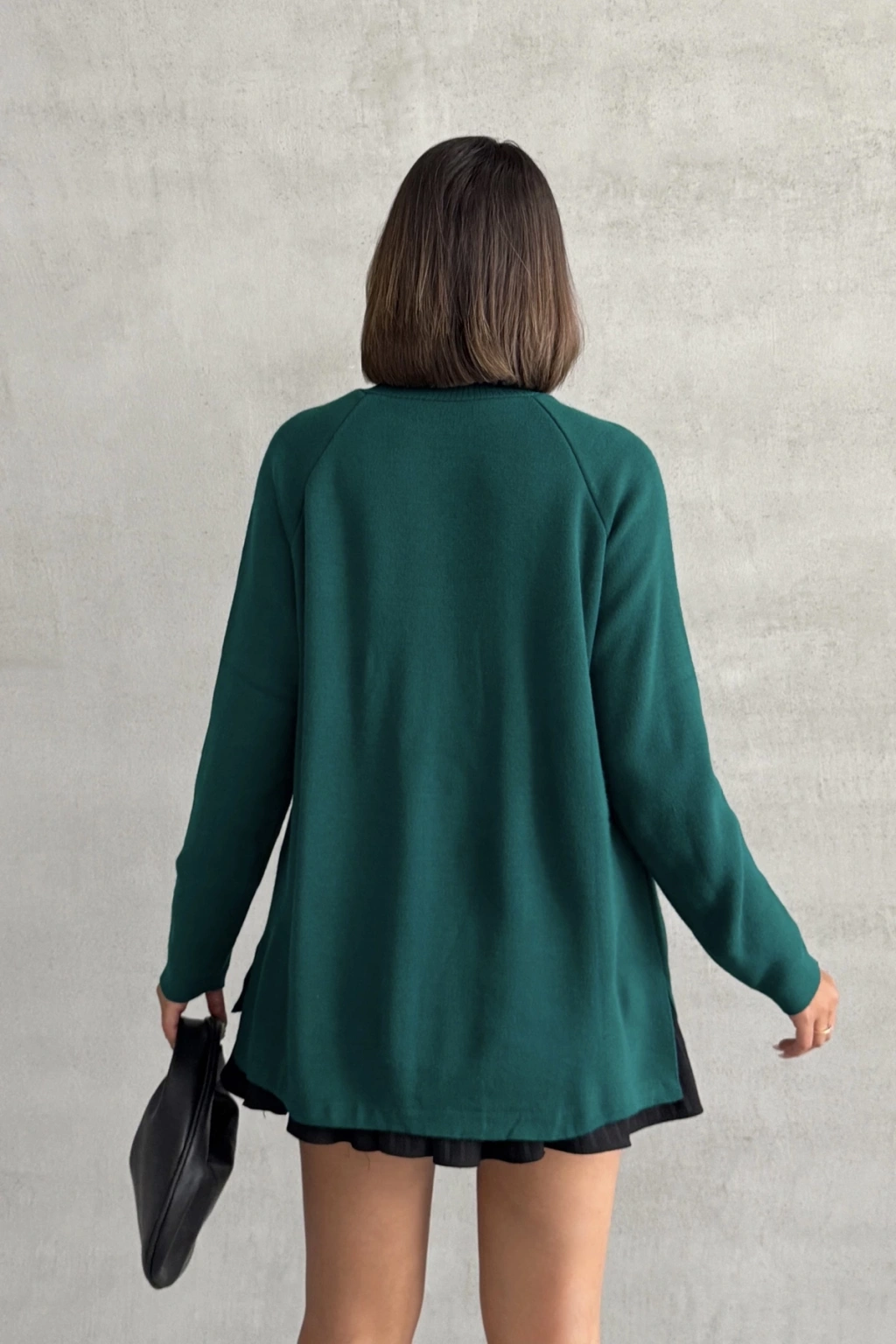 Kadın Nefti Yeşili Şık Şerit Detaylı Uzun Kol Triko Hırka – Zamansız Şıklık, Modern Dokunuşlarla