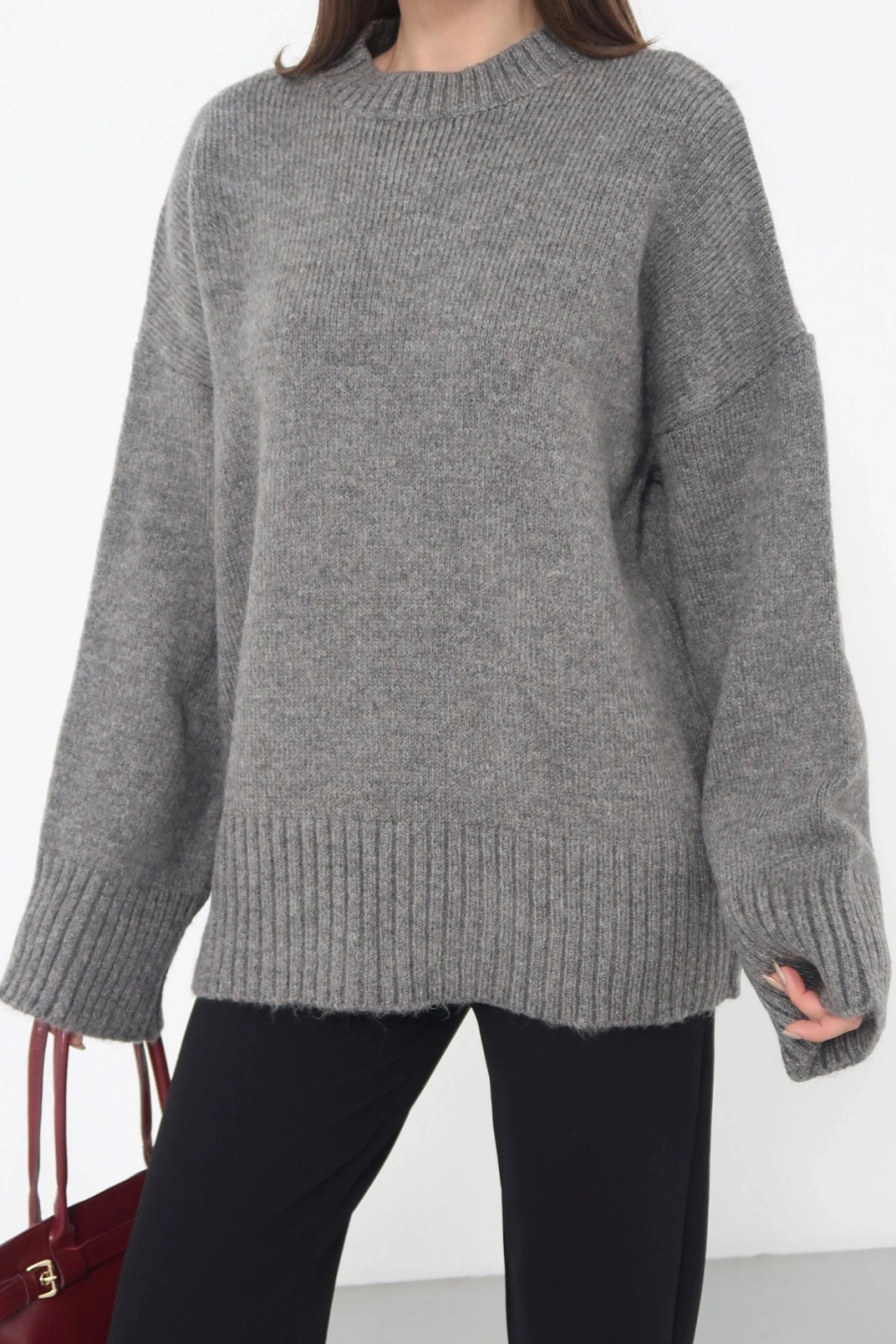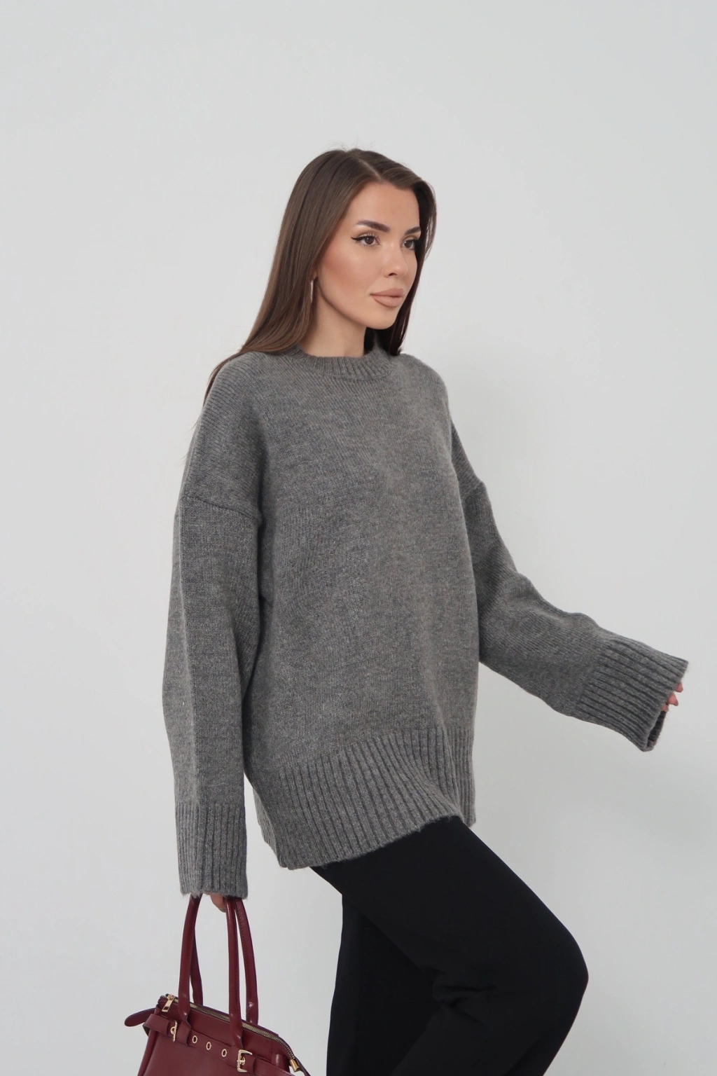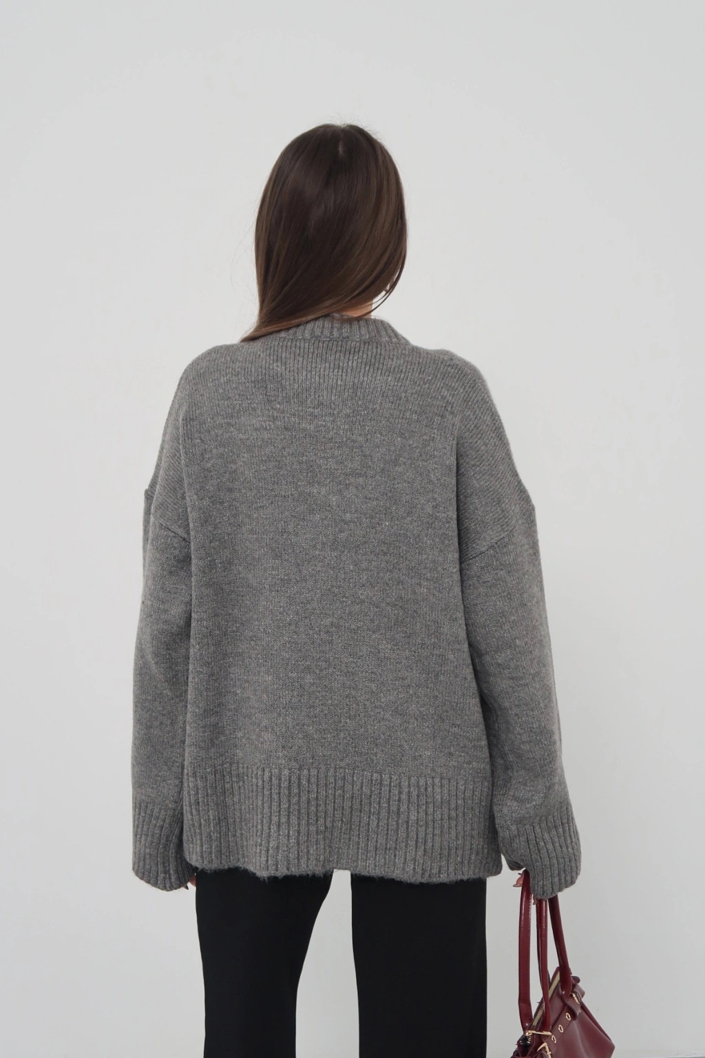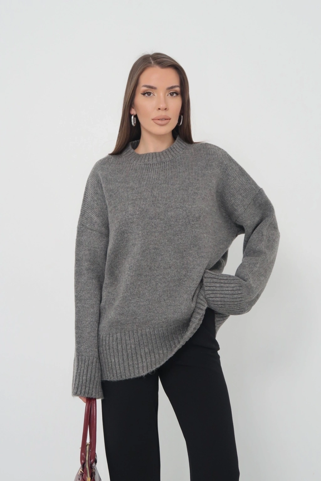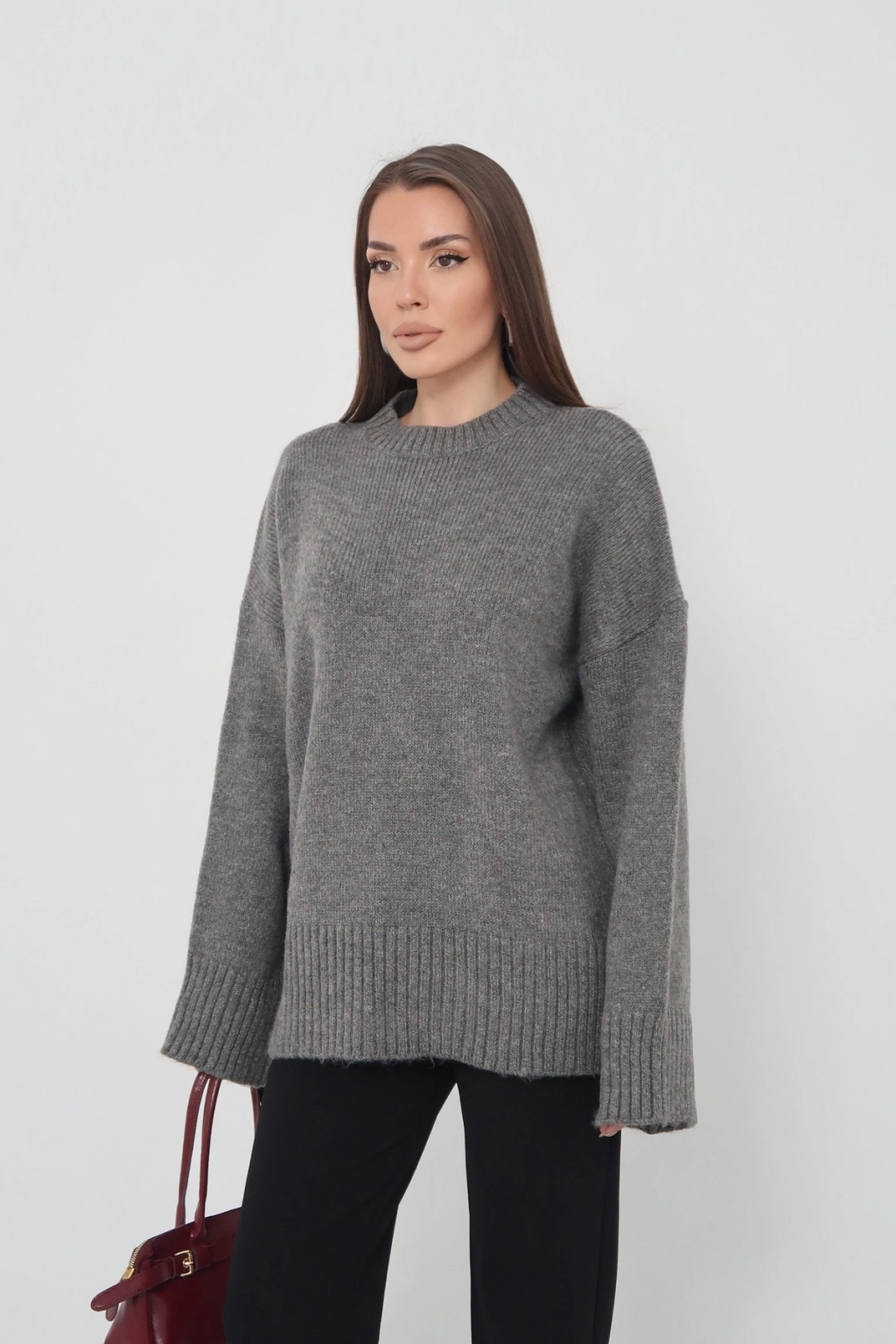 Kadın Oversize Antrasit Bisiklet Yaka Pamuksu Dokulu Triko Kazak