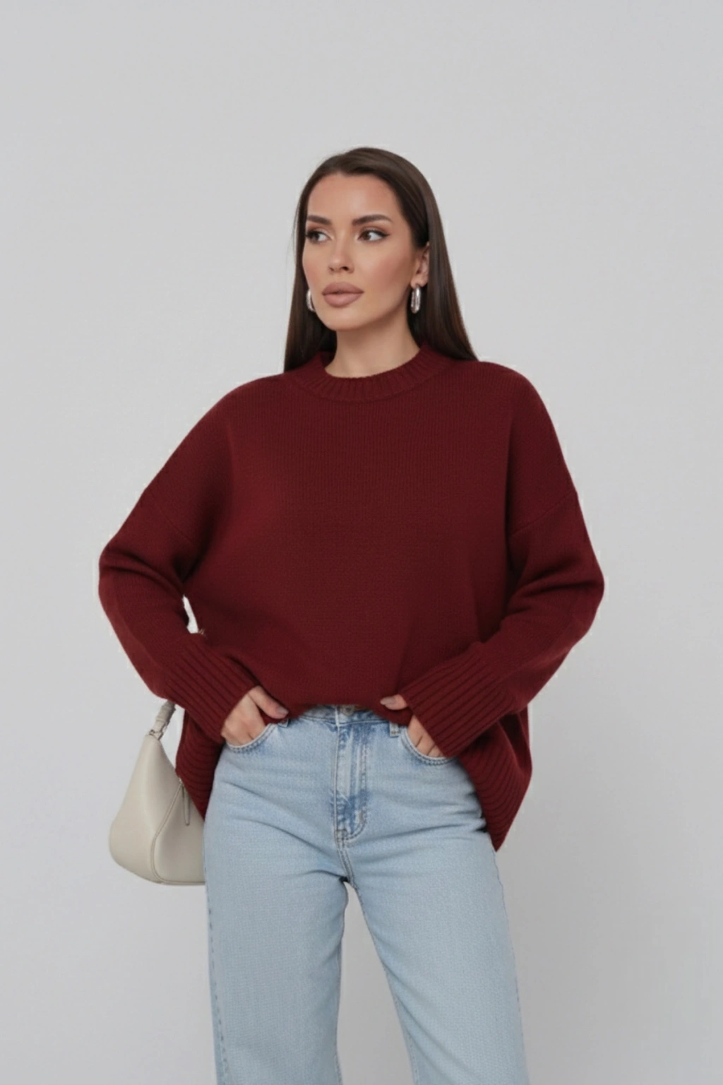 Kadın Oversize Bordo Bisiklet Yaka Pamuksu Dokulu Uzun Kol Triko Kazak