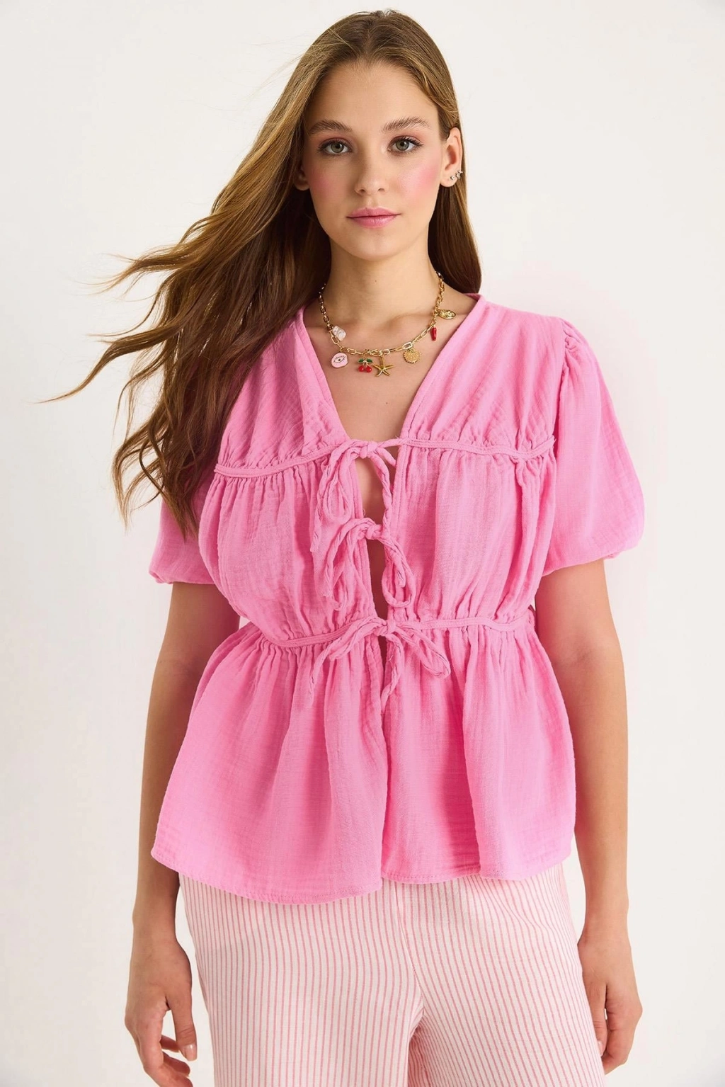 Kadın Şeker Pembe Bohem Tarz Önden Bağlamalı Bebe Yaka Uzun Kol Müslin Bluz