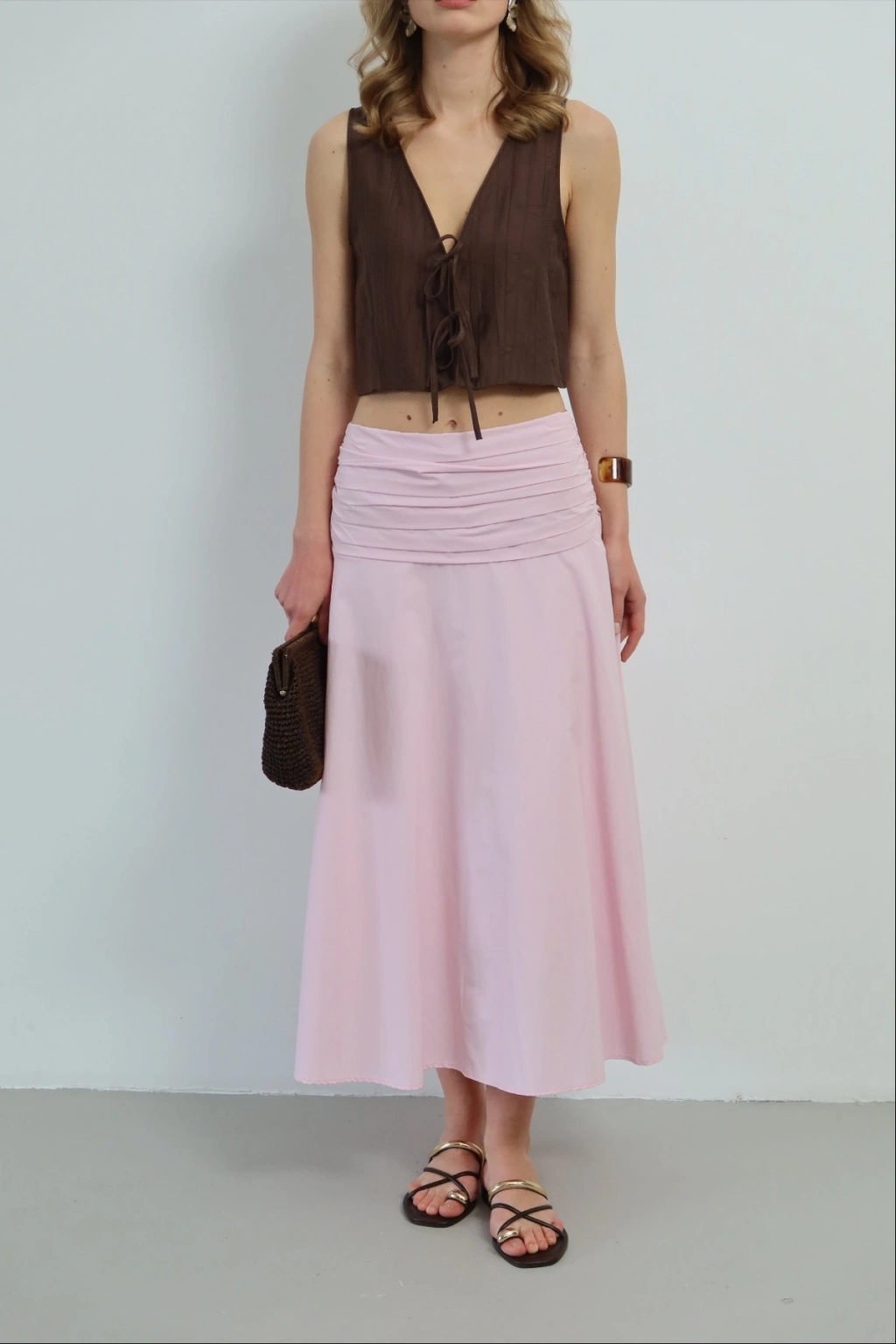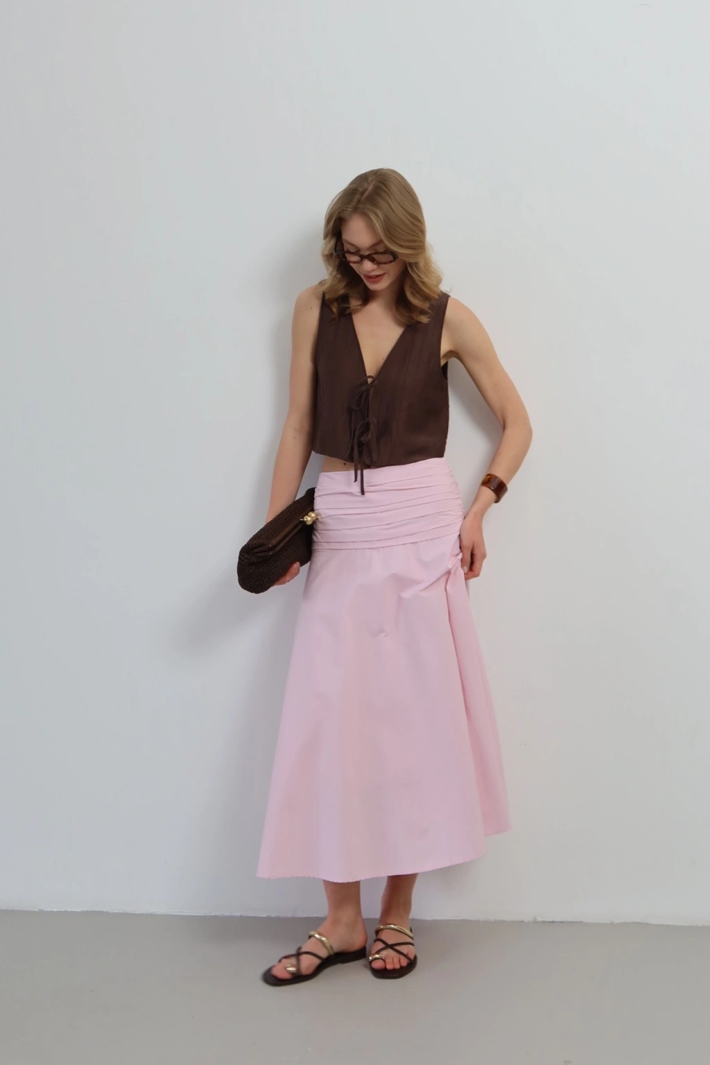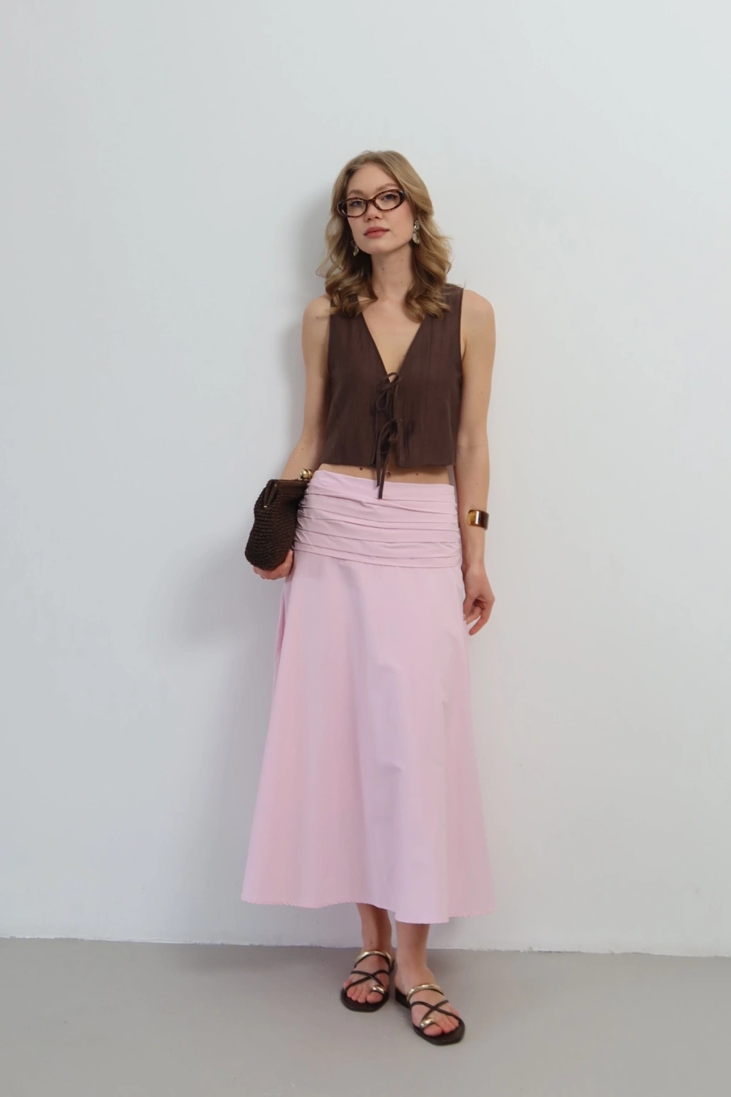 Kadın Pembe Büzgü Detaylı Yüksek Bel Midi Boy Yazlık Etek
