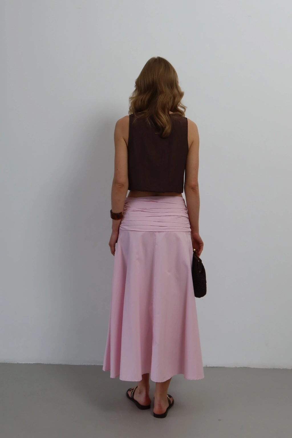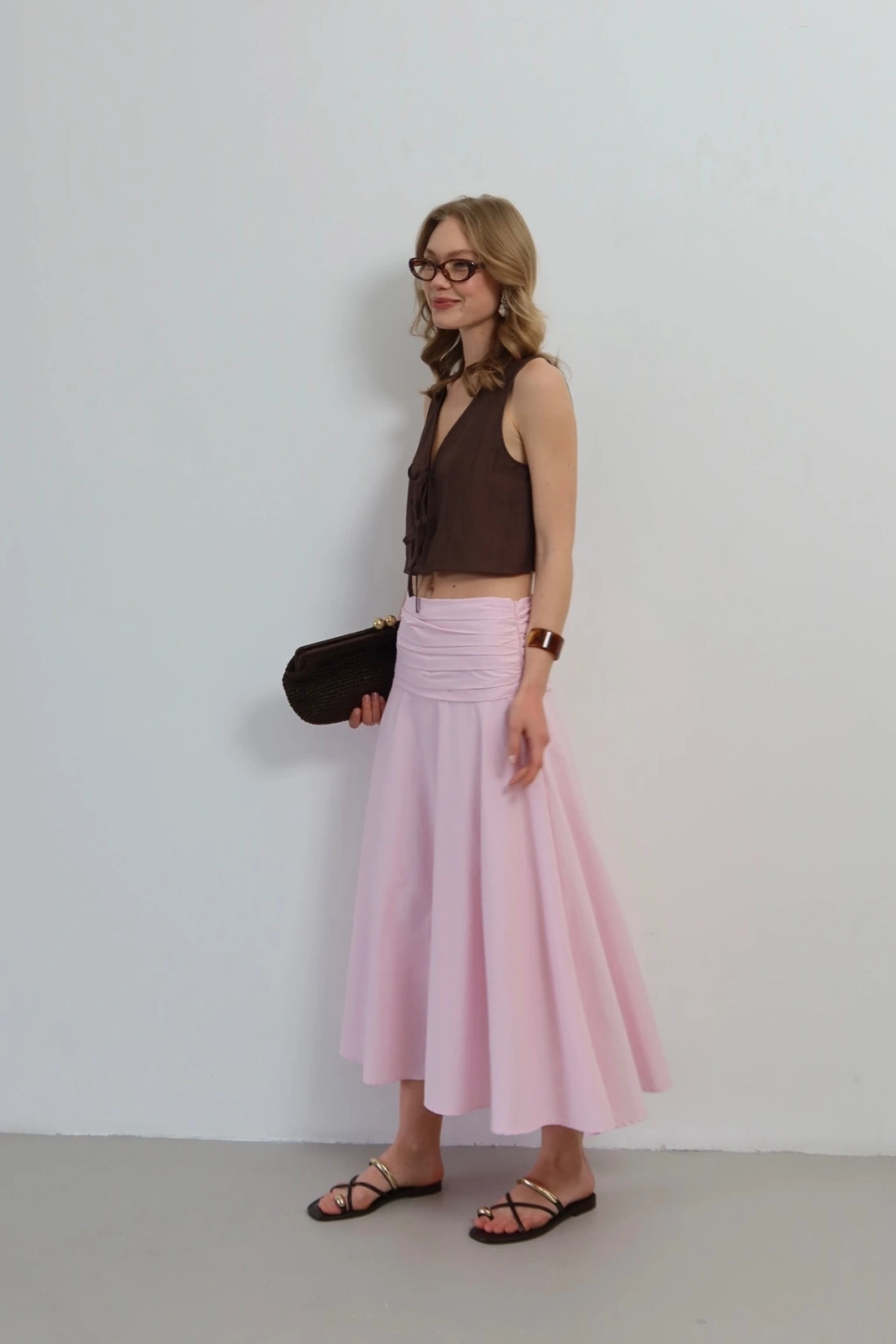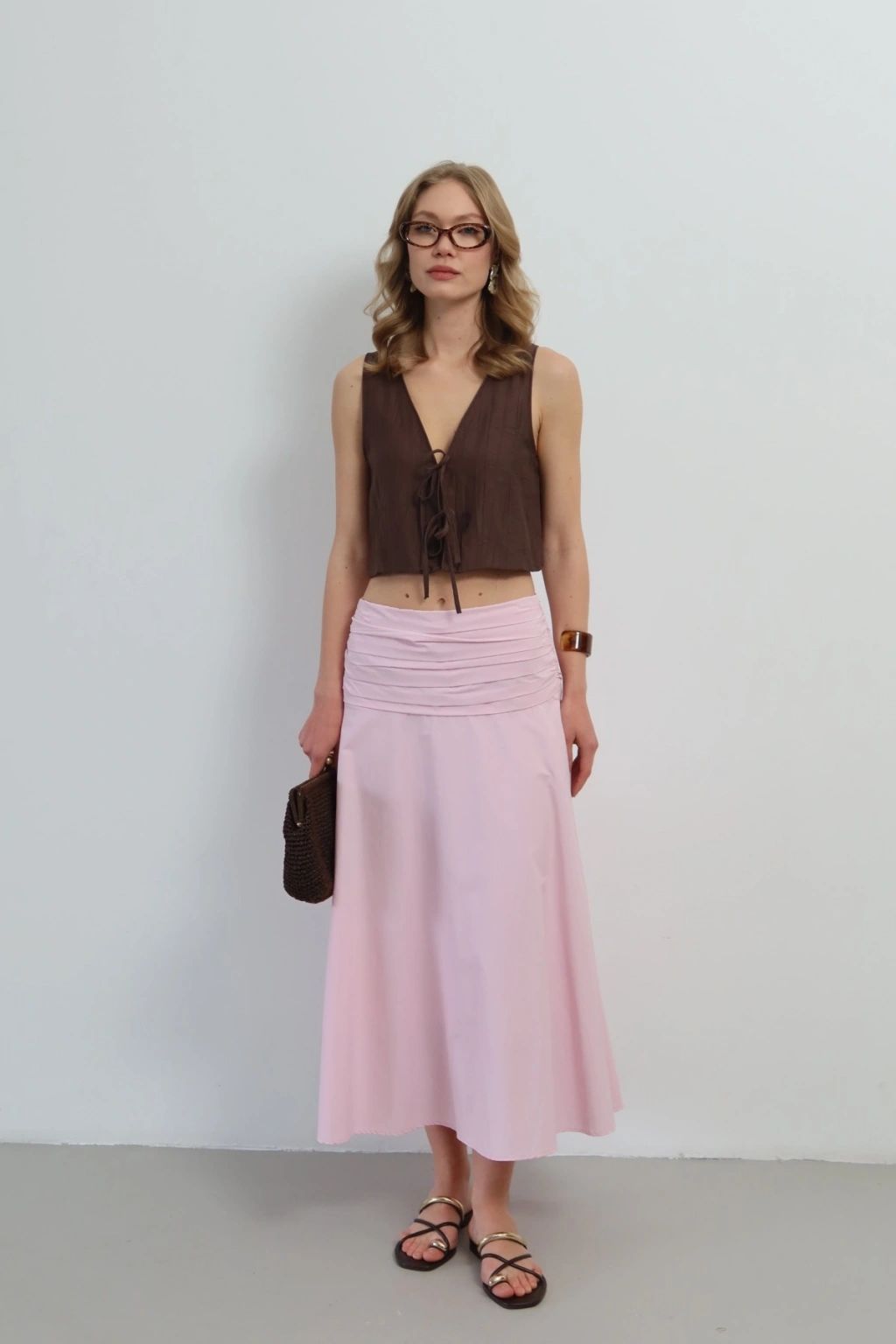 Kadın Pembe Büzgü Detaylı Yüksek Bel Midi Boy Yazlık Etek