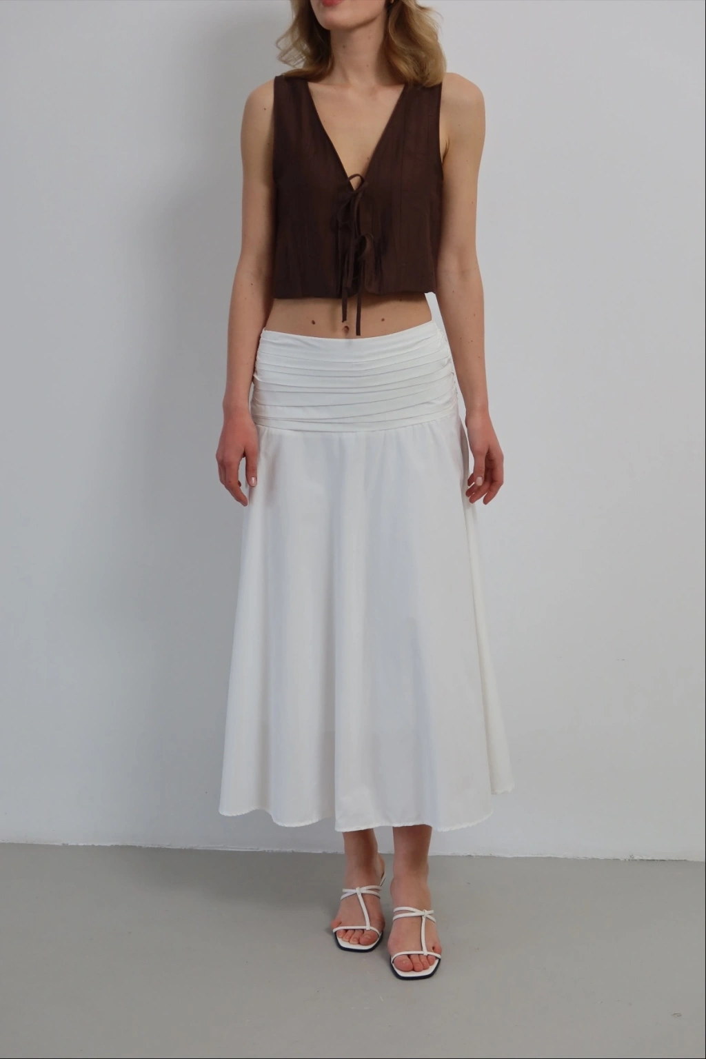 Kadın Beyaz Büzgü Detaylı Yüksek Bel Midi Boy Yazlık Etek