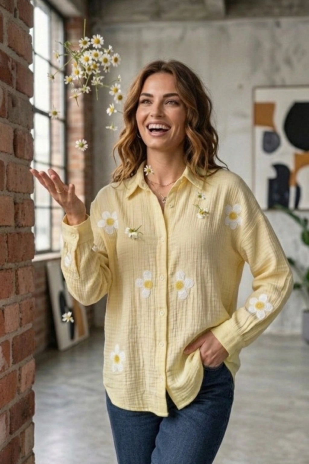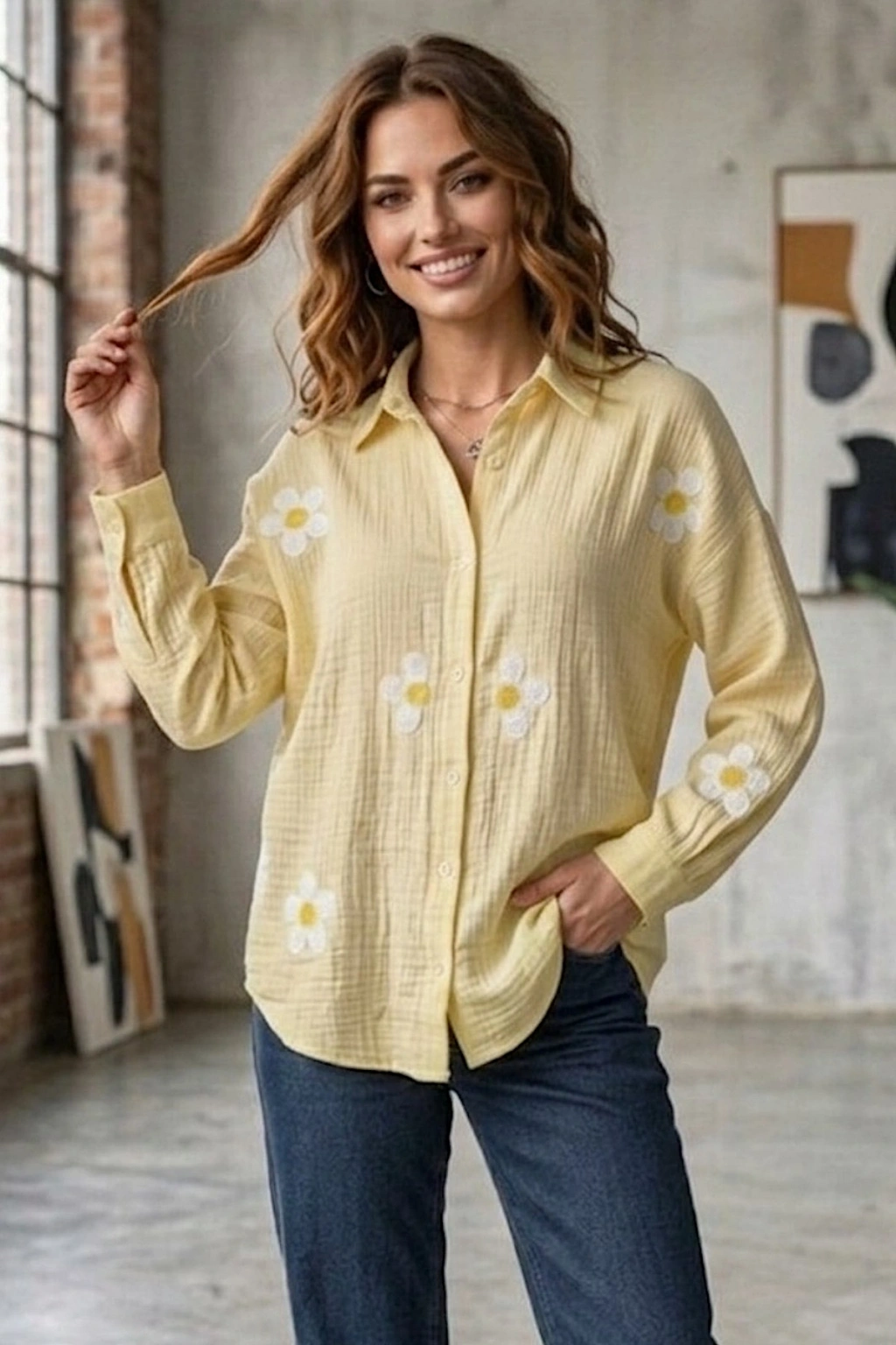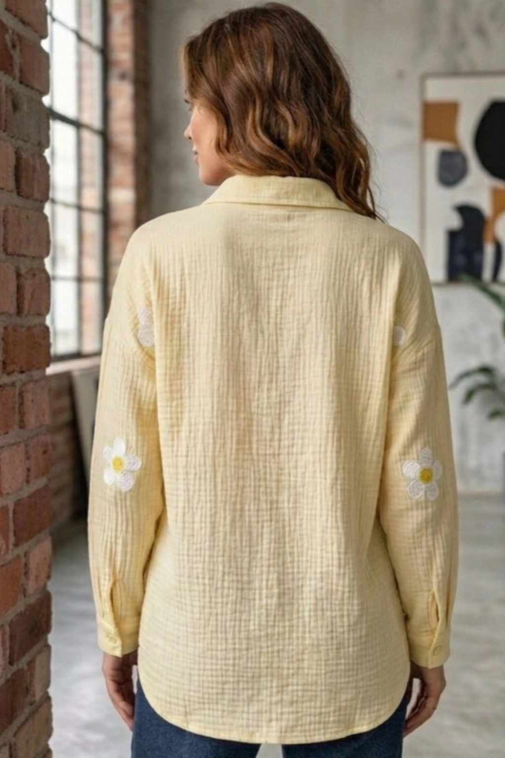 Kadın Yaz Sarısı Papatya Desenli Müslin Kumaş uzun Kollu Oversize Gömlek