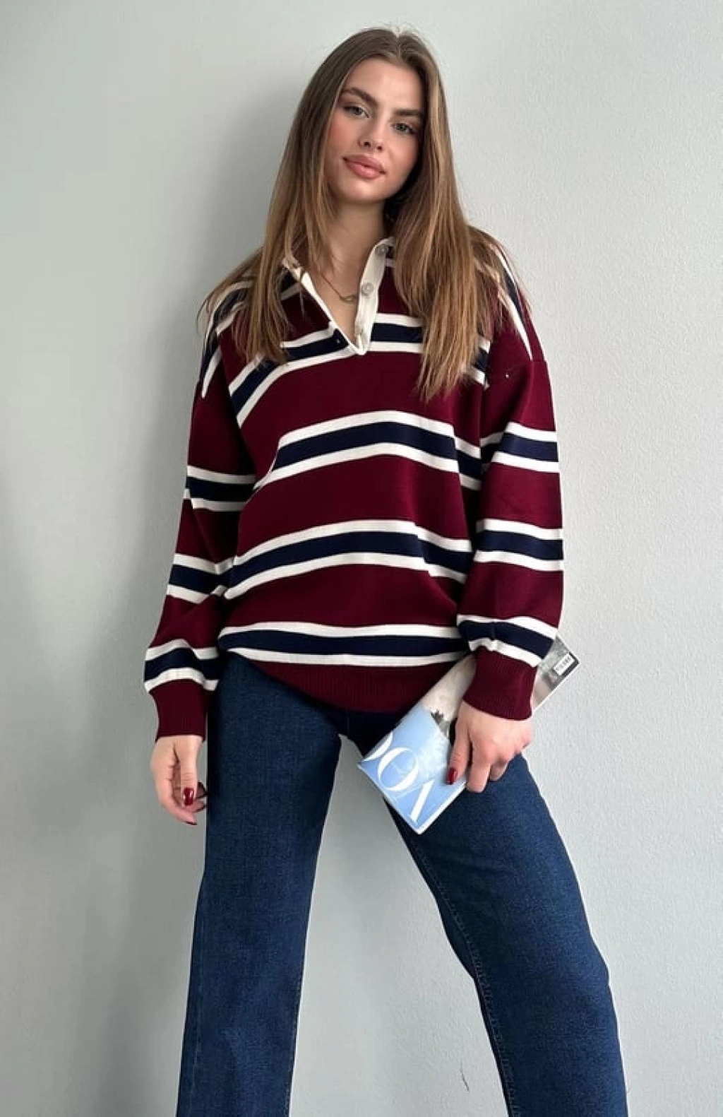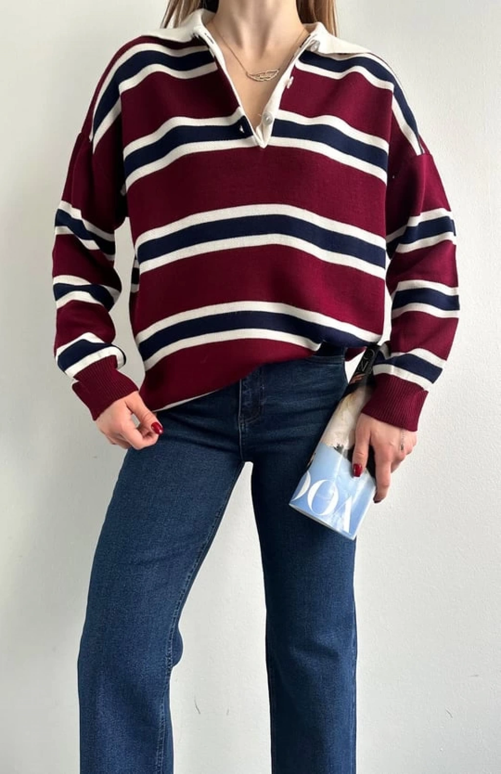 Bu bordo-beyaz-lacivert çizgili kazak, stil sahibi bir görünüm arayanlar için mükemmel bir tercih! Renk bloklarının güçlü kontrastı, dikkat çekici ve enerjik bir duruş sunarken; oversize kesimi modern ve rahat bir tarzın altını çiziyor.