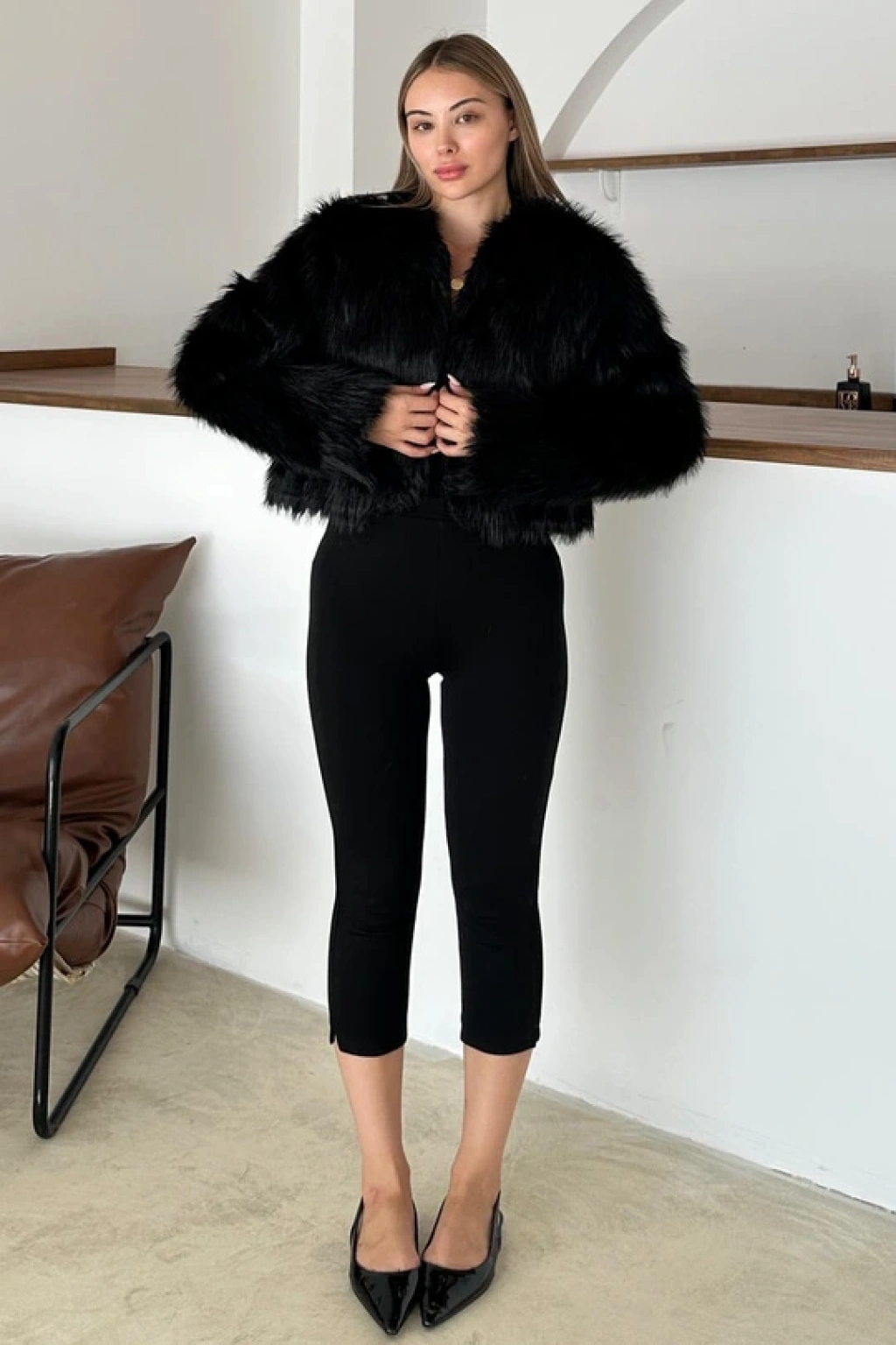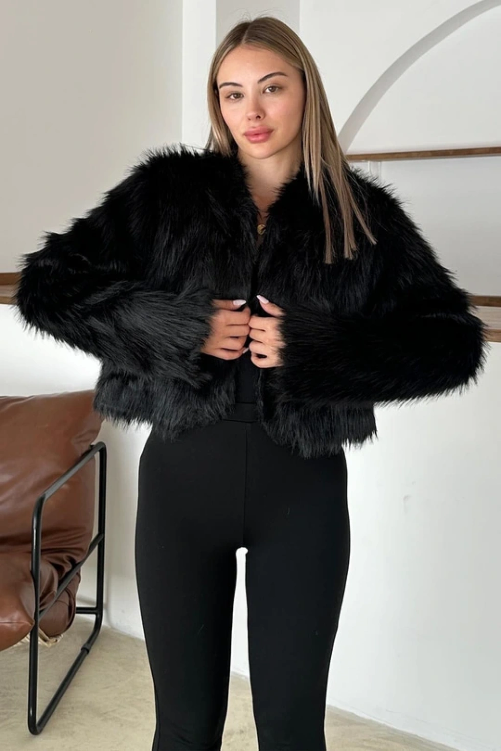 Kadın Siyah Premium Kalite Astarlı Kısa Kürk Ceket