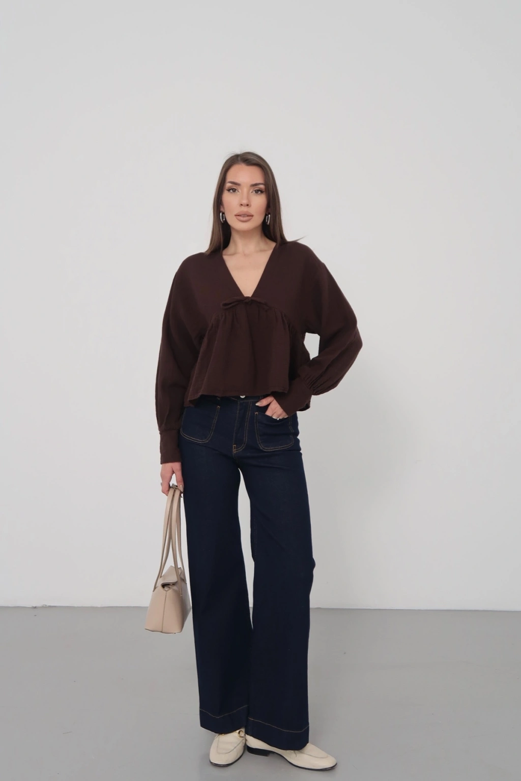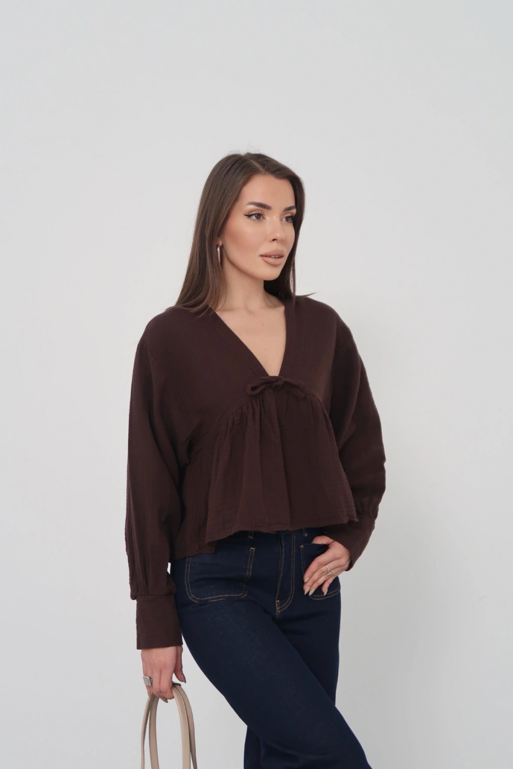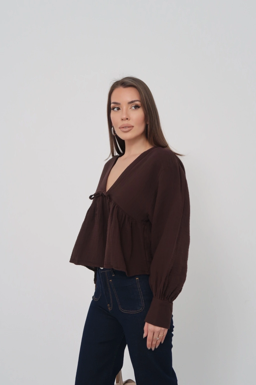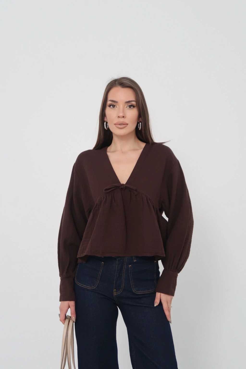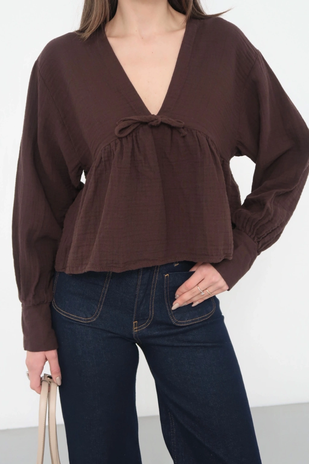 Kadın Acı Kahverengi V Yaka Önü Bağcıklı Salaş Uzun Kollu Bluz